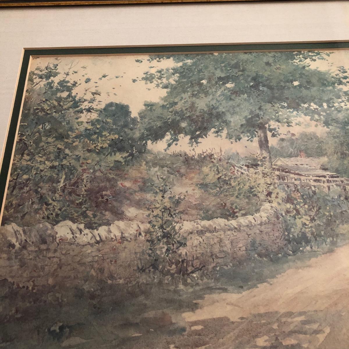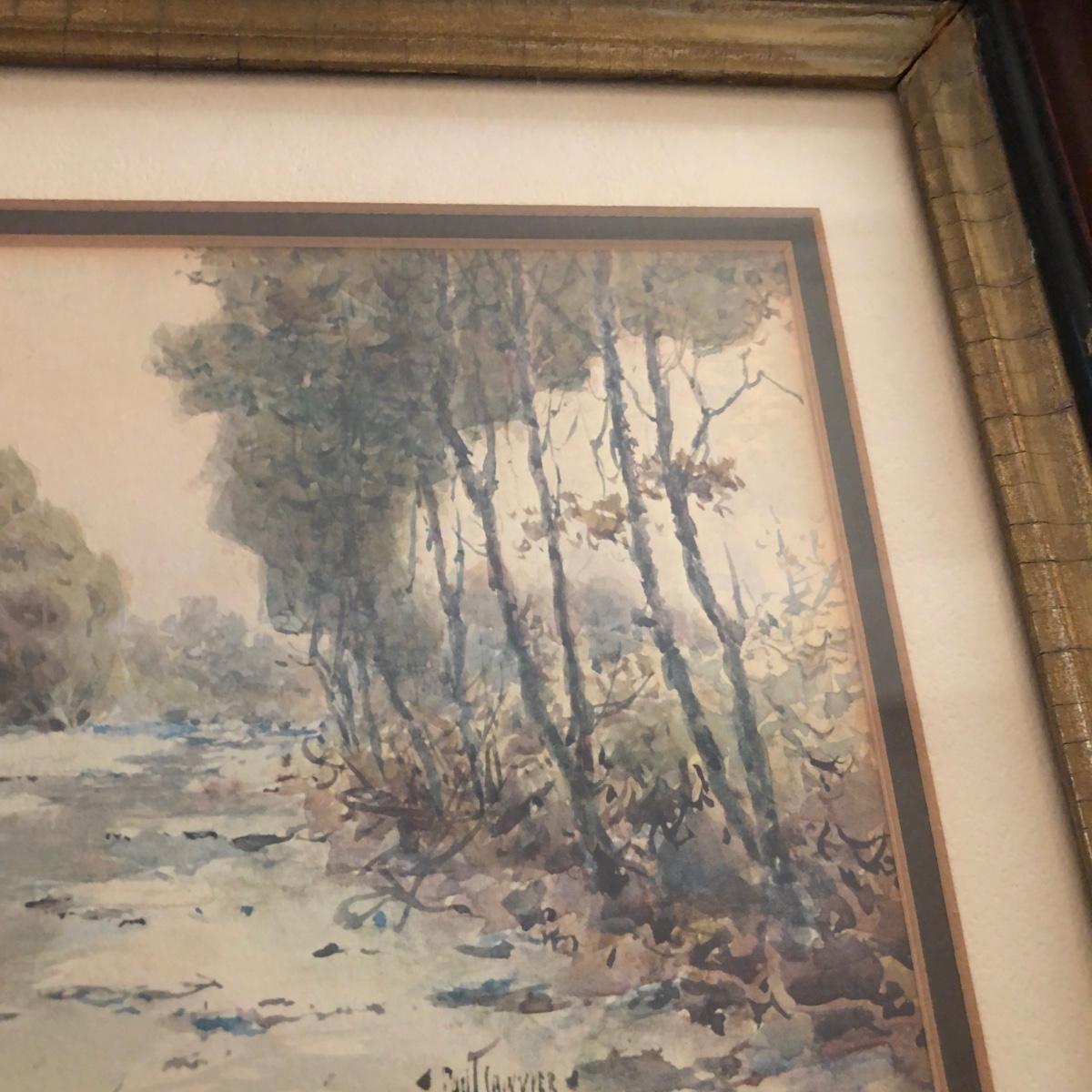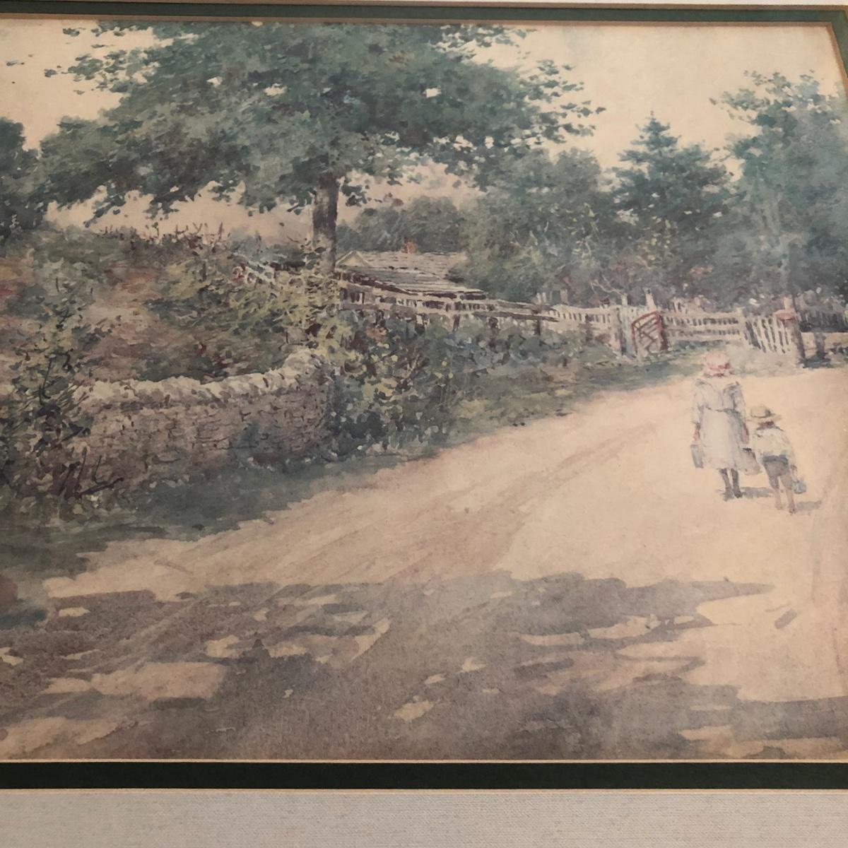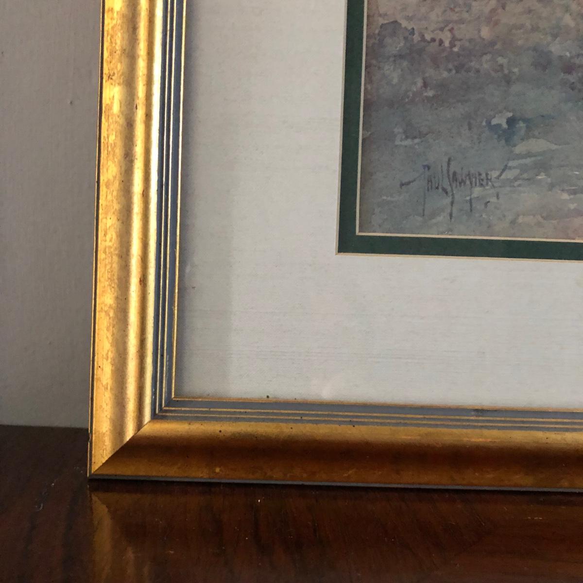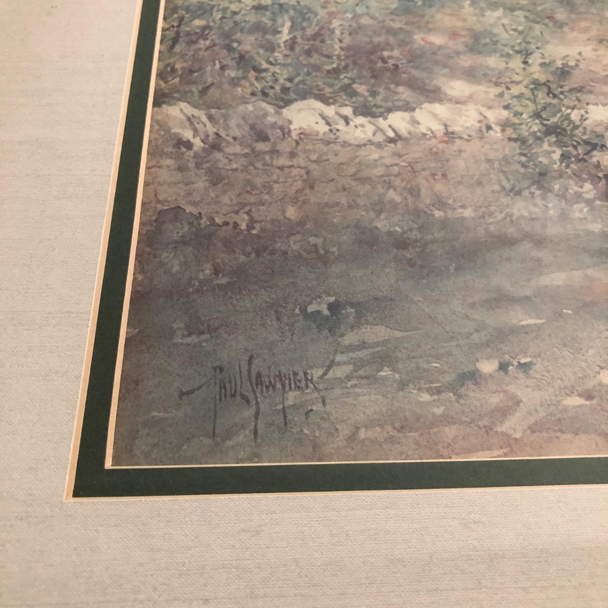 These 2 watercolor landscape prints have gold frames and the signature of Paul Sawyier. The larger print has Authentication paperwork attached to the back as pictured and is titled “Berry Pickin’”. “Berry Pickin’” is 20” x 16” x 1” and shows a young girl and boy walking down a dirt road in the country holding small baskets. The smaller print is 20” x 11” x 1” and features a partially frozen lake in winter with trees missing their leaves along the shore. Shipping available. Shipping art can be costly. Please contact the local UPS store to get a shipping quote.