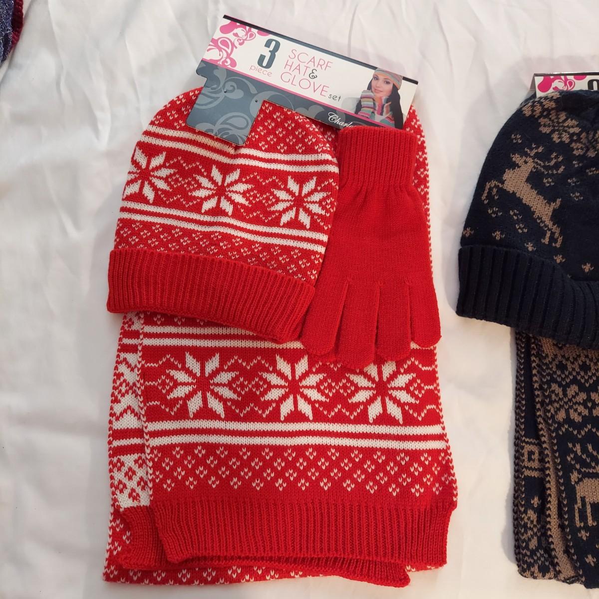 Lot includes Winter accessories like several pairs of gloves, hats and scarves. As well as two Winter wear sets that are new with tags. The purple and red scarf measures 7” x 66” long. Please see photos for details. Shipping available