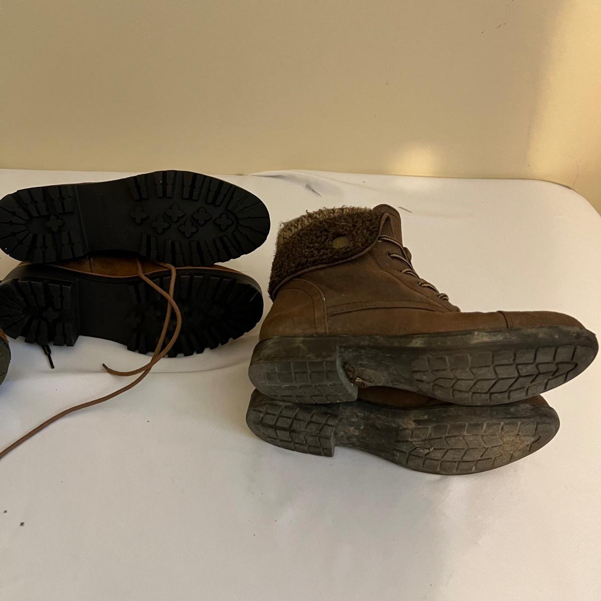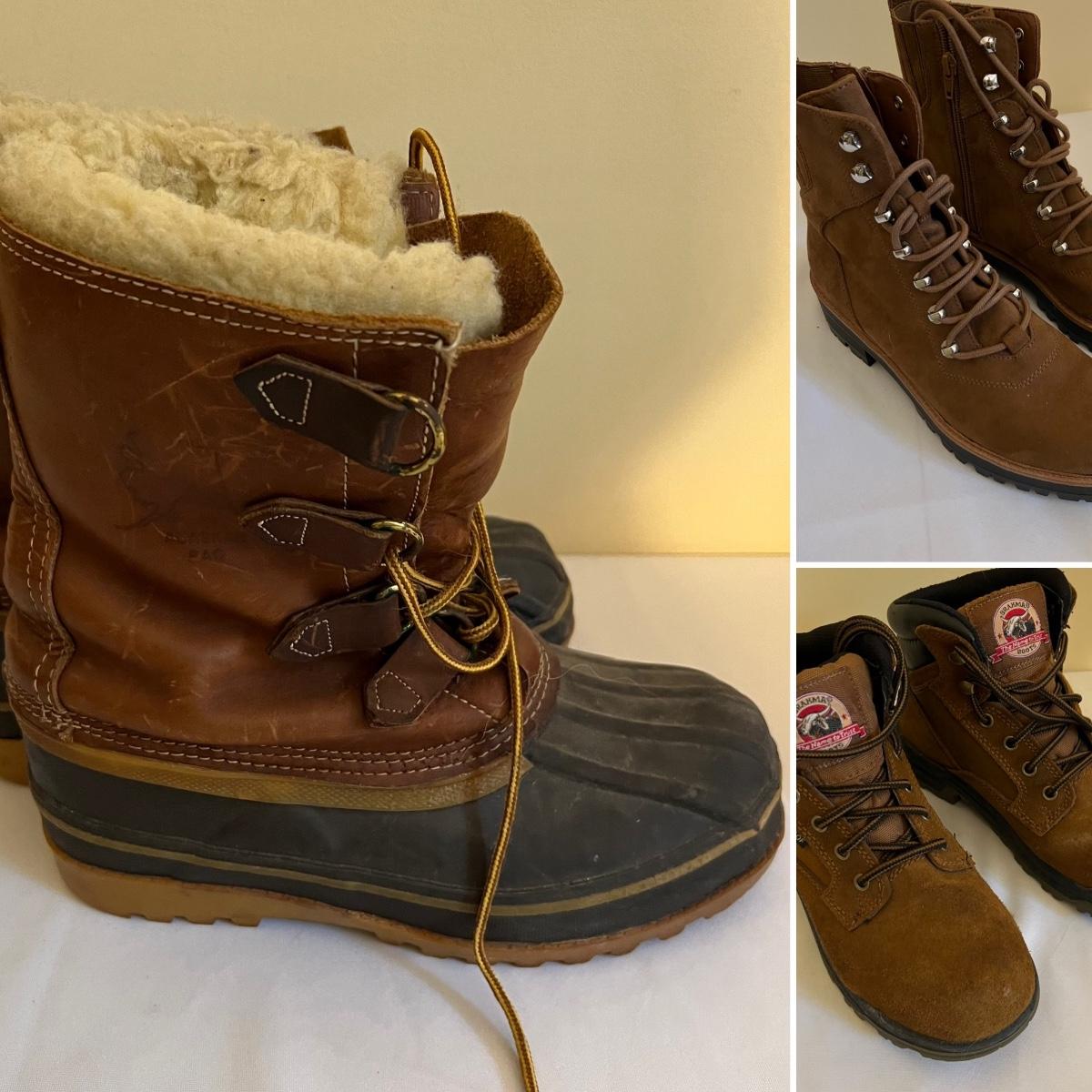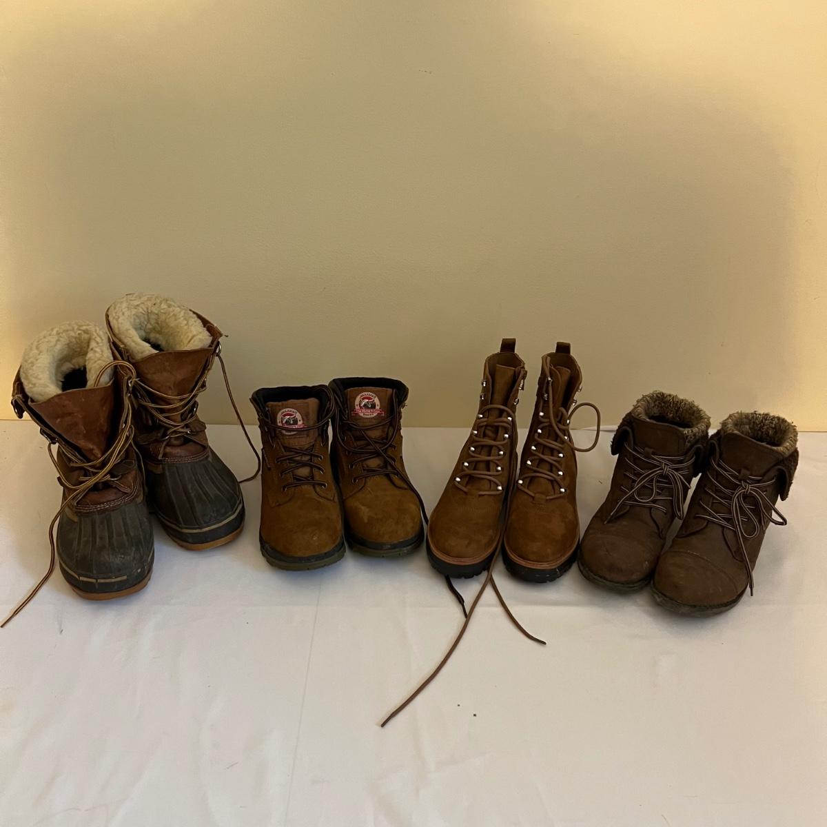 Four pairs of women’s size 8 boots. Some have no size labels but all appear to be 8. The Duck boots are good quality, appear to be leather tops but no brand found; they come with felt/wool inserts.