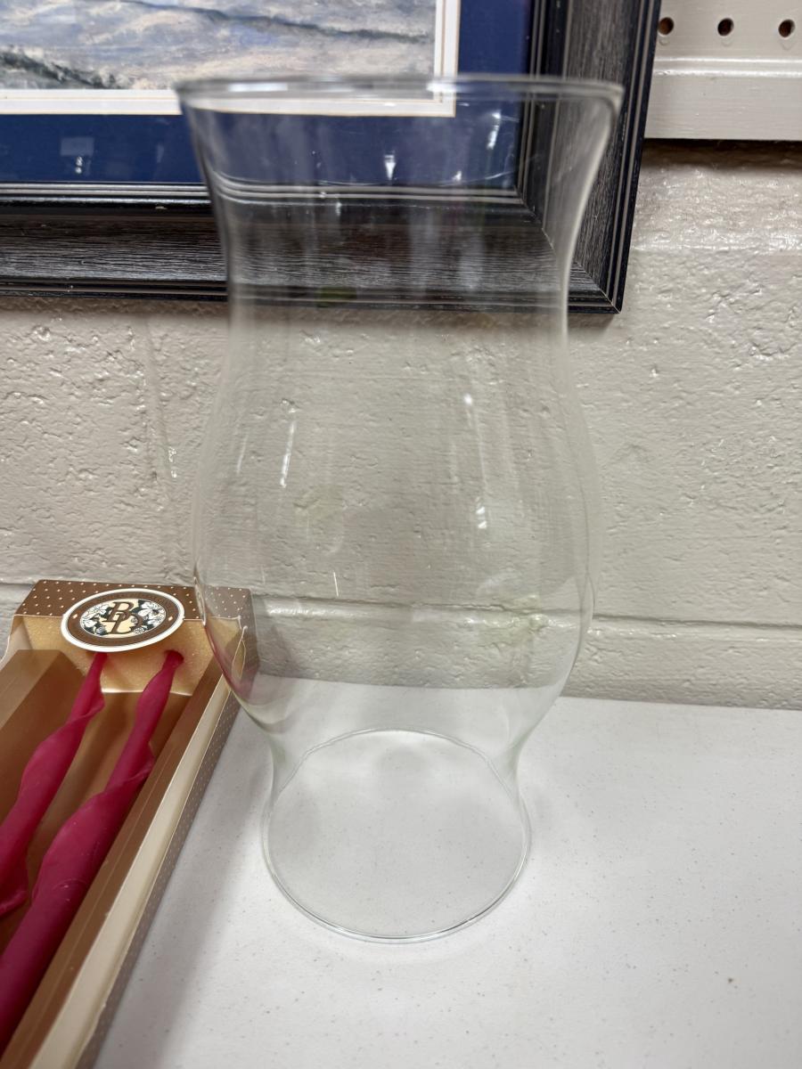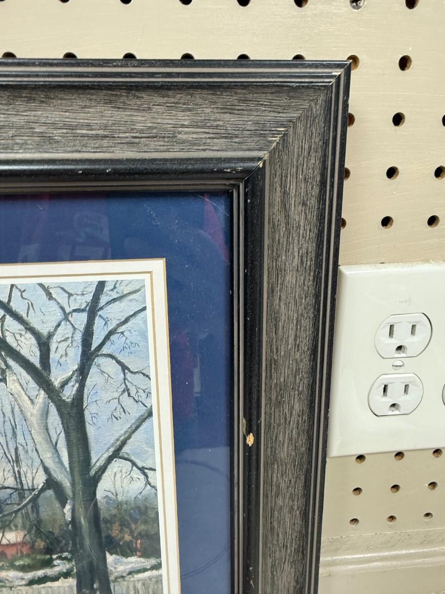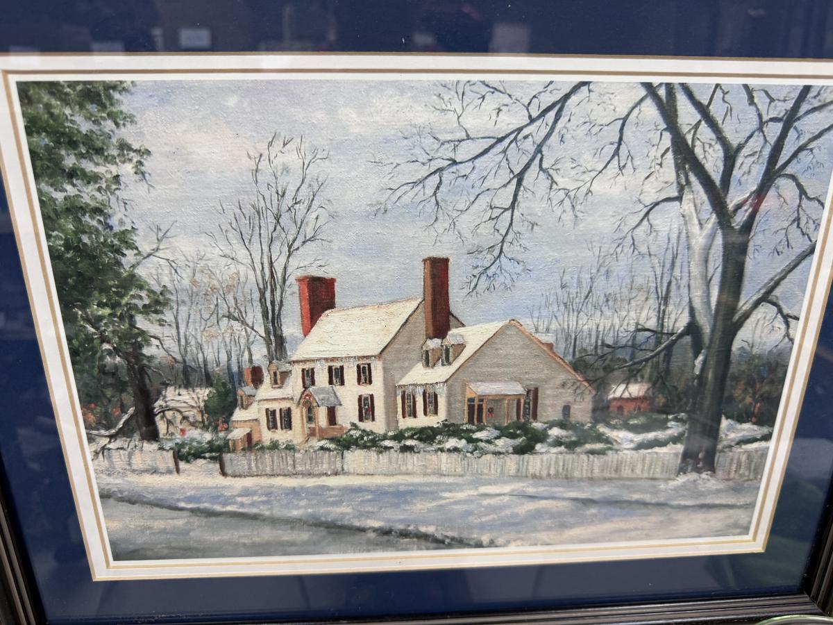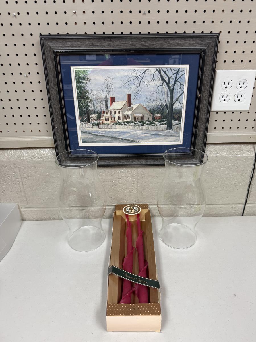 Framed winter print, (nicks on frame) 2 candle globes, designer candle sticks