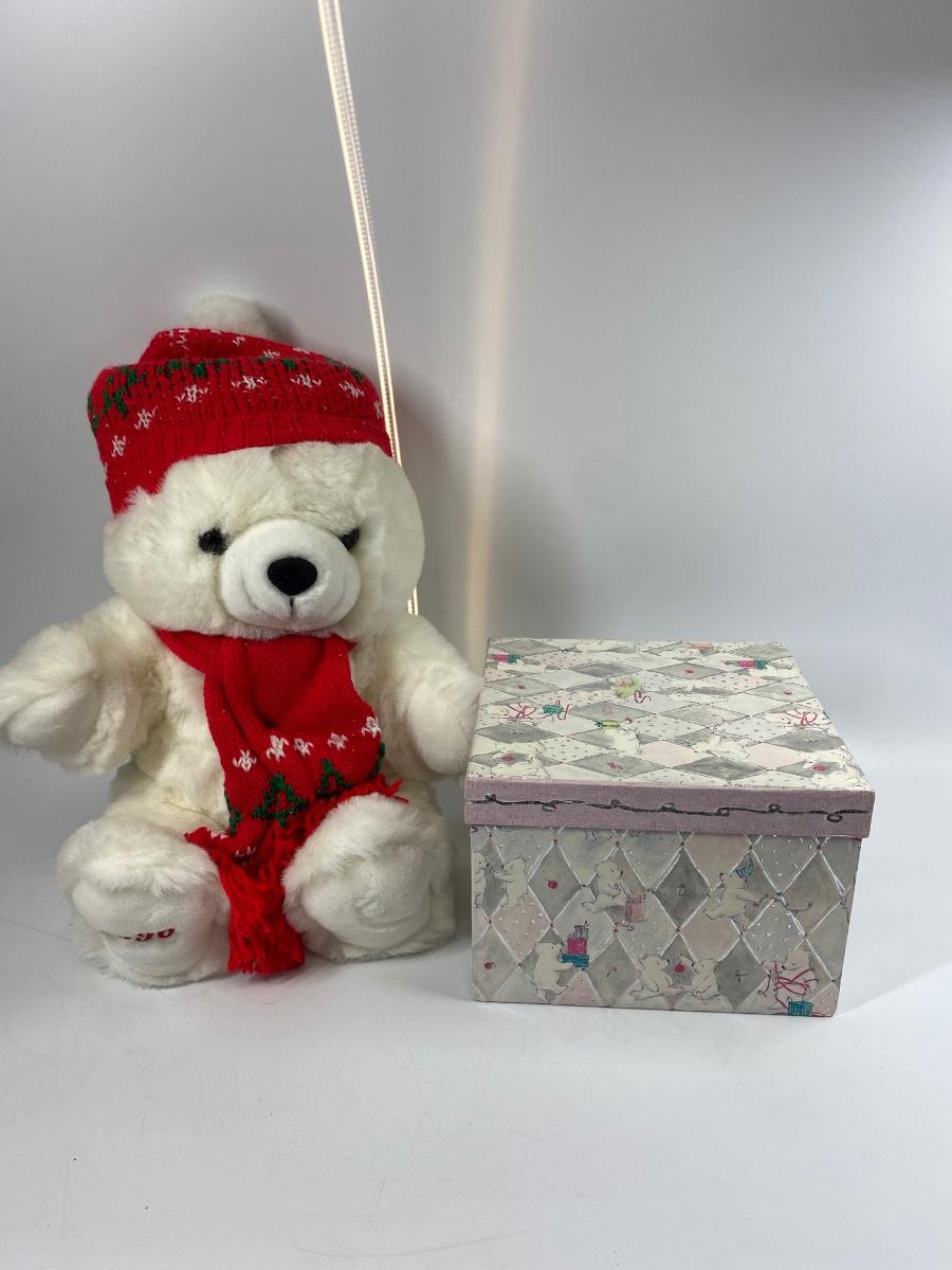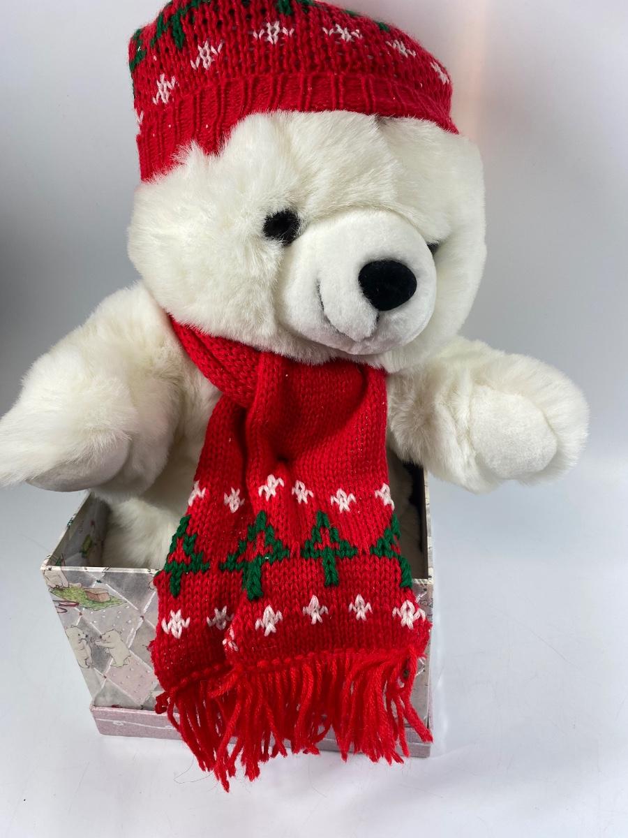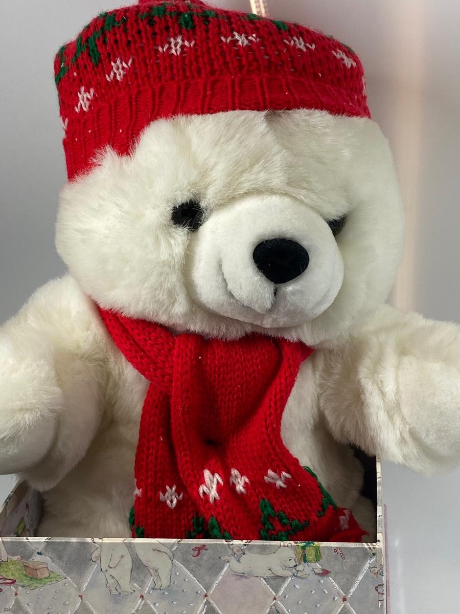 Winter holiday polar bear plush wearing beanie and scarf. Included with bear is a polar bear themed sturdy holiday gift/storage box. Both are in good condition.