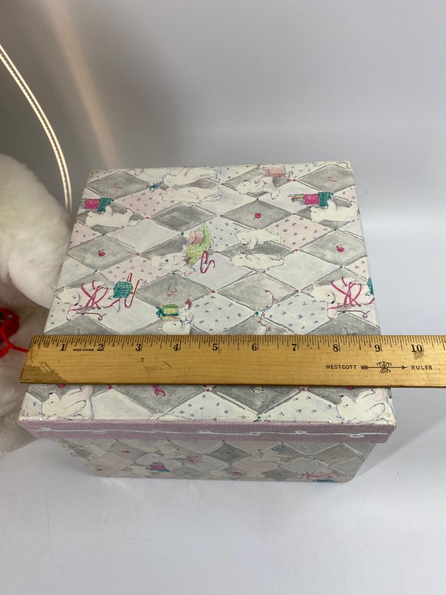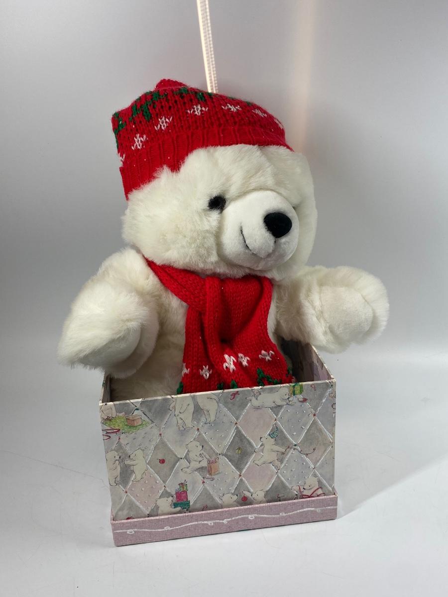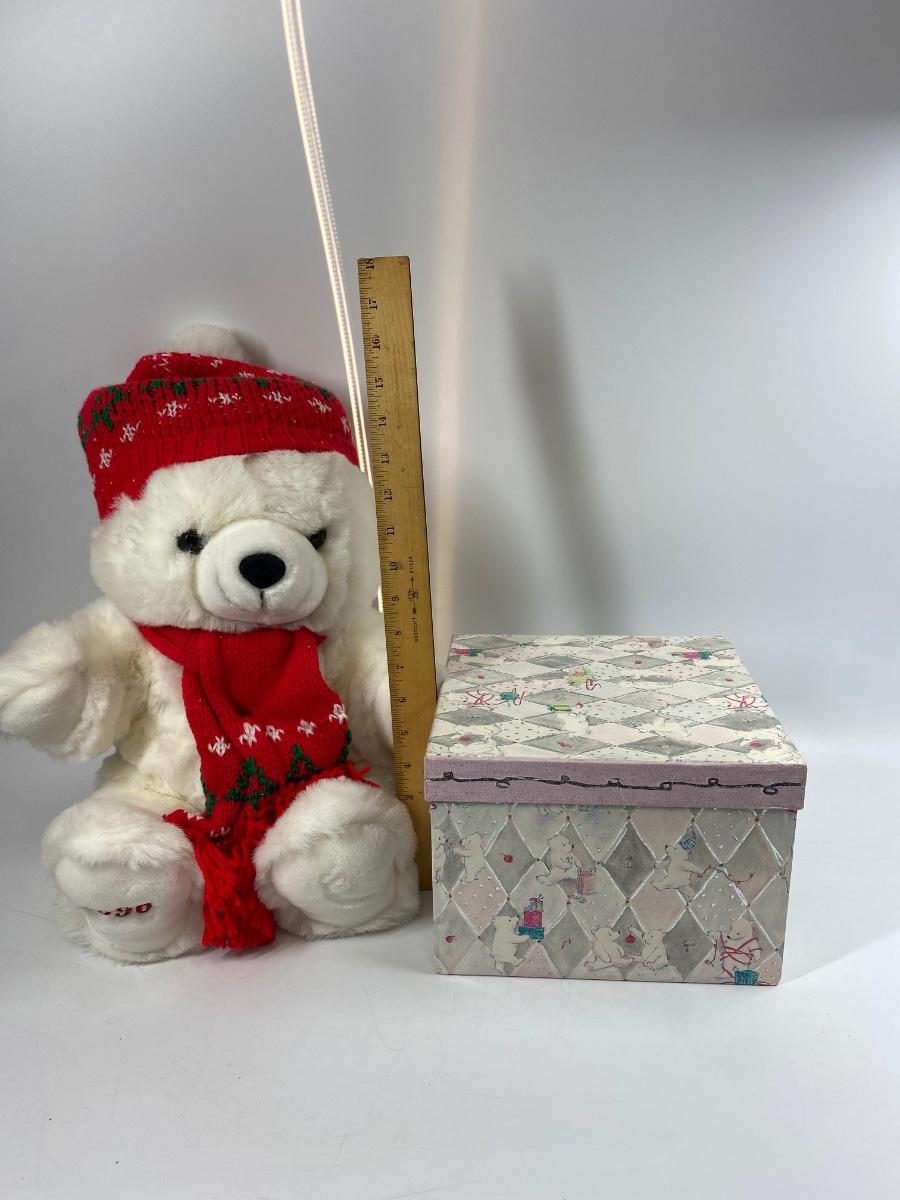Winter holiday polar bear plush wearing beanie and scarf. Included with bear is a polar bear themed sturdy holiday gift/storage box. Both are in good condition.