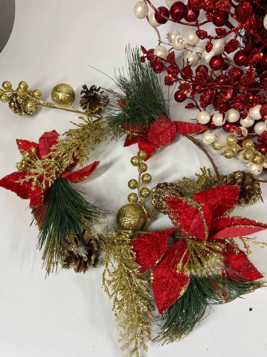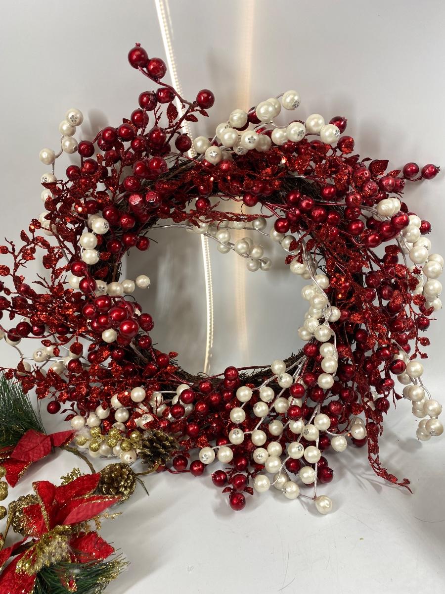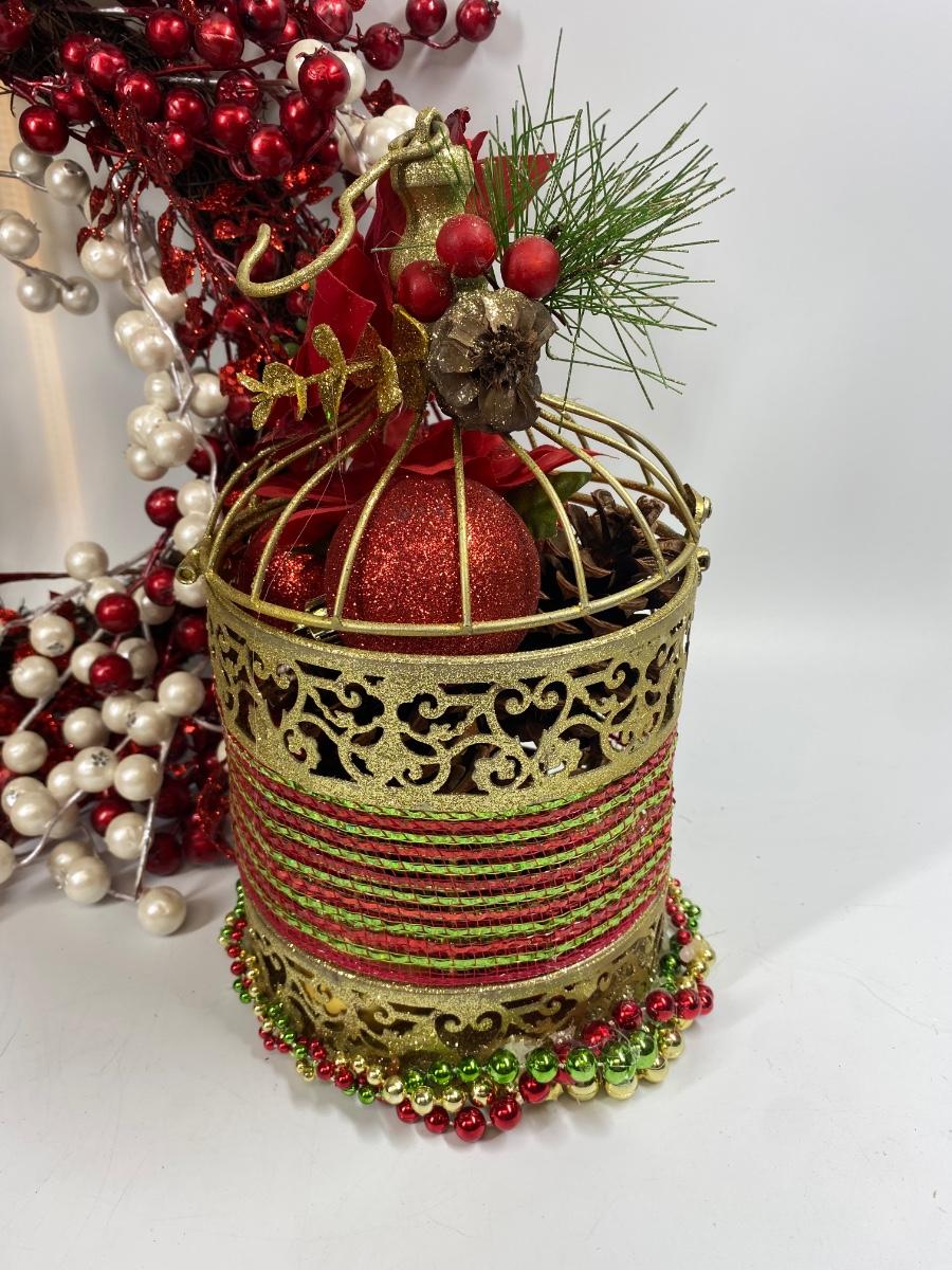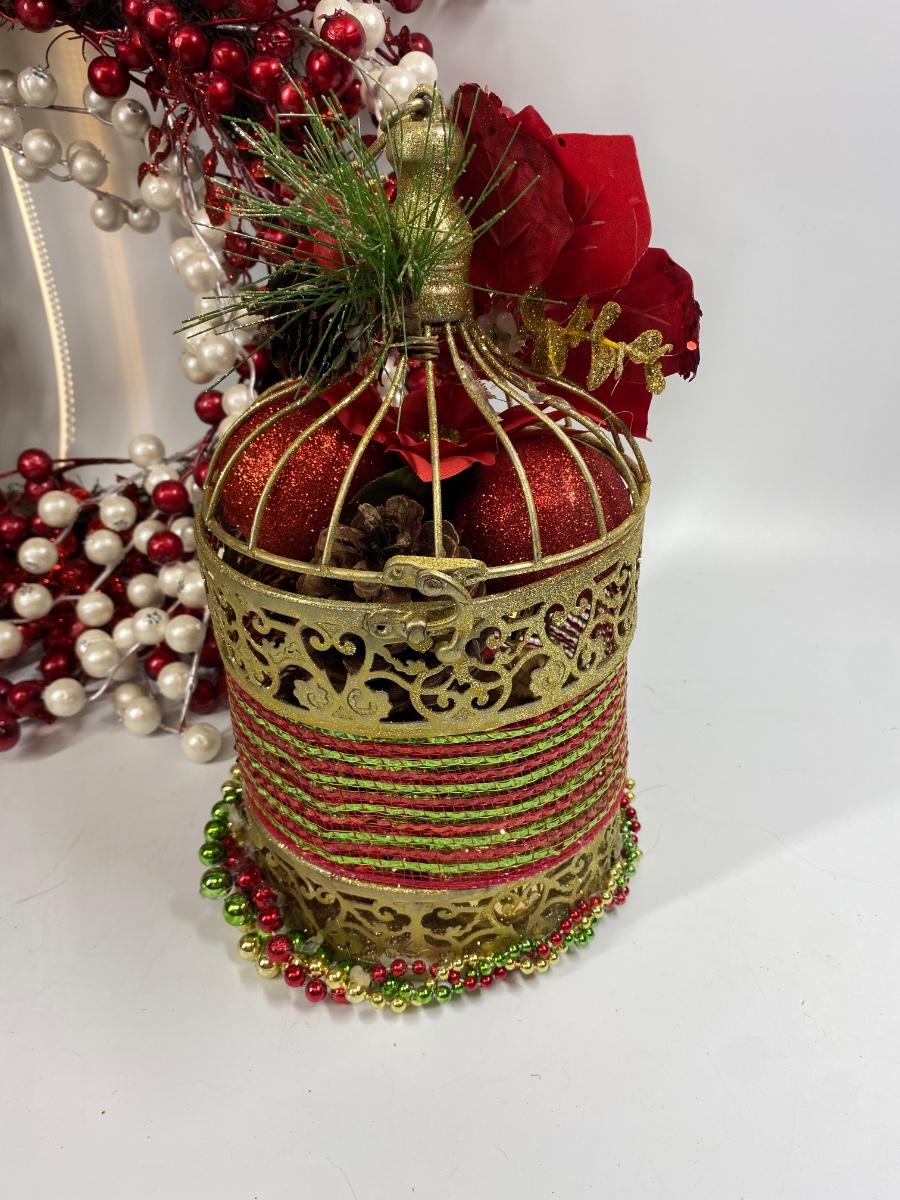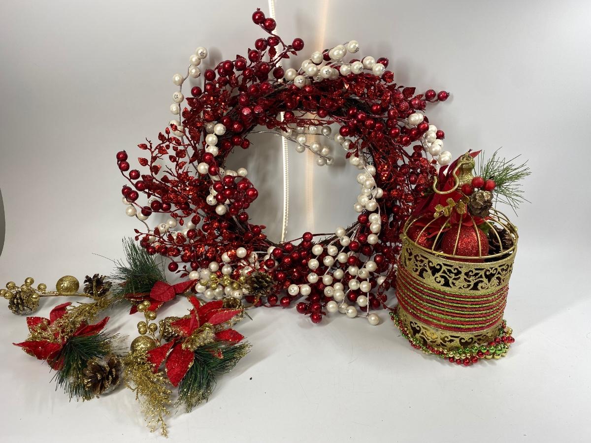 Winter holiday home decor lot. Red and white berry wreath, small pine wreath, and a gold glitter cage with red glitter ornaments inside. Great as decor or repurpose for crafts.