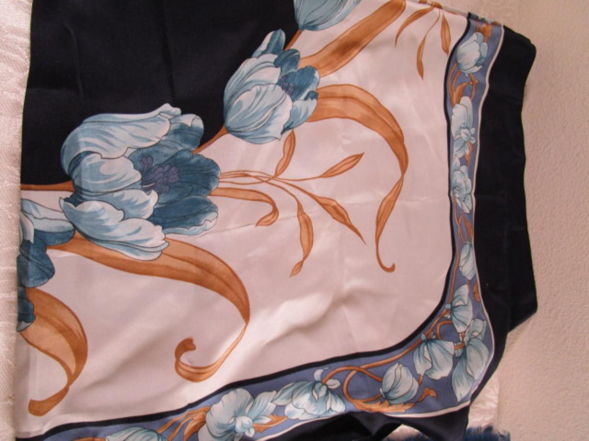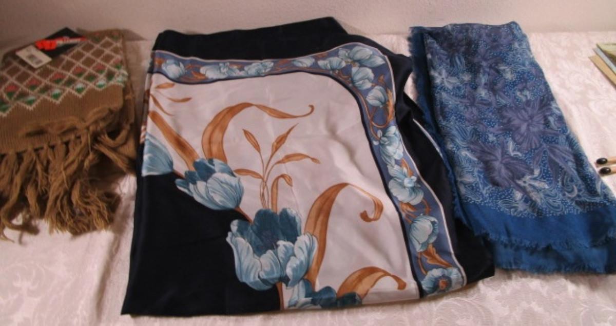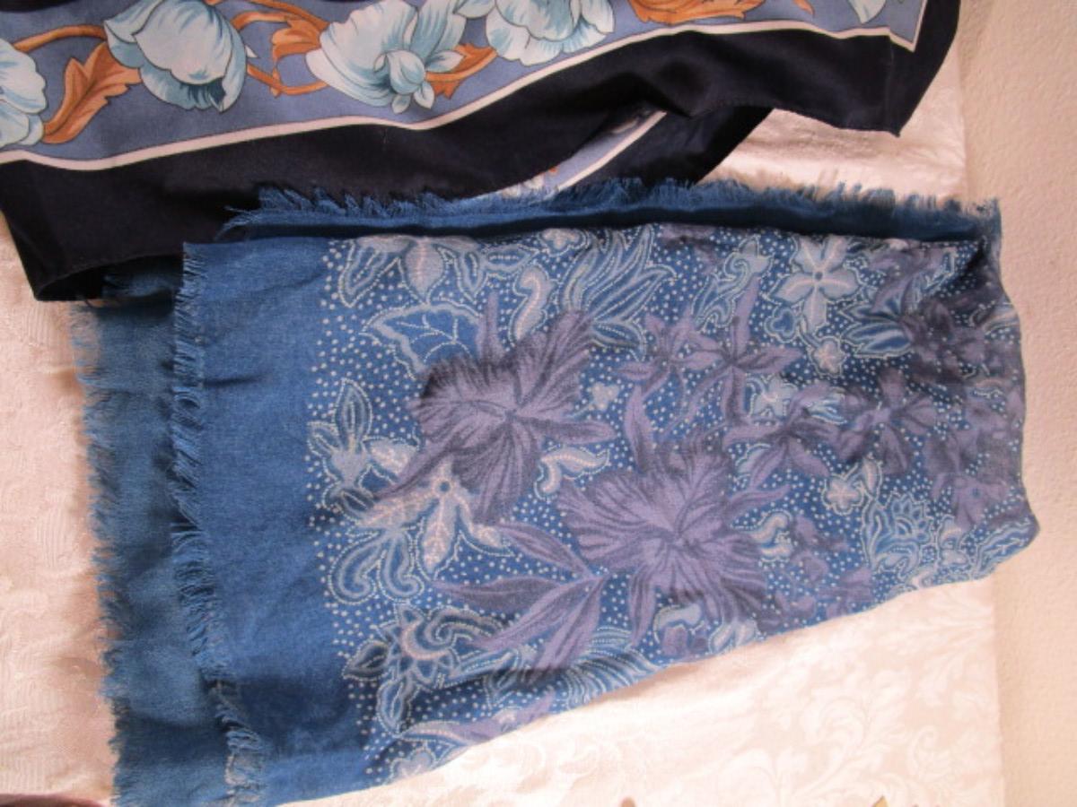 1 Winter scarf 59" x 7", 1 navy & blue decorative scarf 34" x 34", 1 blue crepe scarf 31" x 31", See pictures - G