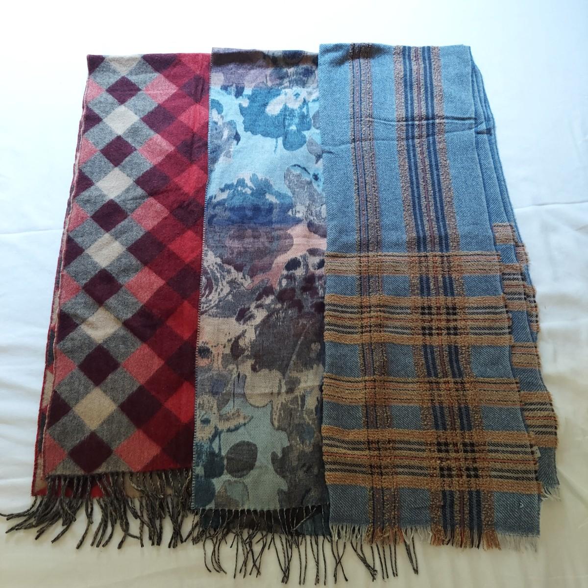 This lot includes 6+ Winter scarves by Orvis, Lauren Ralph Lauren, Lancioni and more. Plus a pair of black leather driving gloves that appear to be sz S and a wool hat. Shipping available
