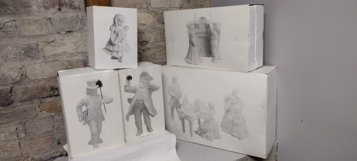 5 New in Box Figurines. Department 56 Winter Silhouette Figures. Clara has had a leg repair but it is not noticeable when displayed. All figures have their accessory pieces and original boxes