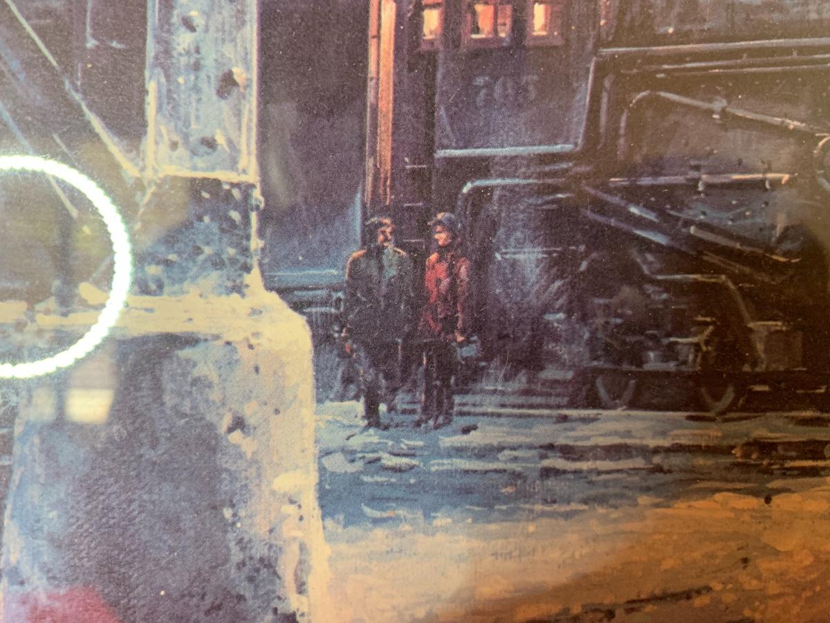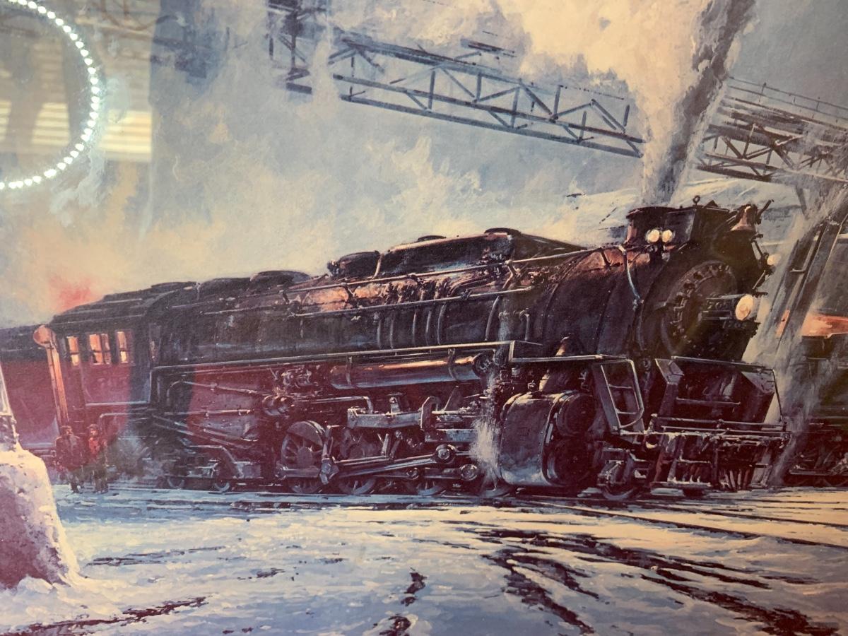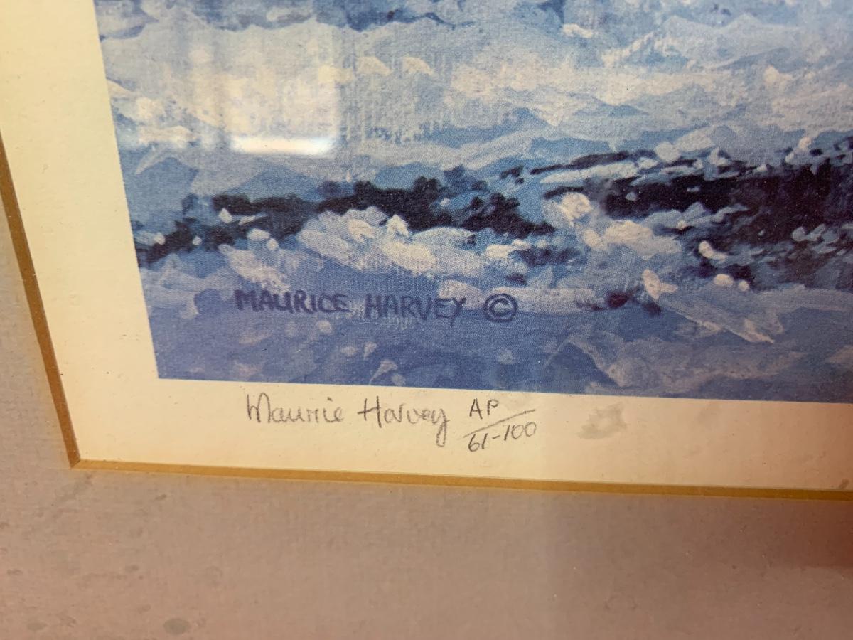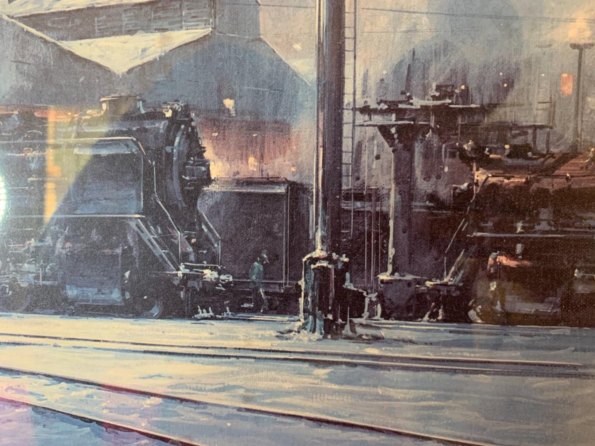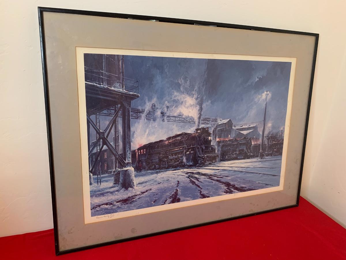 Large Maurice Harvey art print pencil signed 61/00. Depicts a train yard with winter snow. 34” x 25”