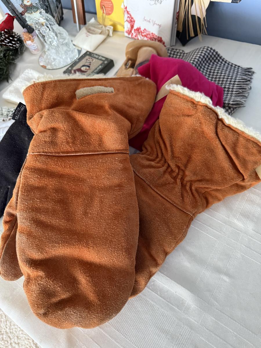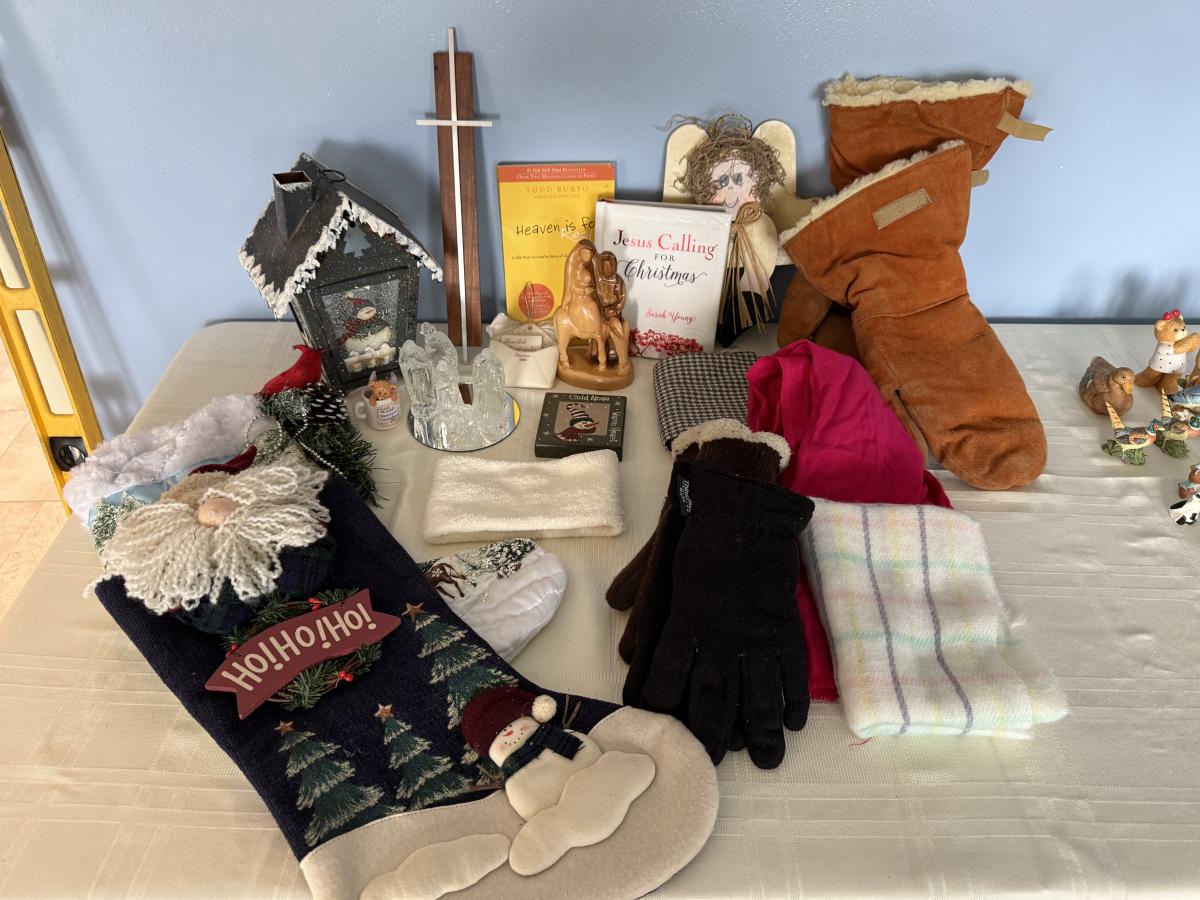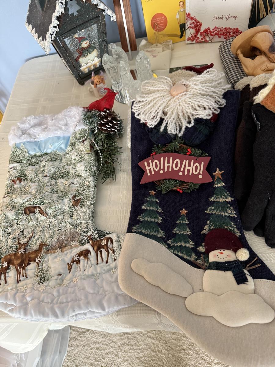 Winter wear gloves/scarves, 2 Christmas stockings, wood carving sculpture, glass nativity set