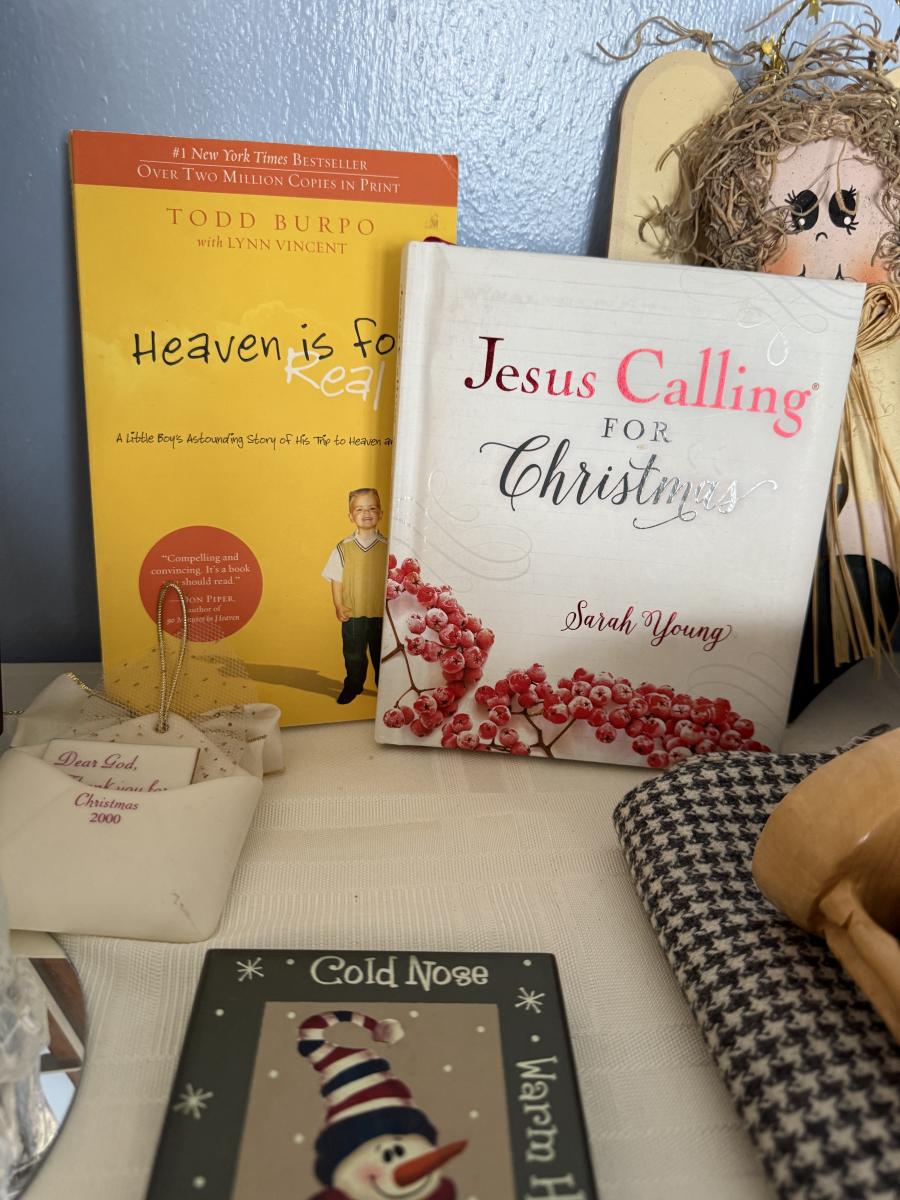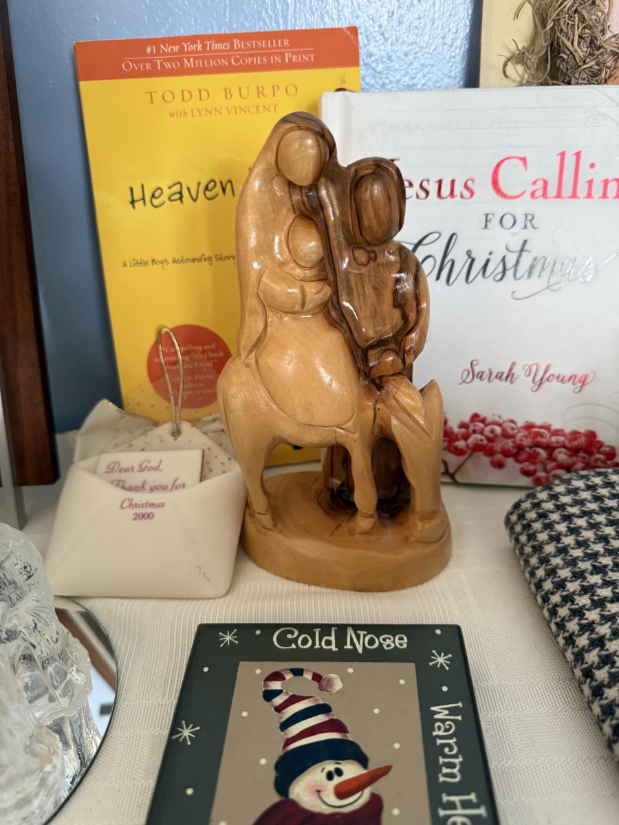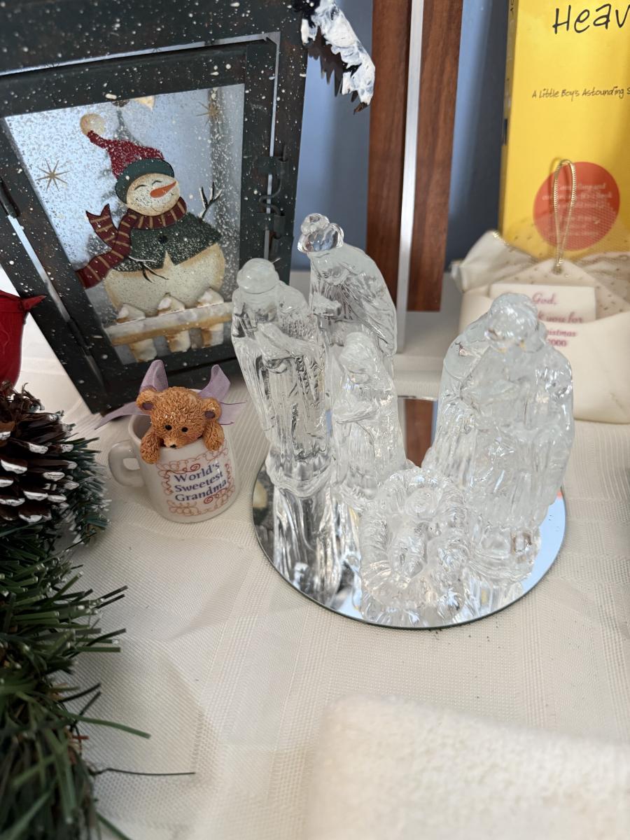 Winter wear gloves/scarves, 2 Christmas stockings, wood carving sculpture, glass nativity set