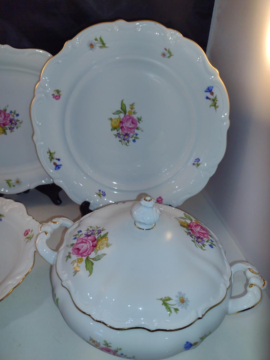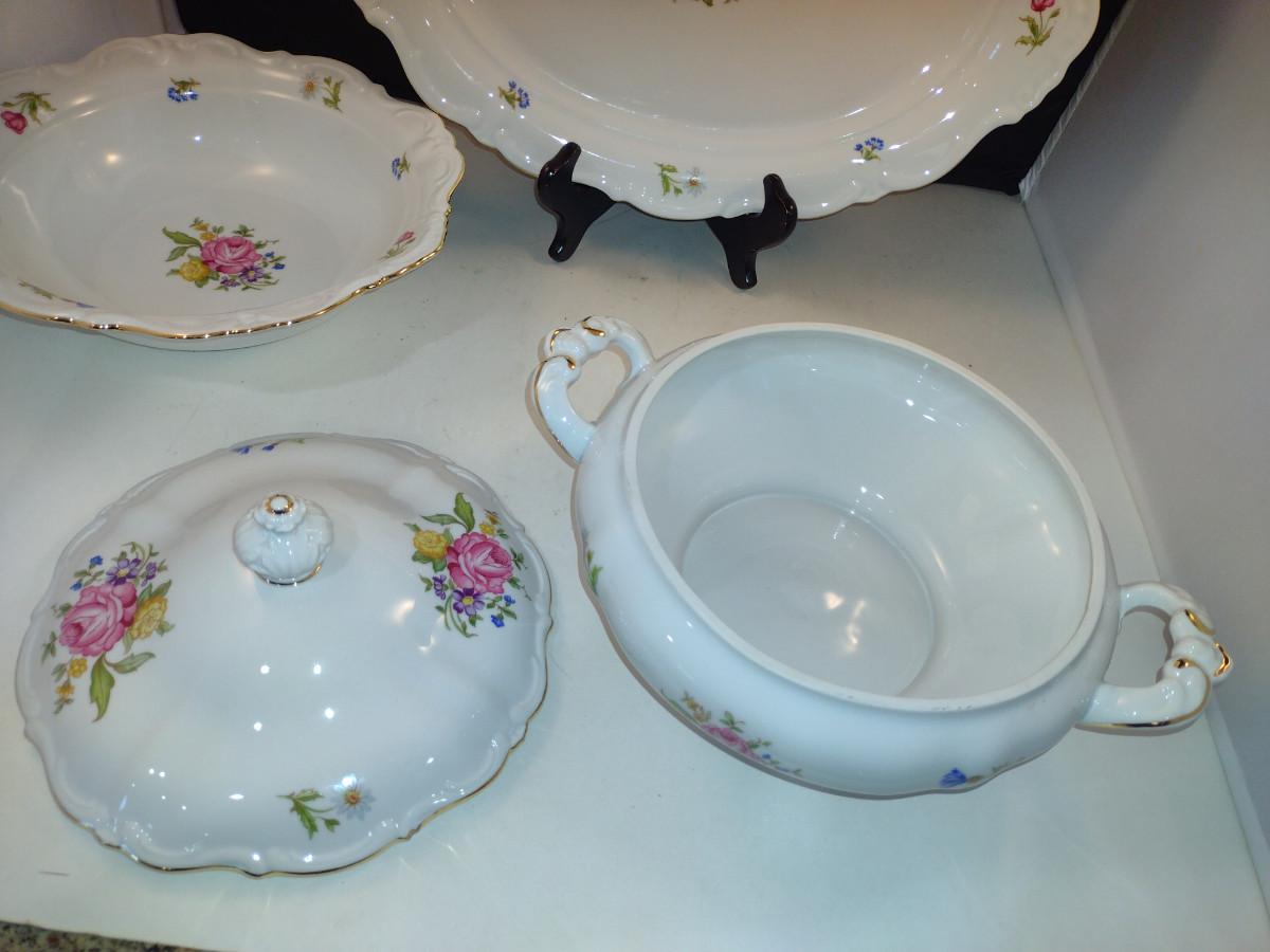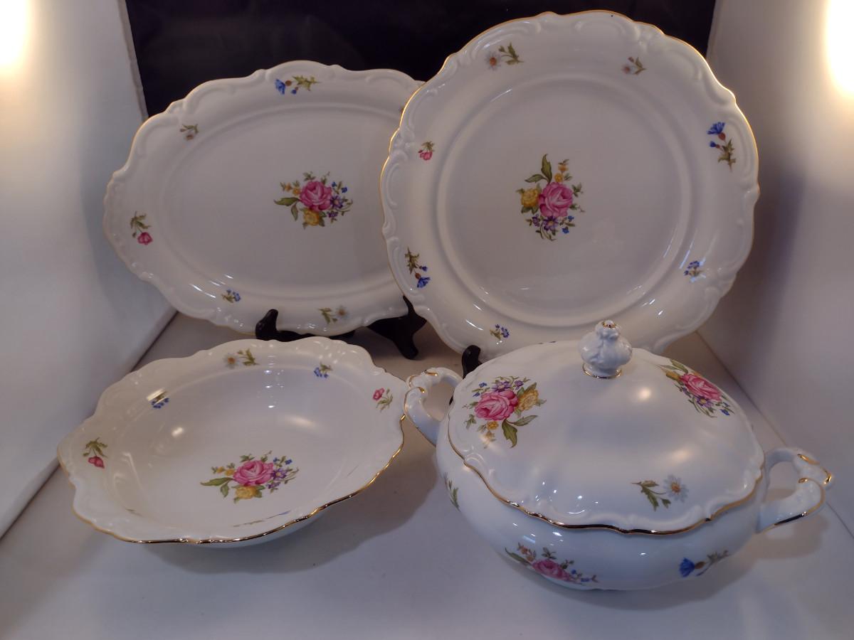 Winterling Bavaria Germany Serving Pieces- Mignon Pattern. Oval platter (15" x 10")-1, round platter (12" in diameter)-1, vegetable bowl (10" in diameter)-1, covered vegetable bowl-1. Items are in used condition and may have occasional chip.