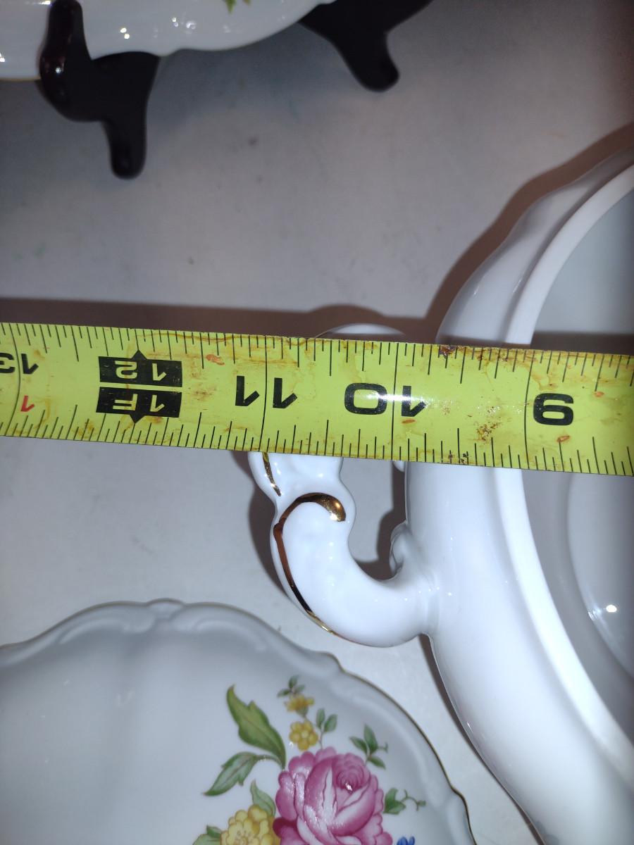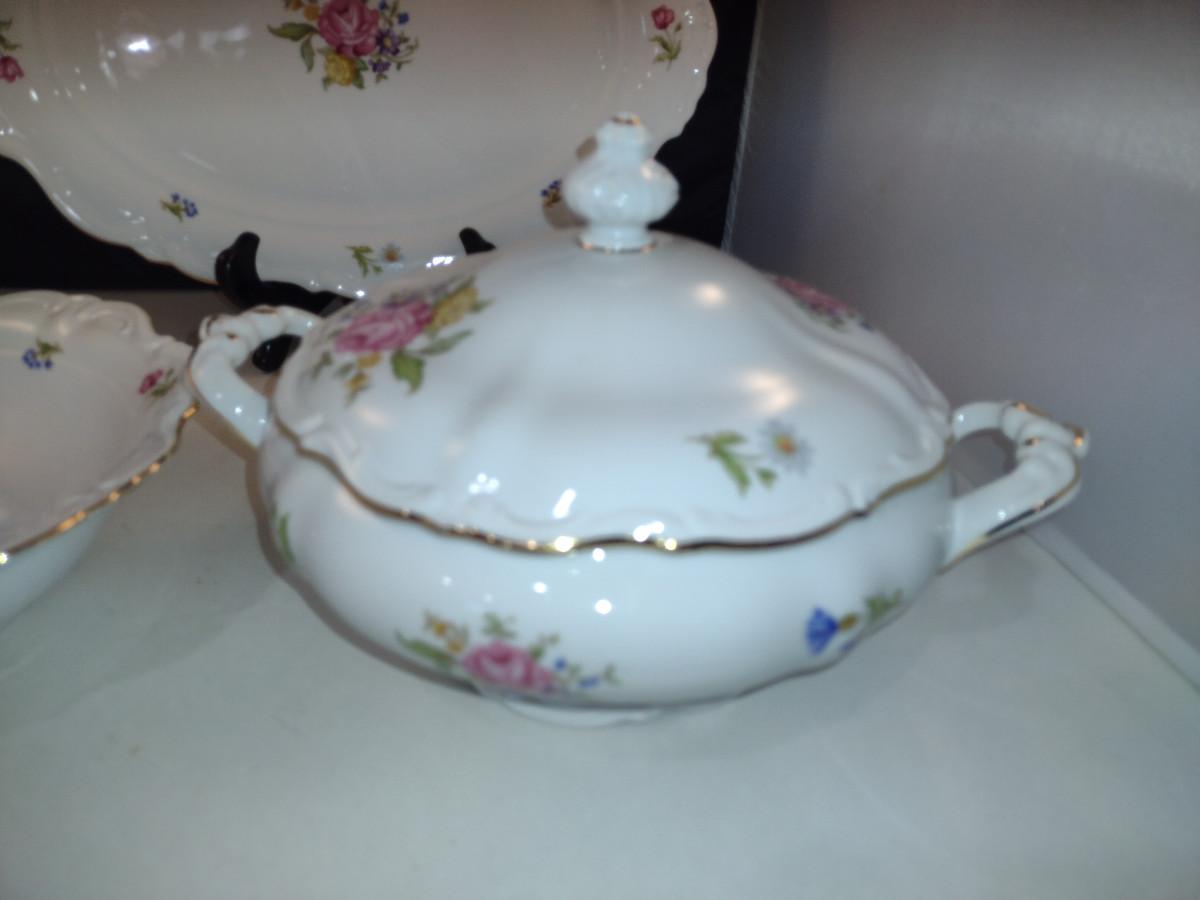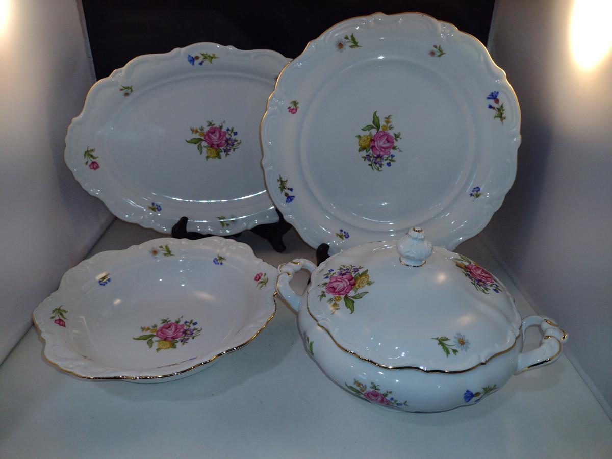 Winterling Bavaria Germany Serving Pieces- Mignon Pattern. Oval platter (15" x 10")-1, round platter (12" in diameter)-1, vegetable bowl (10" in diameter)-1, covered vegetable bowl-1. Items are in used condition and may have occasional chip.