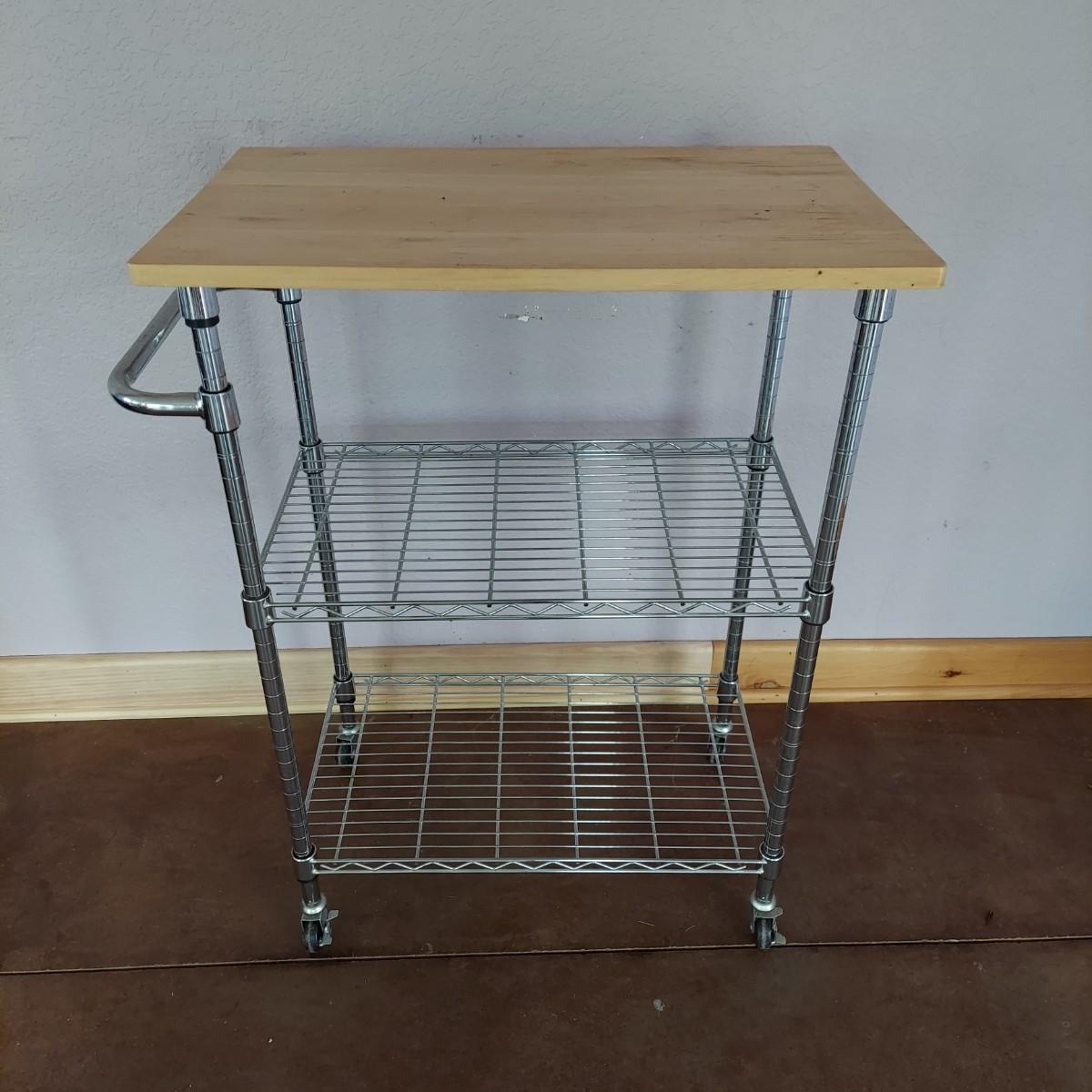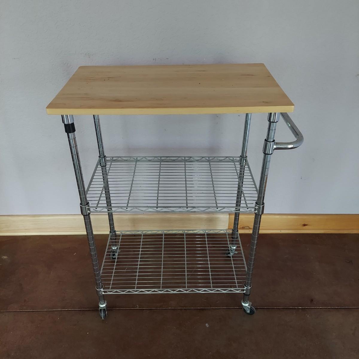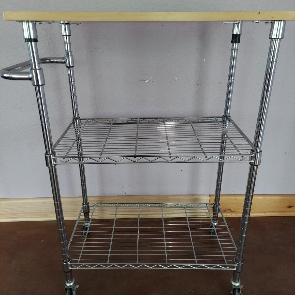 Three tier wire rolling kitchen cart with wooden work top. Measures approximately 26" x 16" x 36"H. Local Pickup Only.