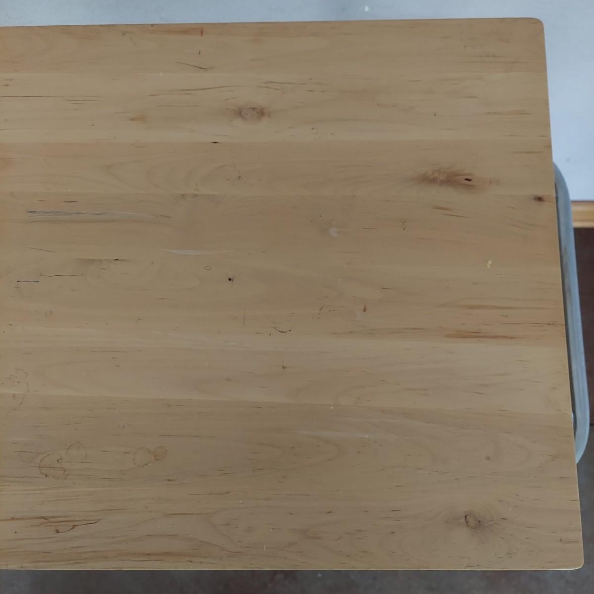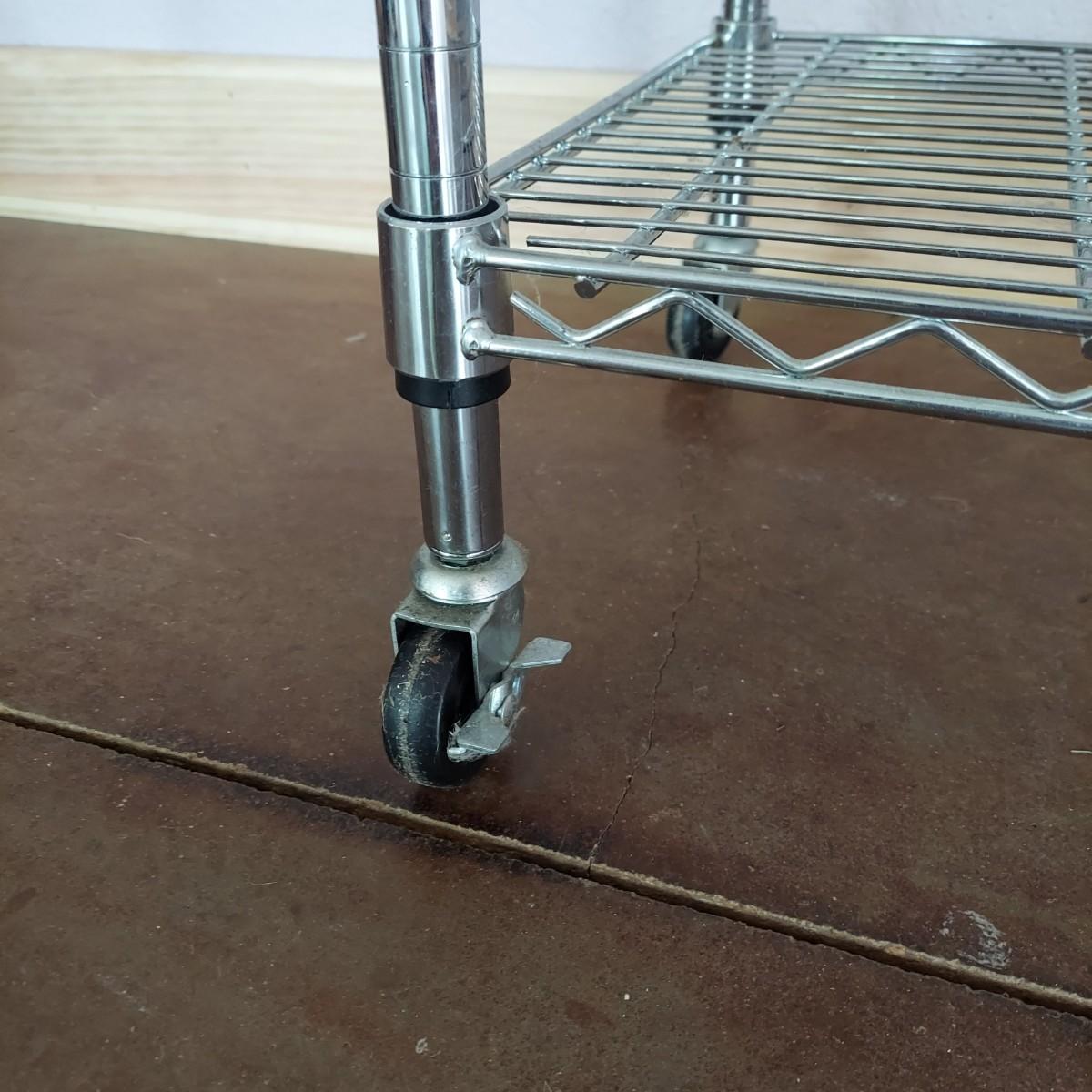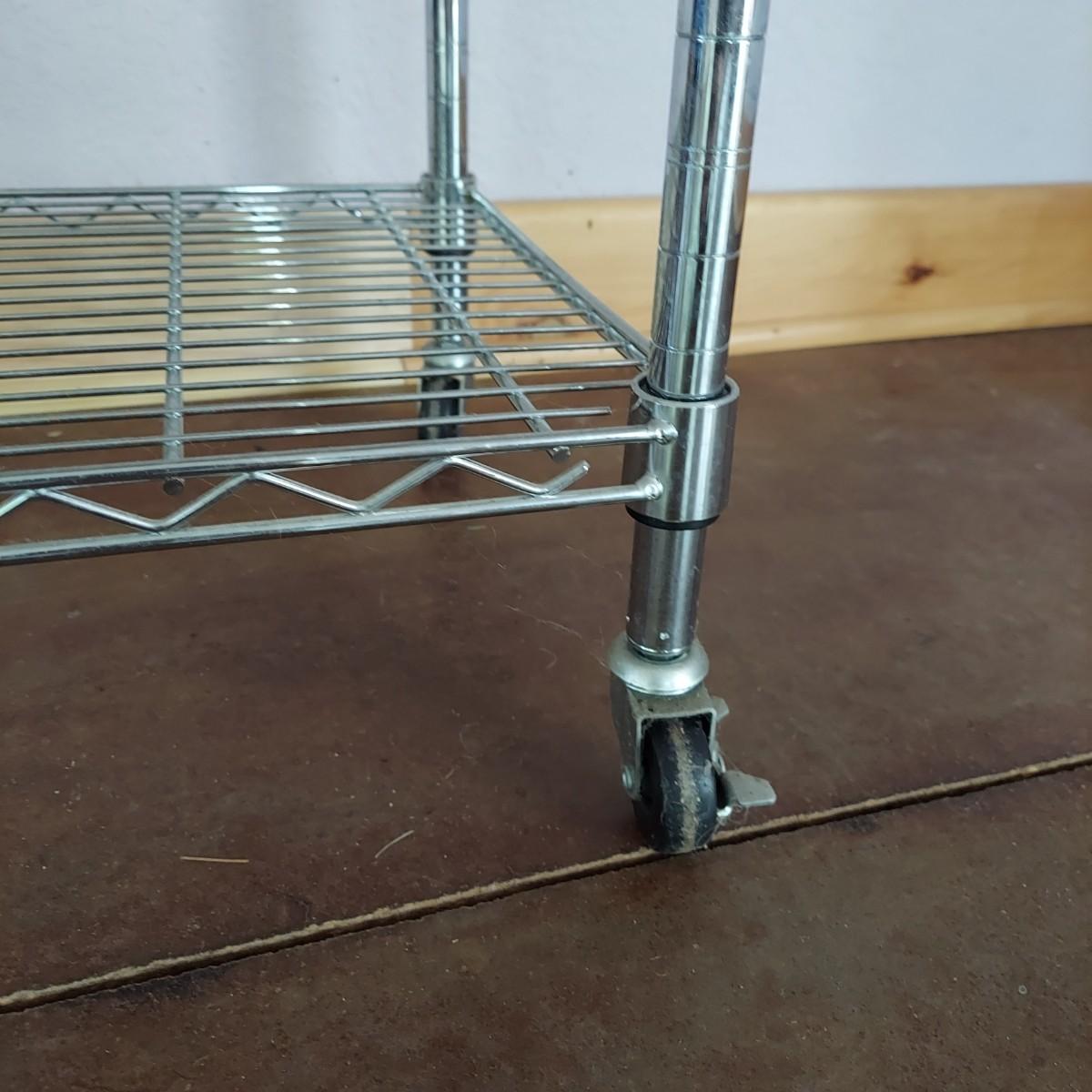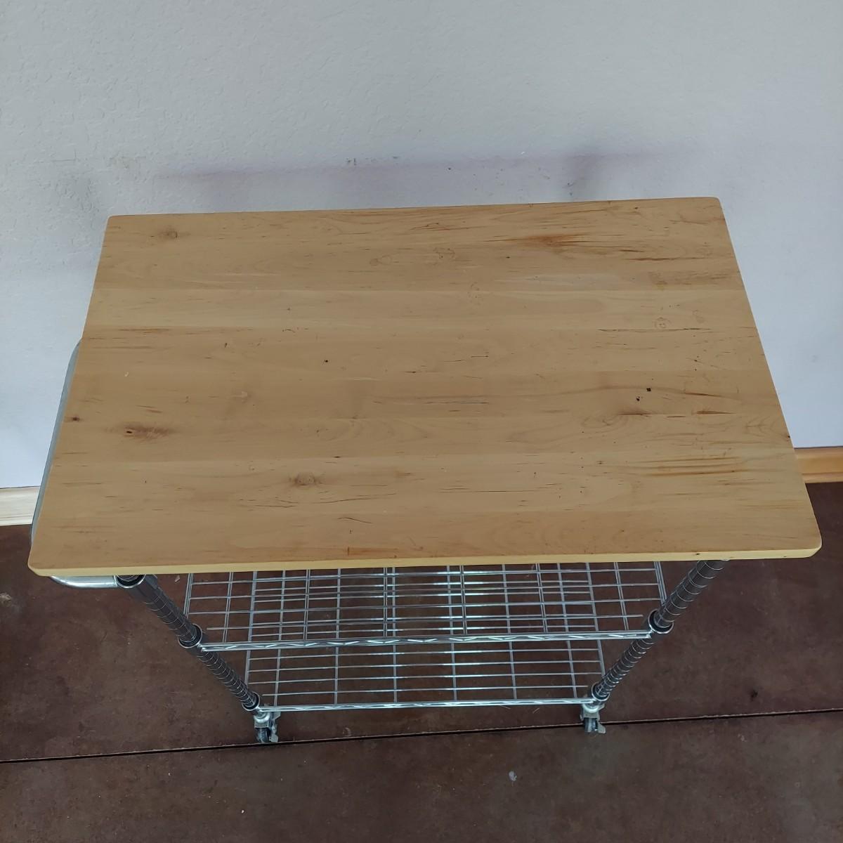 Three tier wire rolling kitchen cart with wooden work top. Measures approximately 26" x 16" x 36"H. Local Pickup Only.