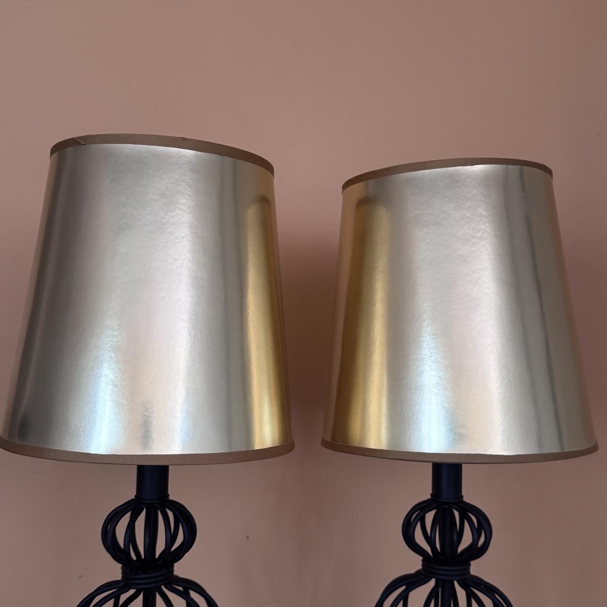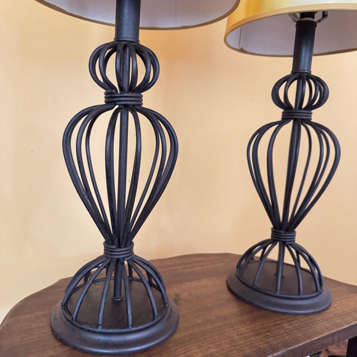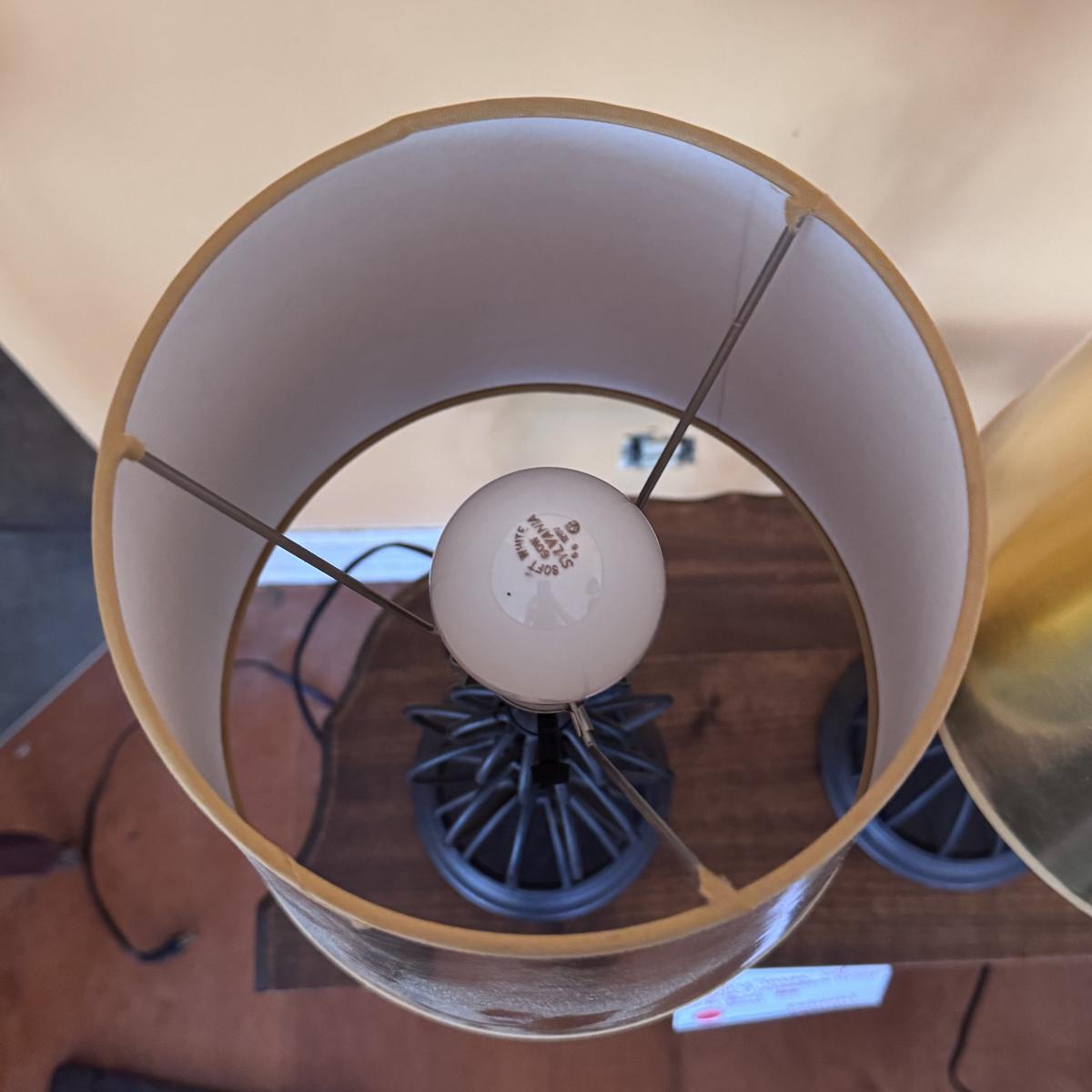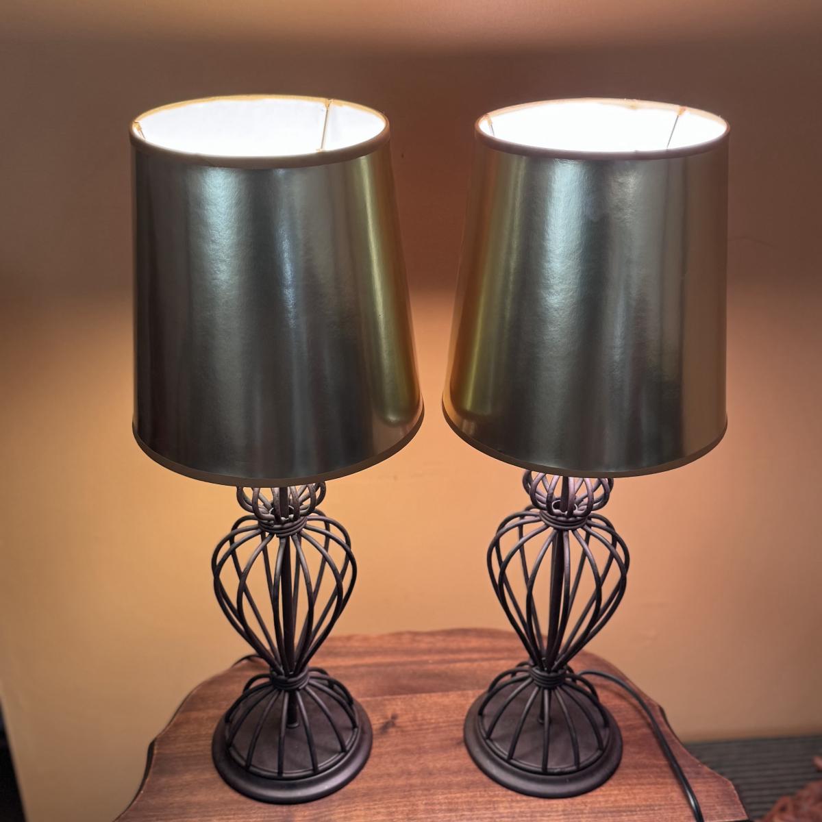 This lot includes two identical wire cage lamps with gold lampshades. Both lamps powered on when plugged in. One of the lamps on switch does not work - you have to twist the lightbulb for it to turn on. The other one works just fine. The lamps individually measure 9”D x 24”H. Shipping available.