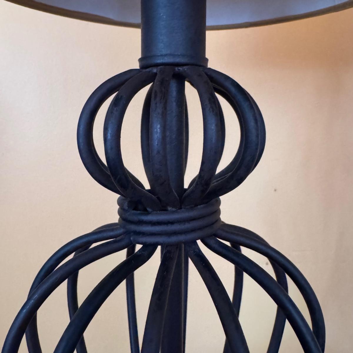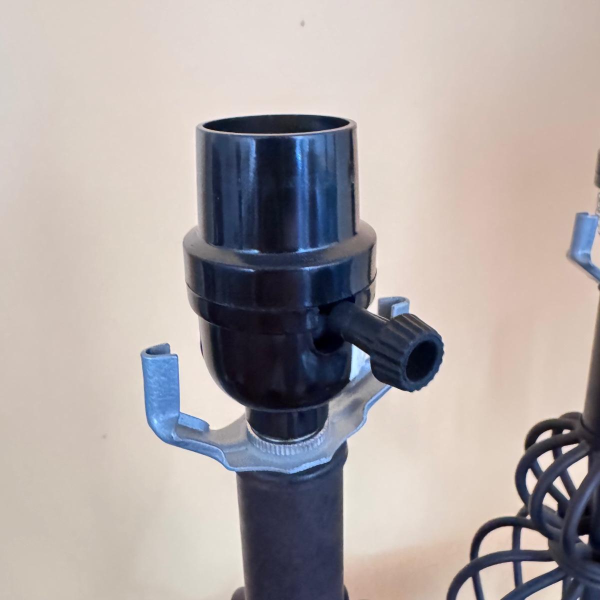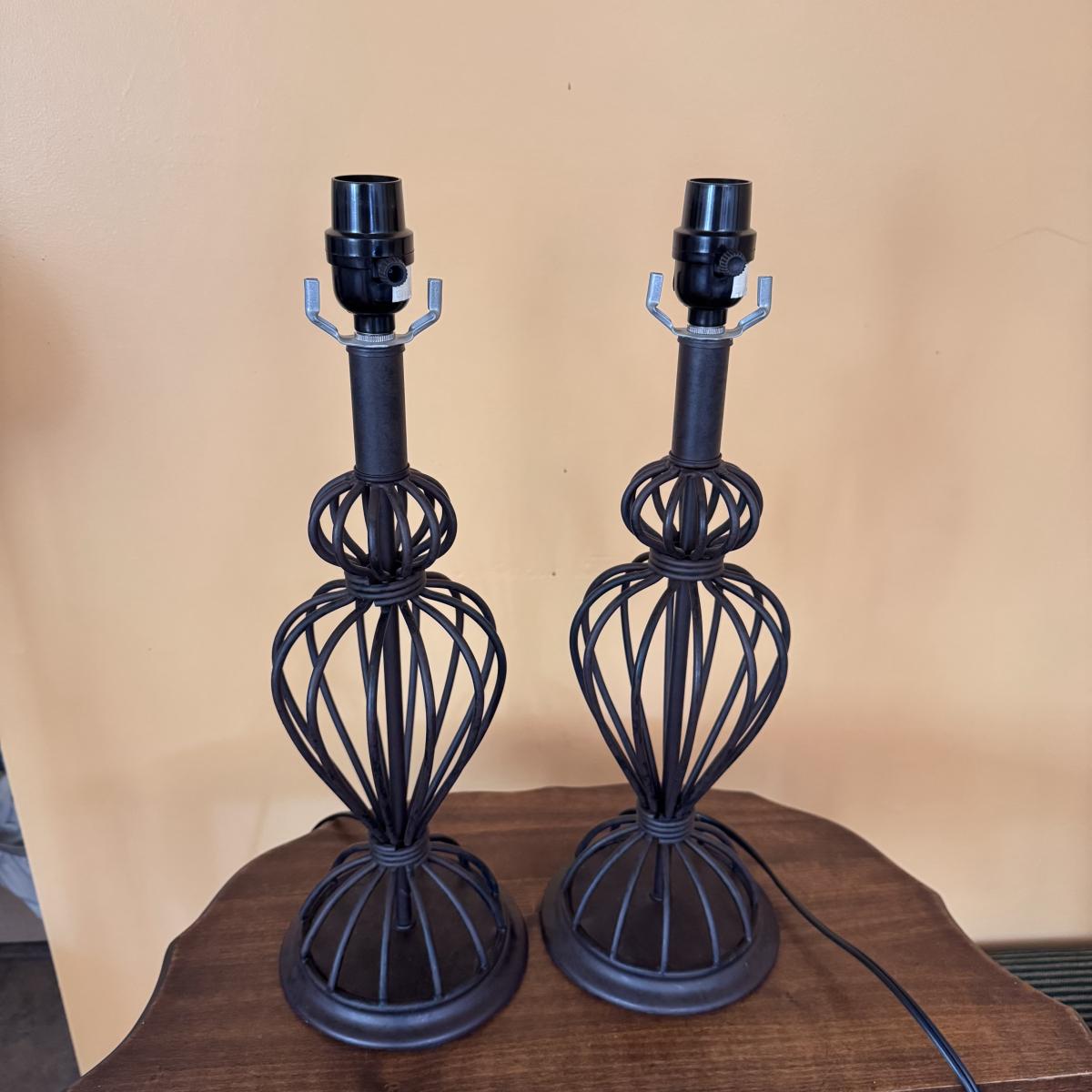 This lot includes two identical wire cage lamps with gold lampshades. Both lamps powered on when plugged in. One of the lamps on switch does not work - you have to twist the lightbulb for it to turn on. The other one works just fine. The lamps individually measure 9”D x 24”H. Shipping available.