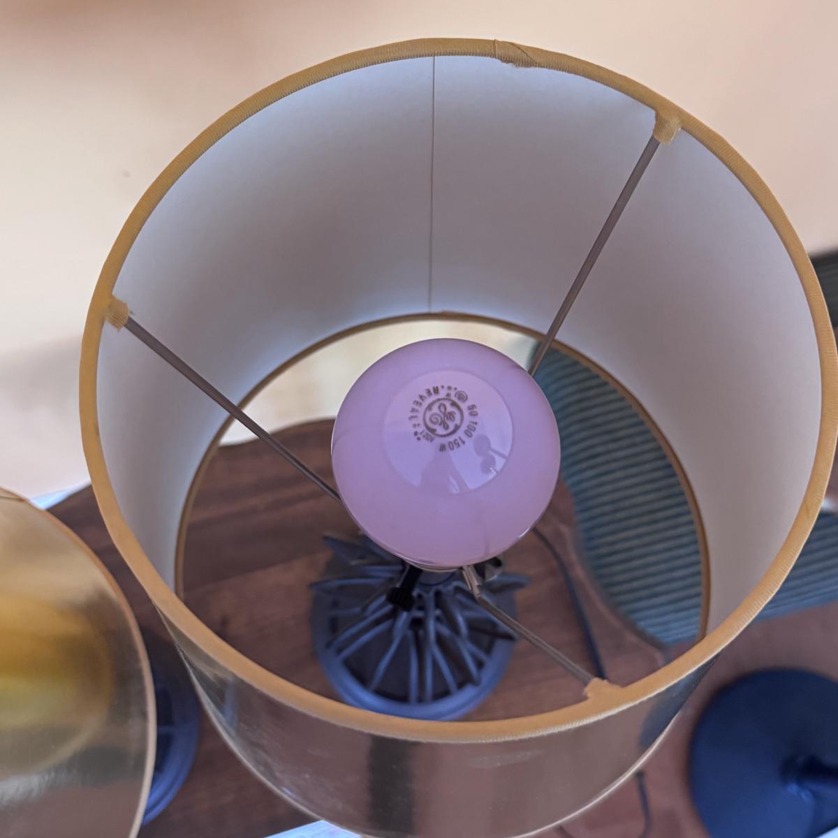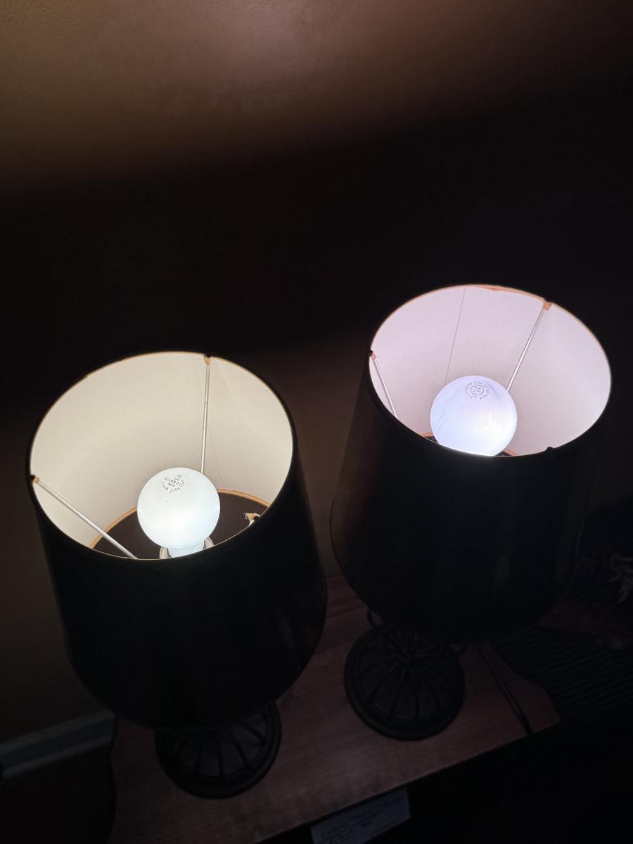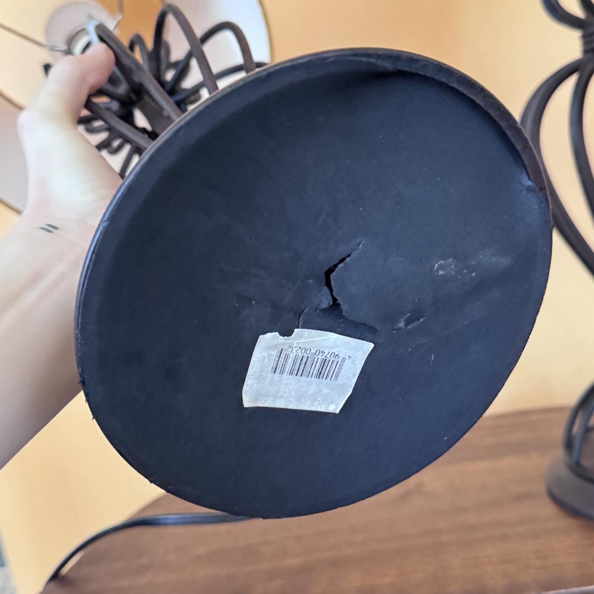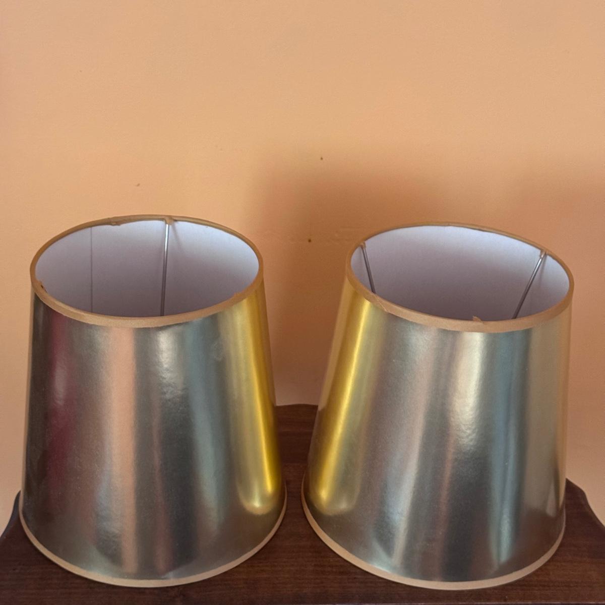 This lot includes two identical wire cage lamps with gold lampshades. Both lamps powered on when plugged in. One of the lamps on switch does not work - you have to twist the lightbulb for it to turn on. The other one works just fine. The lamps individually measure 9”D x 24”H. Shipping available.