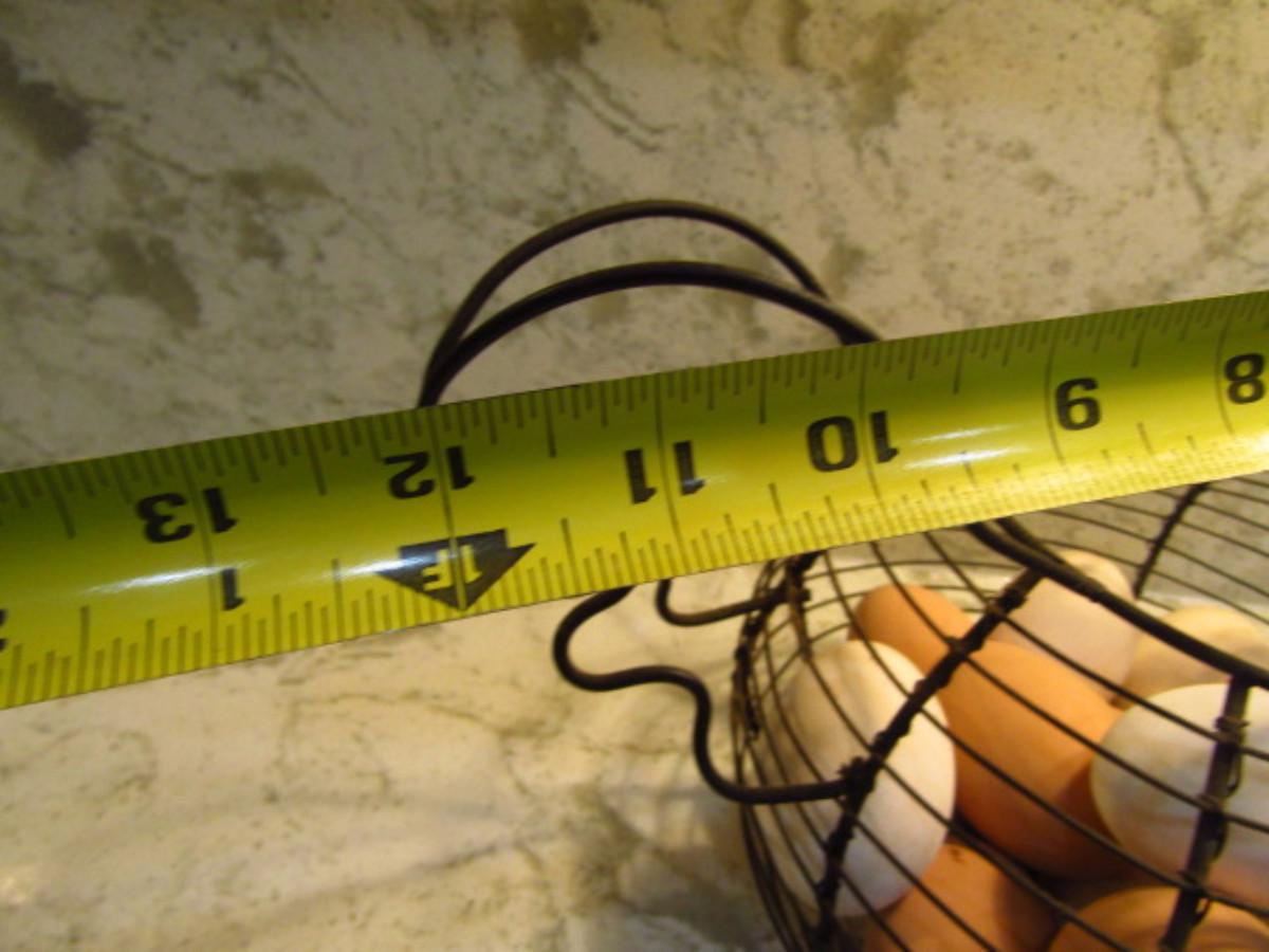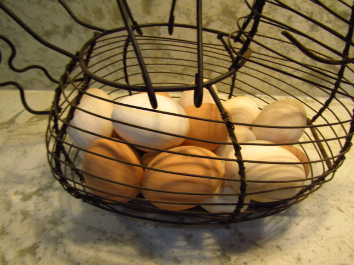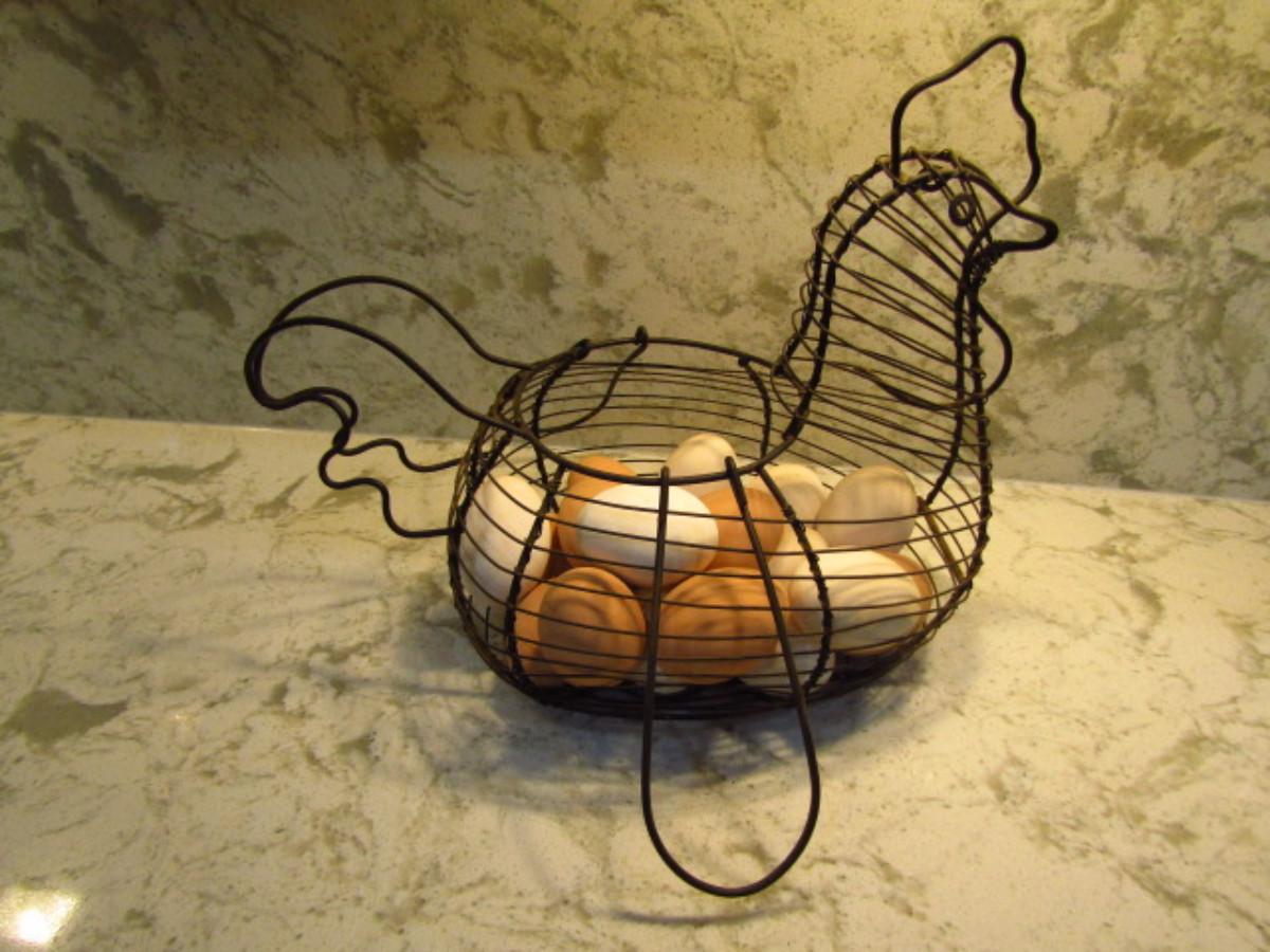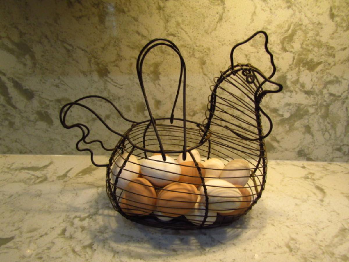 Wire Chicken Shaped Basket with Eggs (Kitchen). Eggs are possibly wooden.