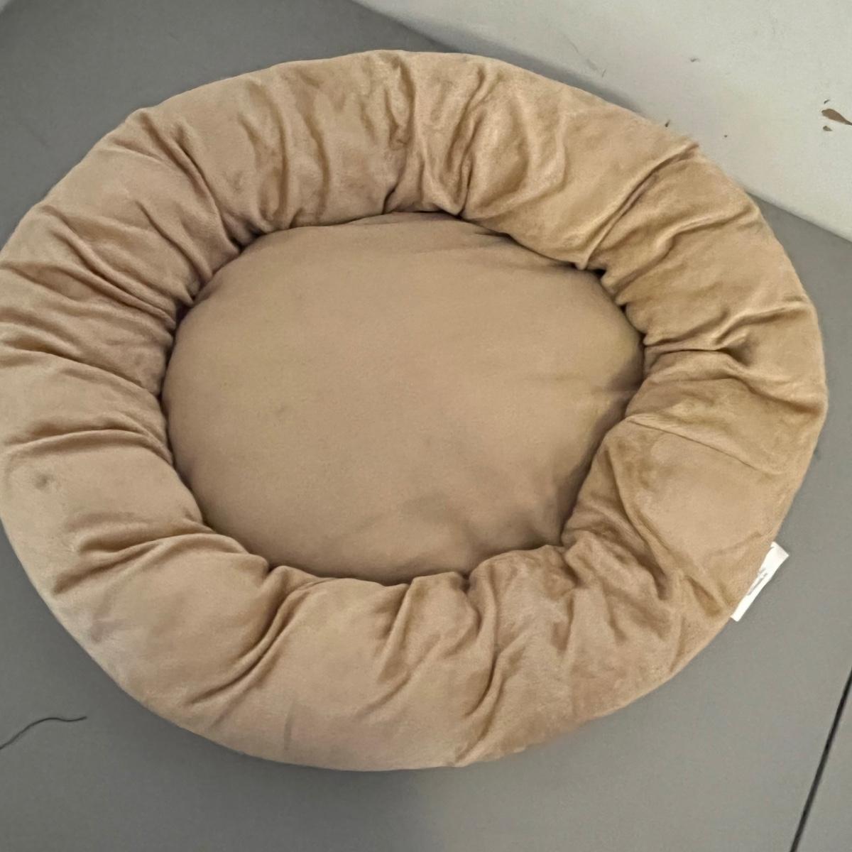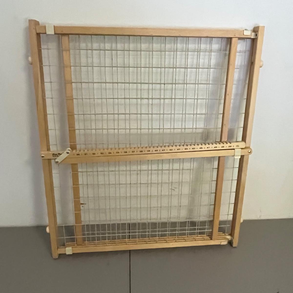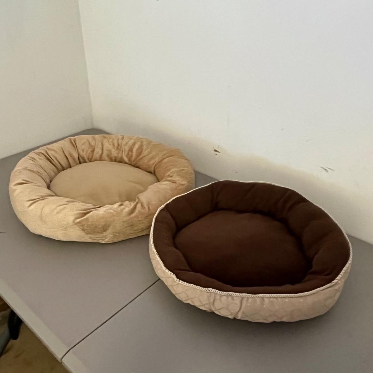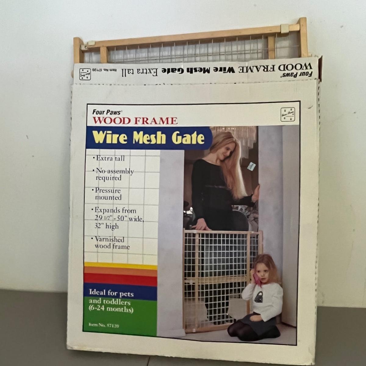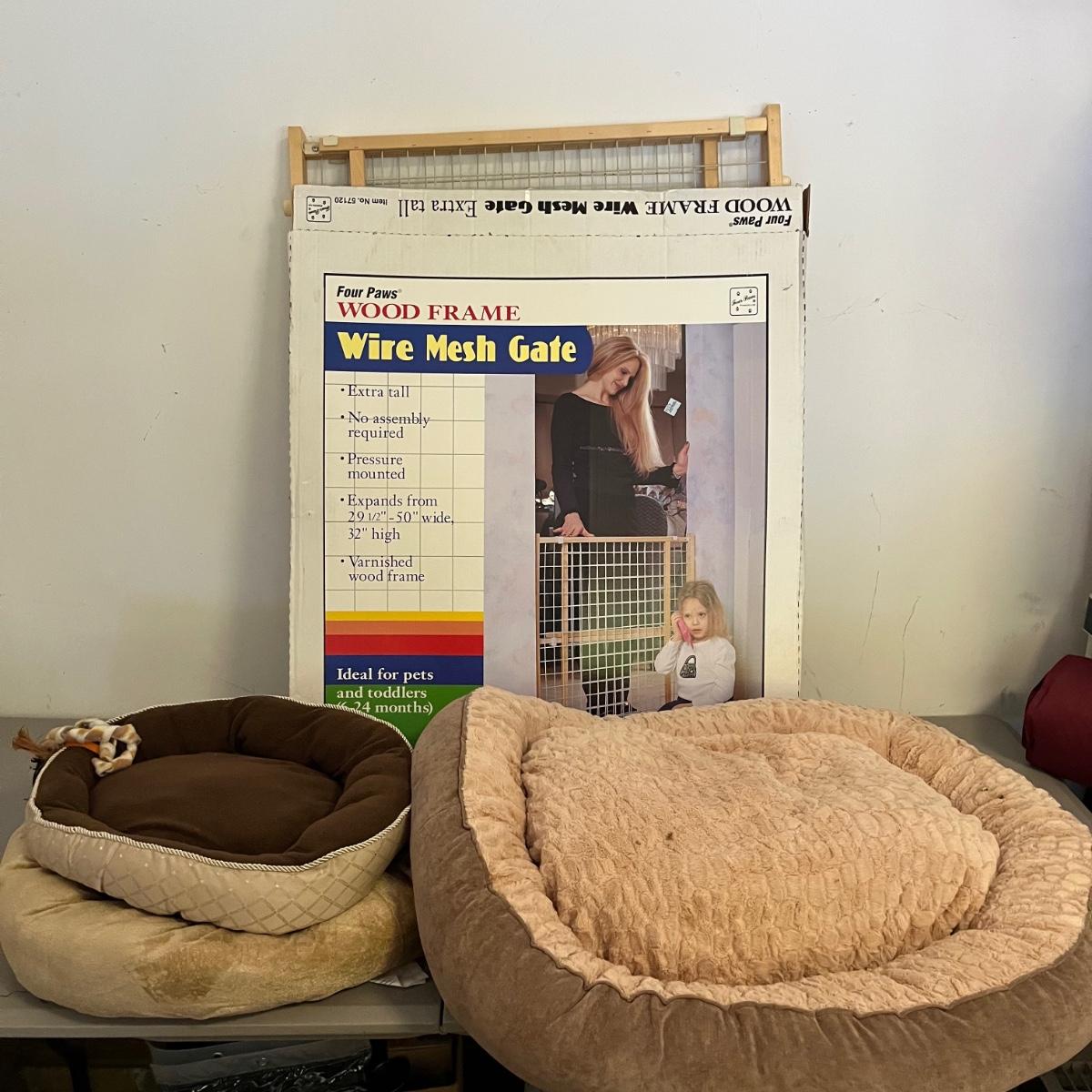 Lot includes a wire mesh gate that 50” x 32” when fully extended. Also includes two small beds and one larger pet bed that measures 28” x 33” x 9”.
