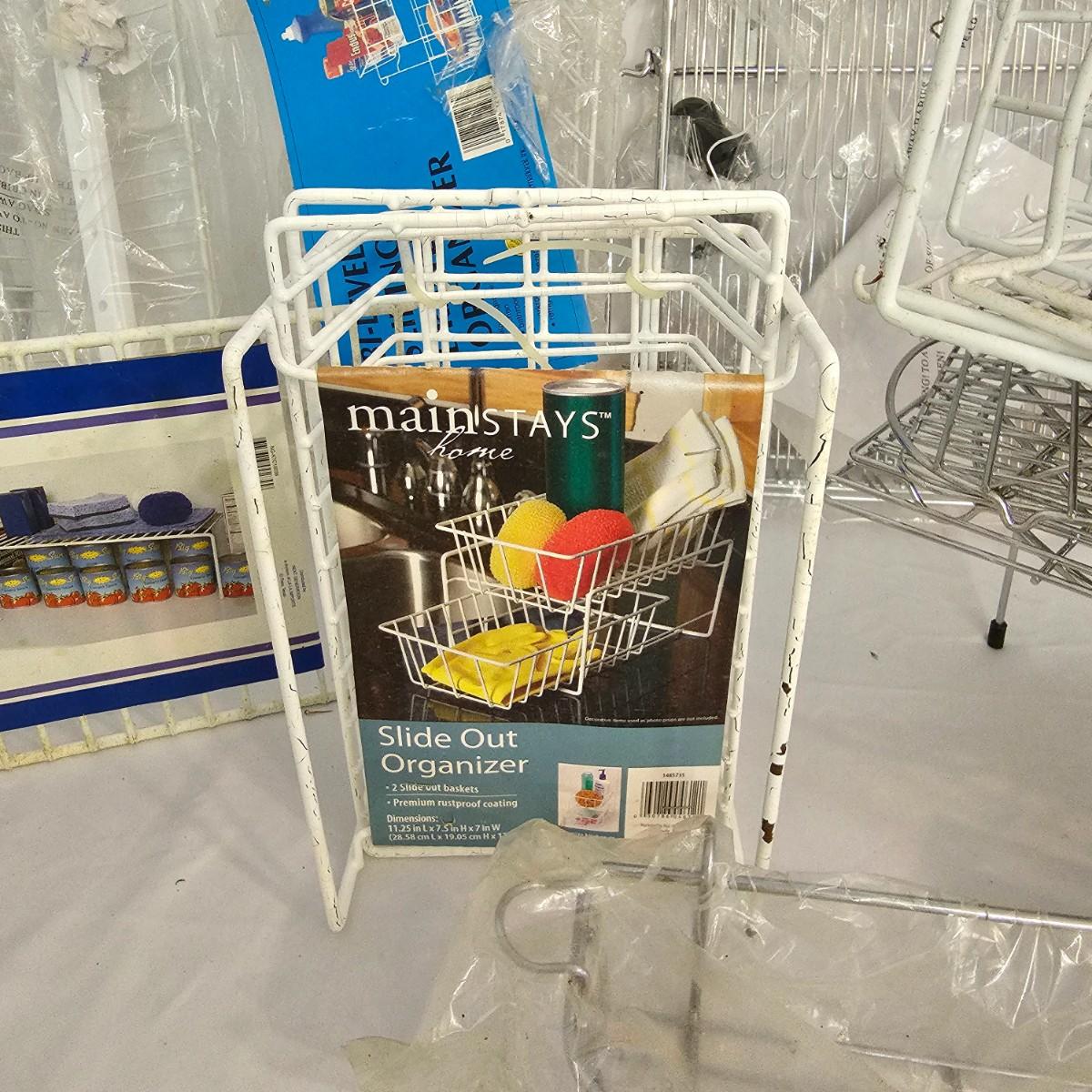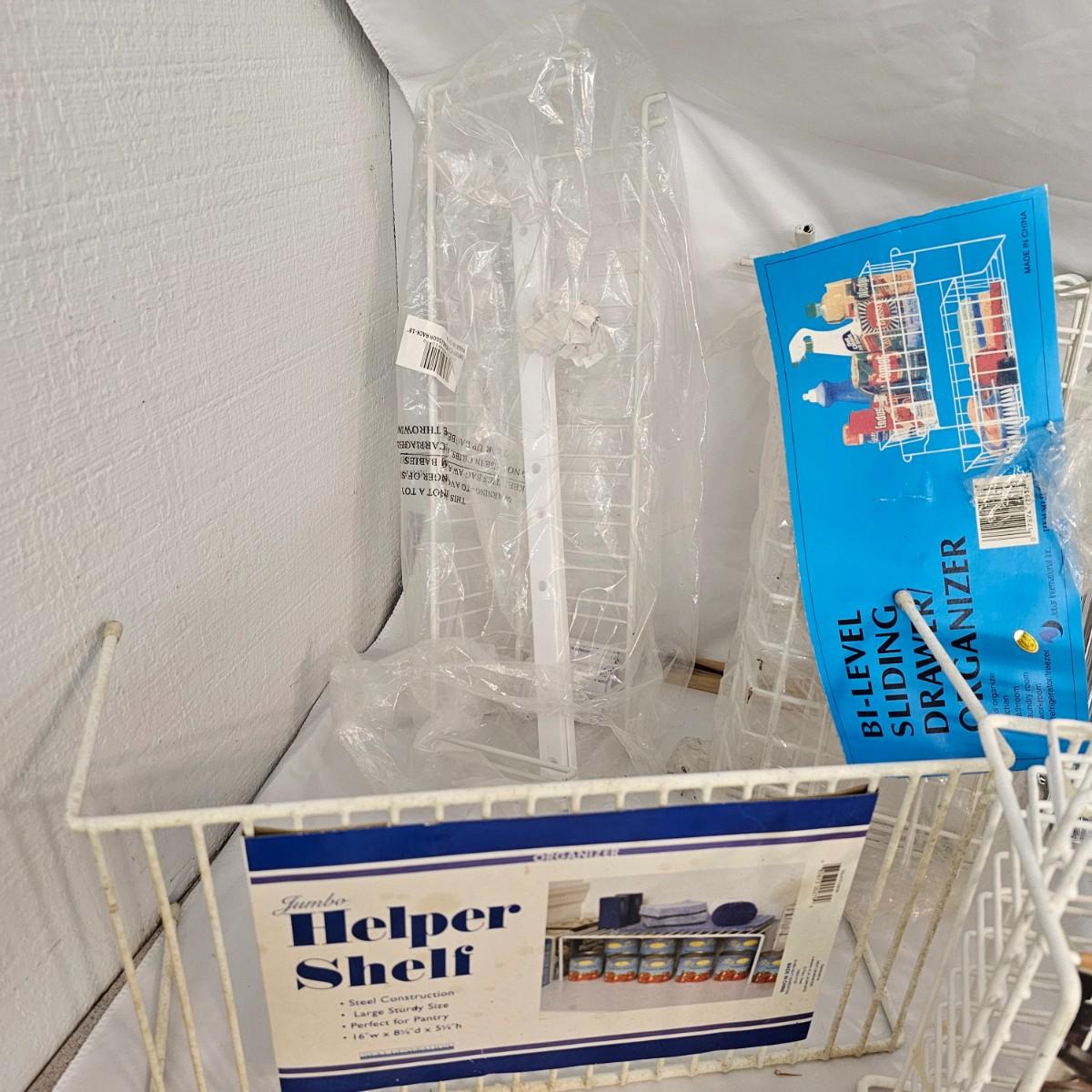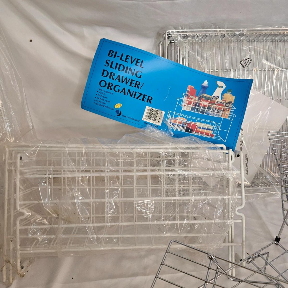 Several different styles of wire shelf organizers. Some vinyl covered, some plain wire. Drawer, shelf, sliding items. Various sizes from 11" x 7" x 11.5"h to 18" x 15" x3"h. Some items have been used, others in original packaging. See photos for details. Shipping available.