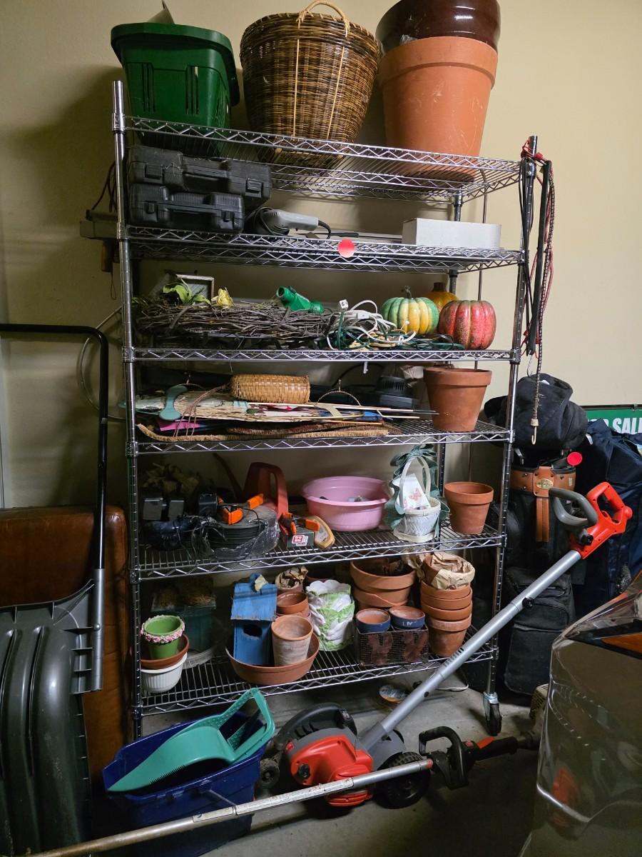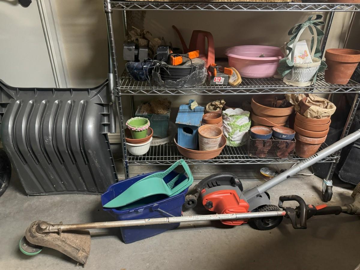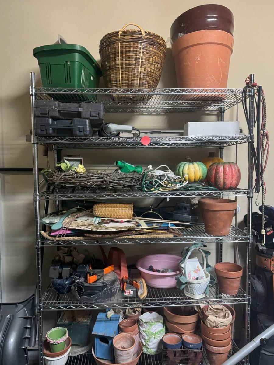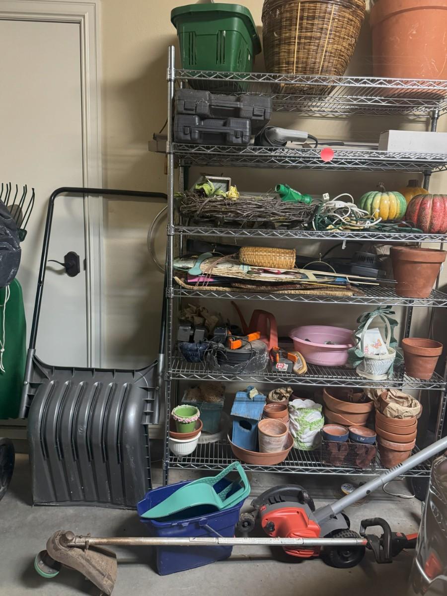 Wire Shelf with Miscellaneous Planters, Seasonal Decor and Seasonal Yard Tools: edger, blower, snowplow, etc.