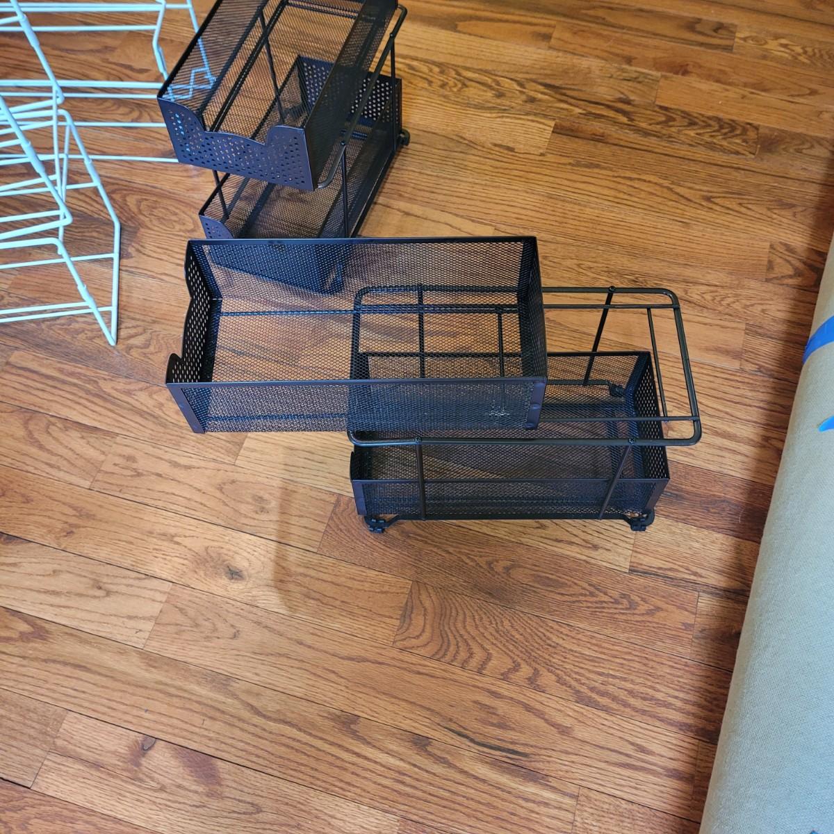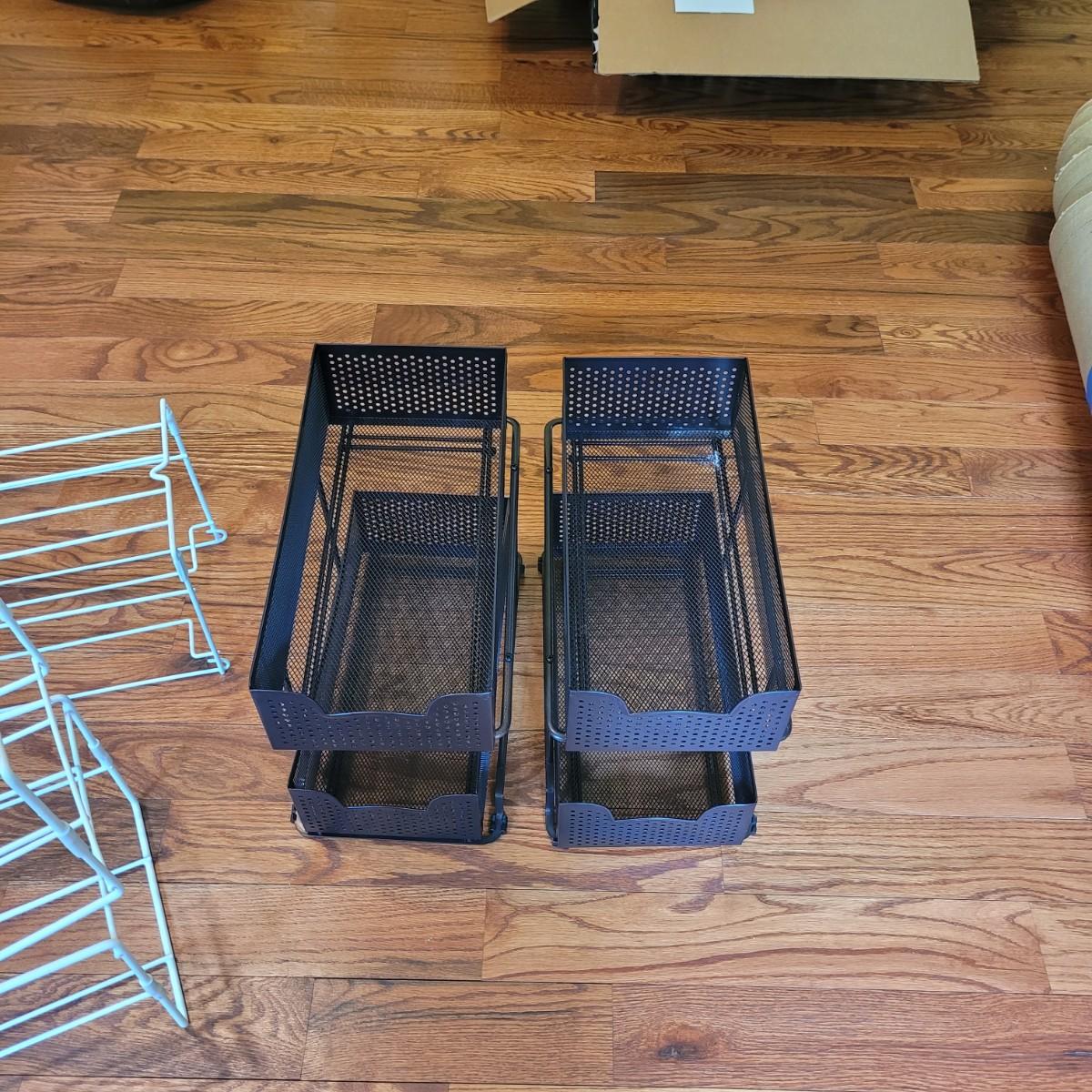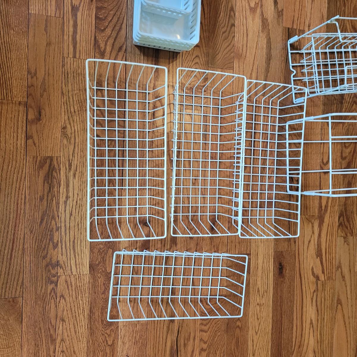 A variety of wire, metal and plastic shelving and baskets of assorted shapes and sizes. Black basket rack measures approximately 8.5" x 14" x 13"H Shipping available.