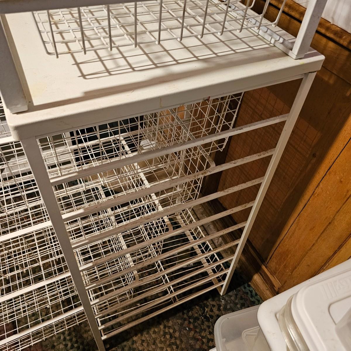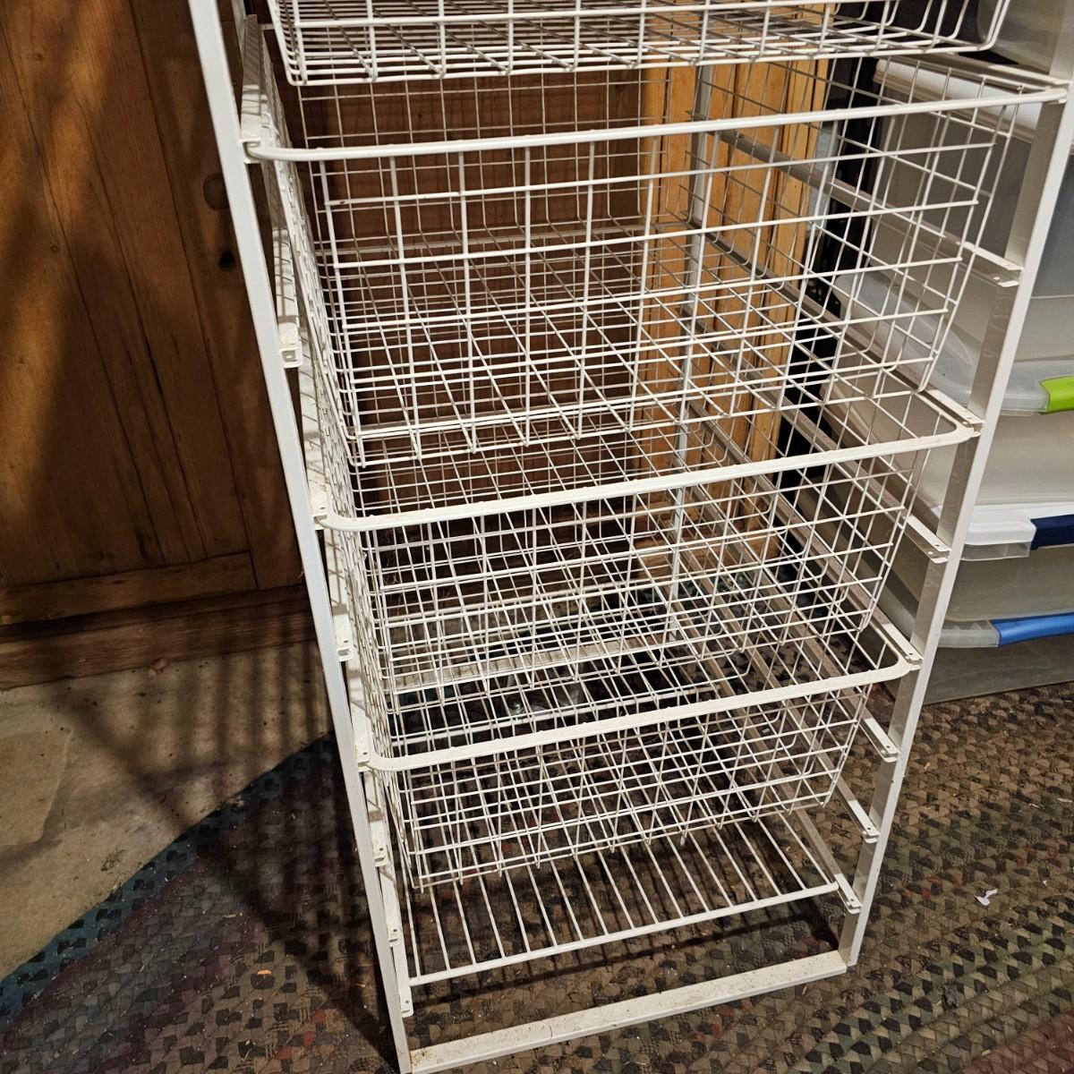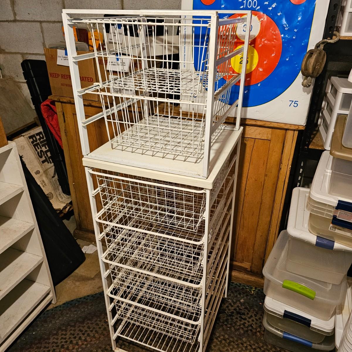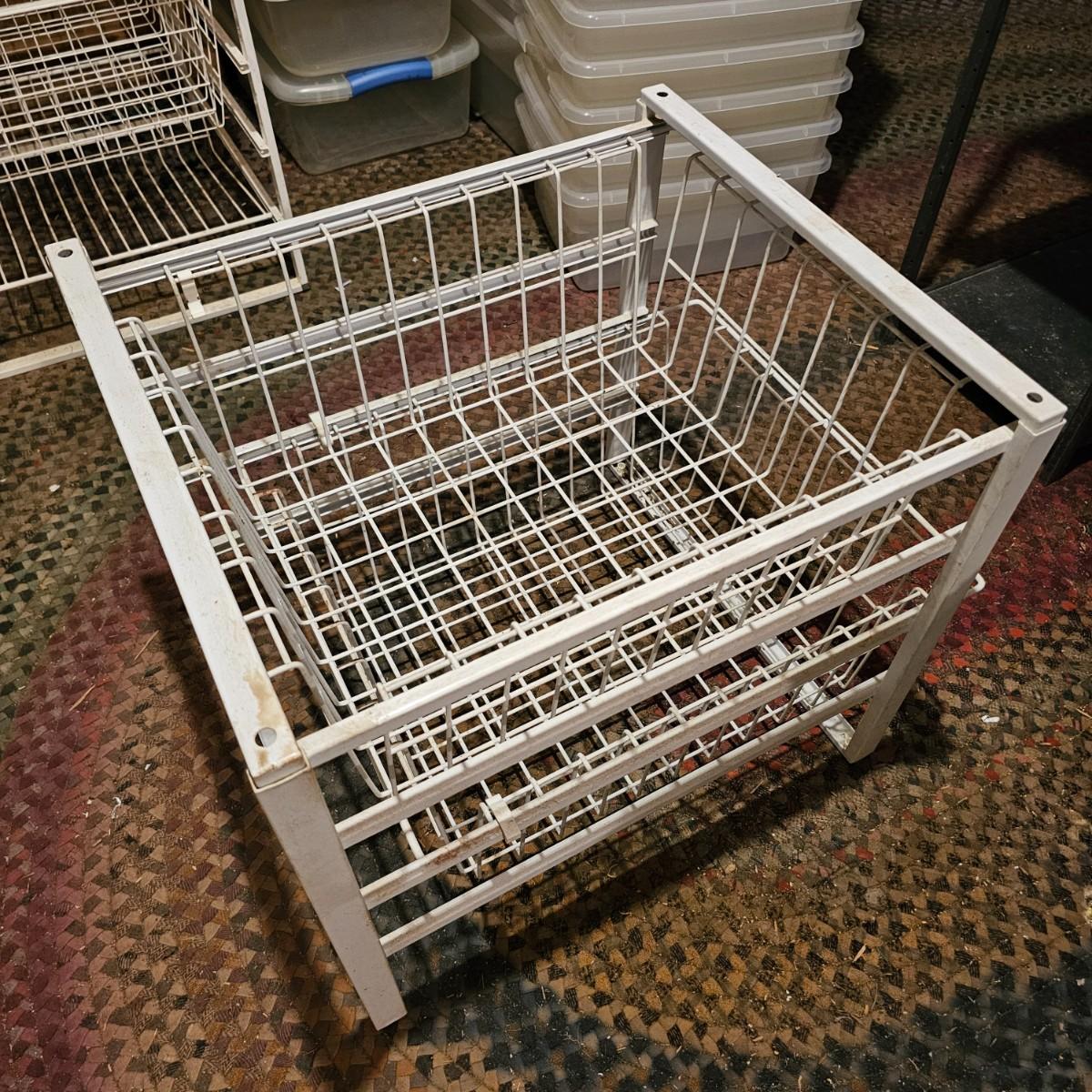 Two pieces of wire basket storage in sliding racks. Small unit has two baskets, measures 17.5" x 19" x 17.5" H. Larger item has four baskets, they slide forward or backward. Measures 18" x 21.5" x 41"H. Needs some cleaning. See photos for details. Local pickup only.