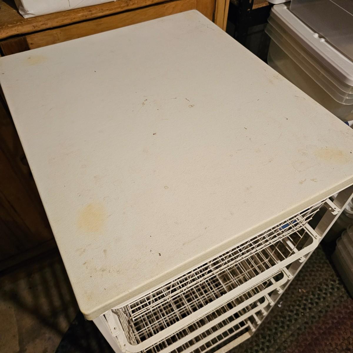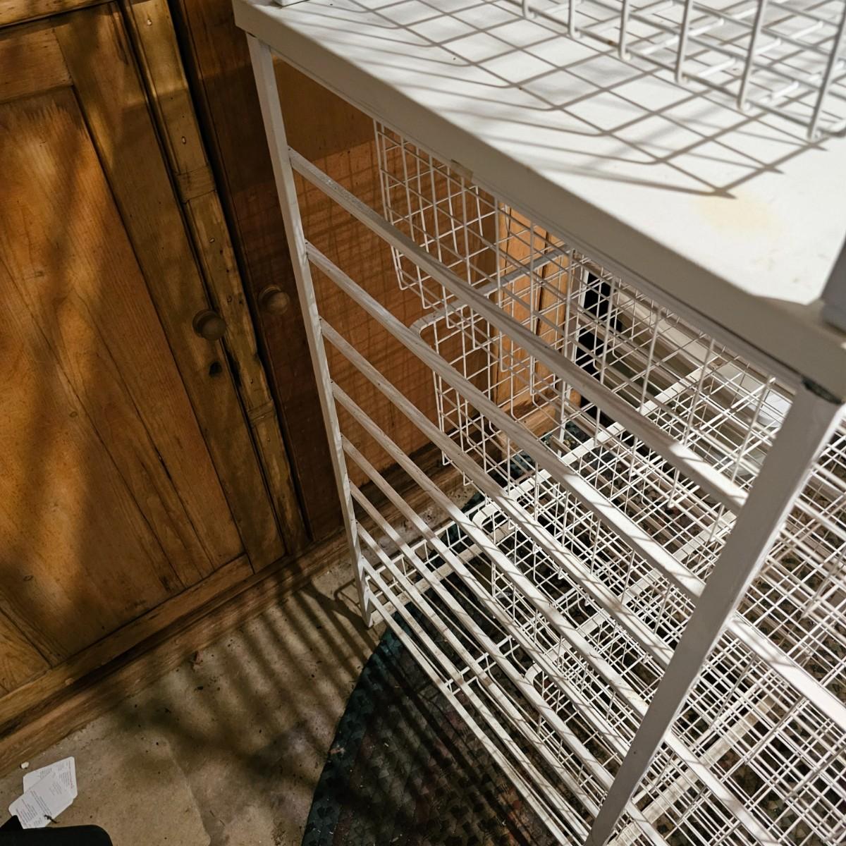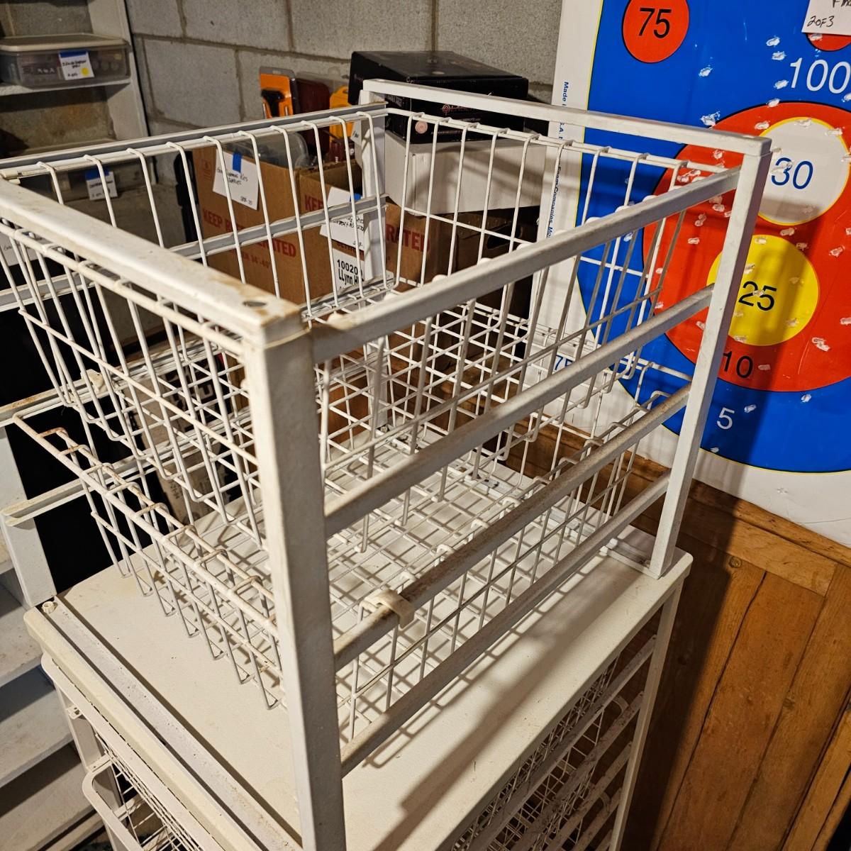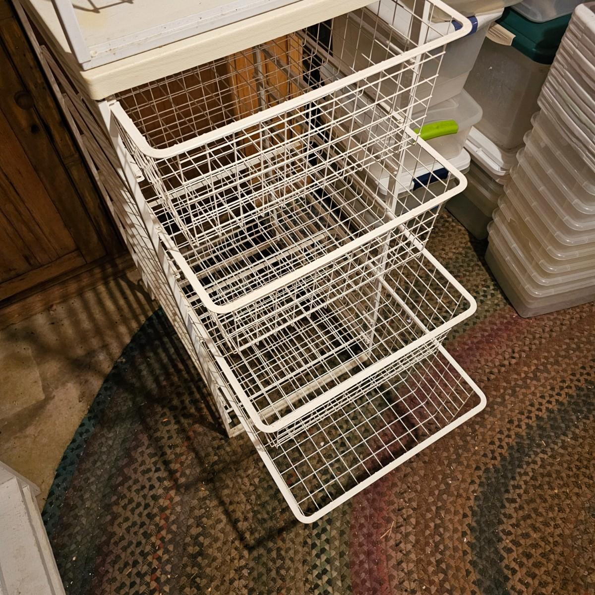 Two pieces of wire basket storage in sliding racks. Small unit has two baskets, measures 17.5" x 19" x 17.5" H. Larger item has four baskets, they slide forward or backward. Measures 18" x 21.5" x 41"H. Needs some cleaning. See photos for details. Local pickup only.