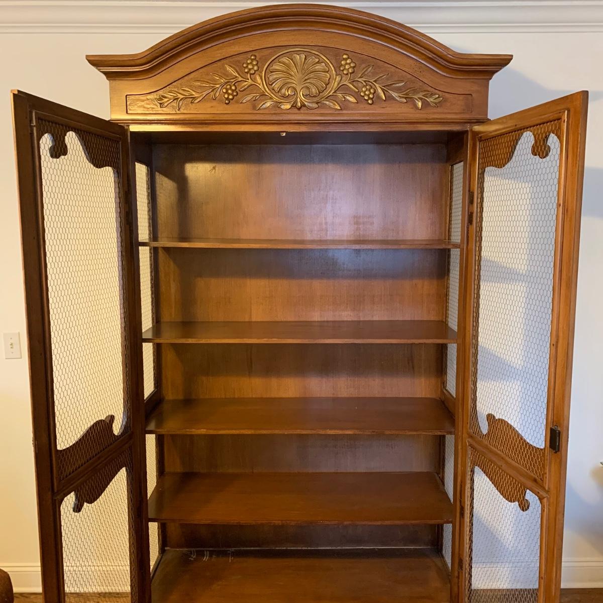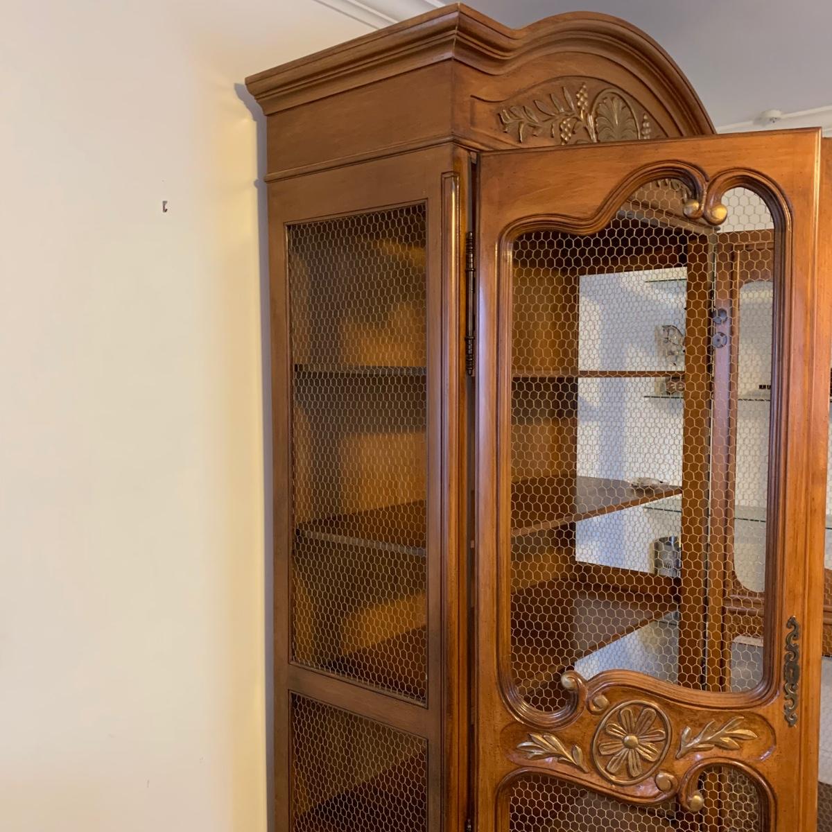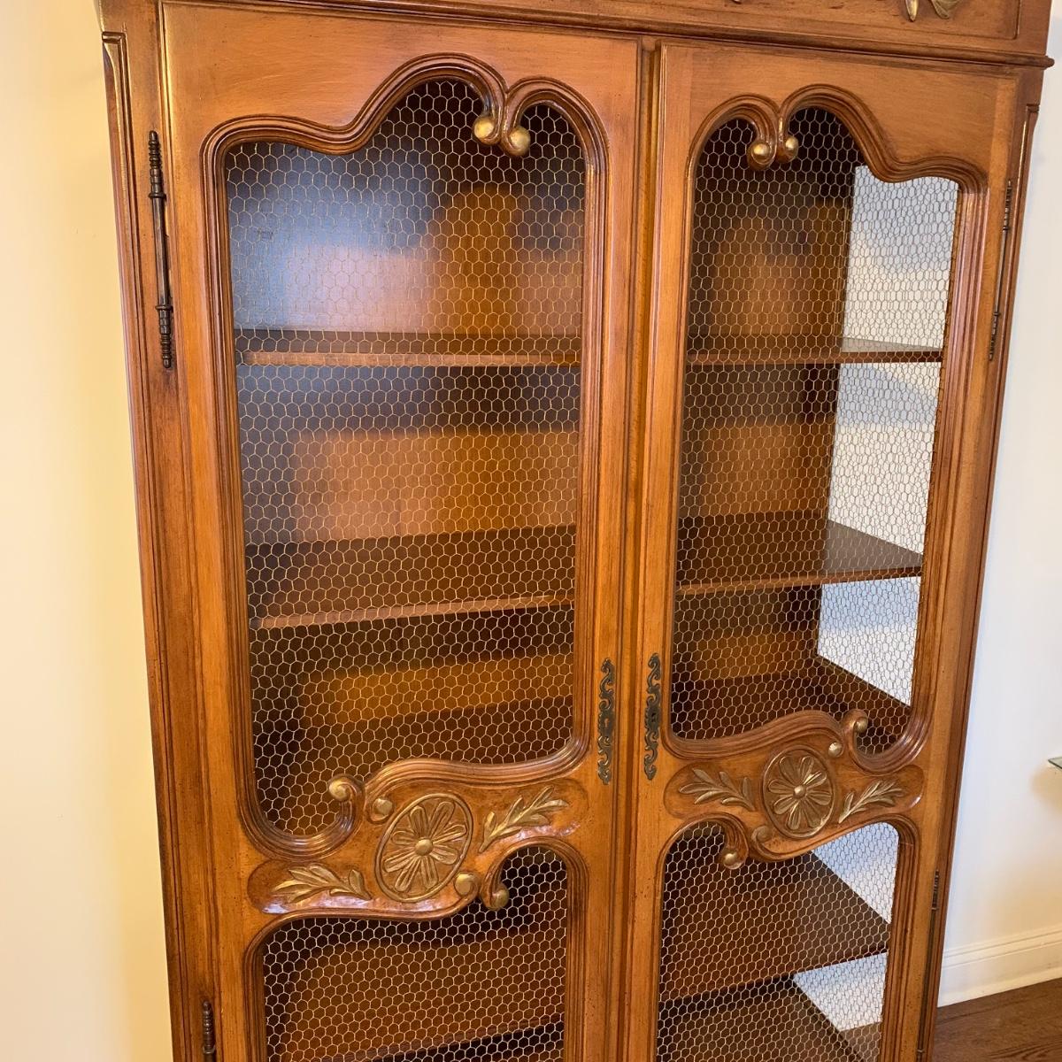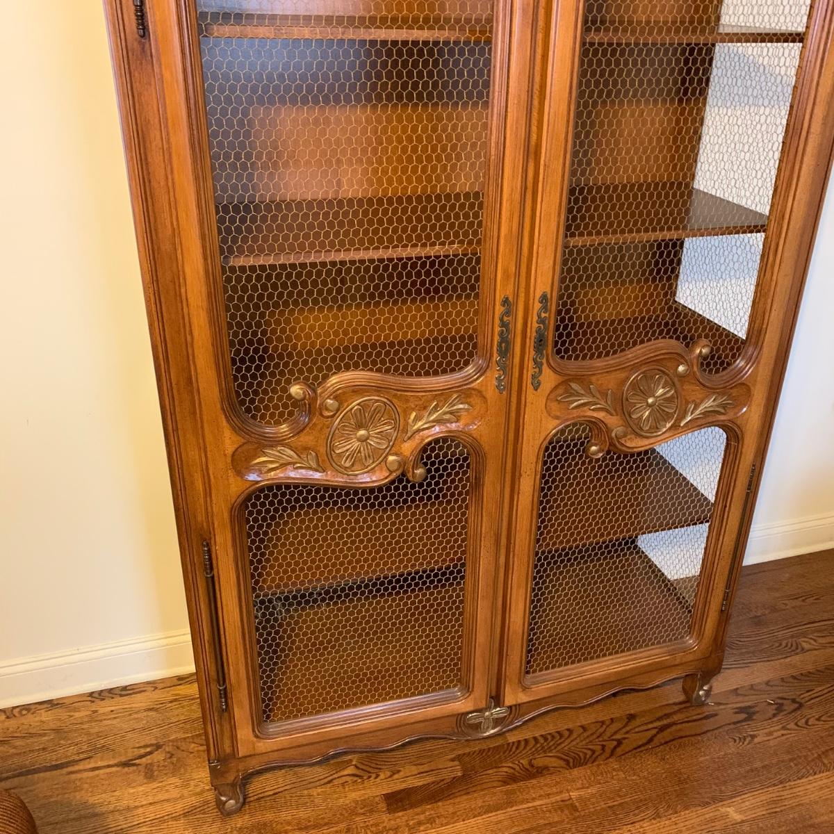 Large wire-front hutch. Hutch has two wire display doors, five shelves, and uses magnetic closure. Hutch features ornate carved wood that appears to be polished walnut. Doors and sides do not have glass panels, only wire. Hutch measures approximately, 52” x 21” x 89”H. Item comes with extra unopened magnetic closure. Hitch has minor blemishes, please see photos for more details.