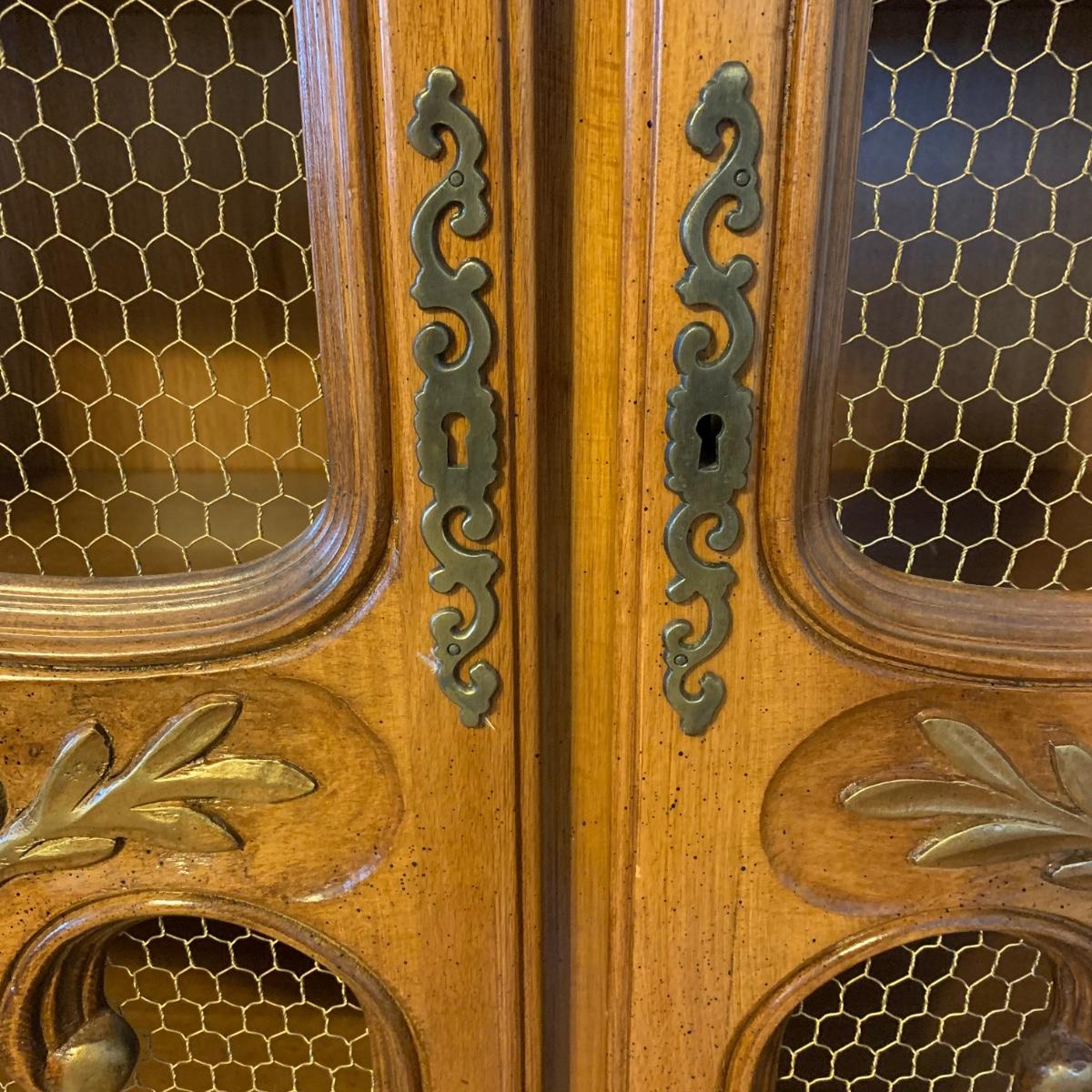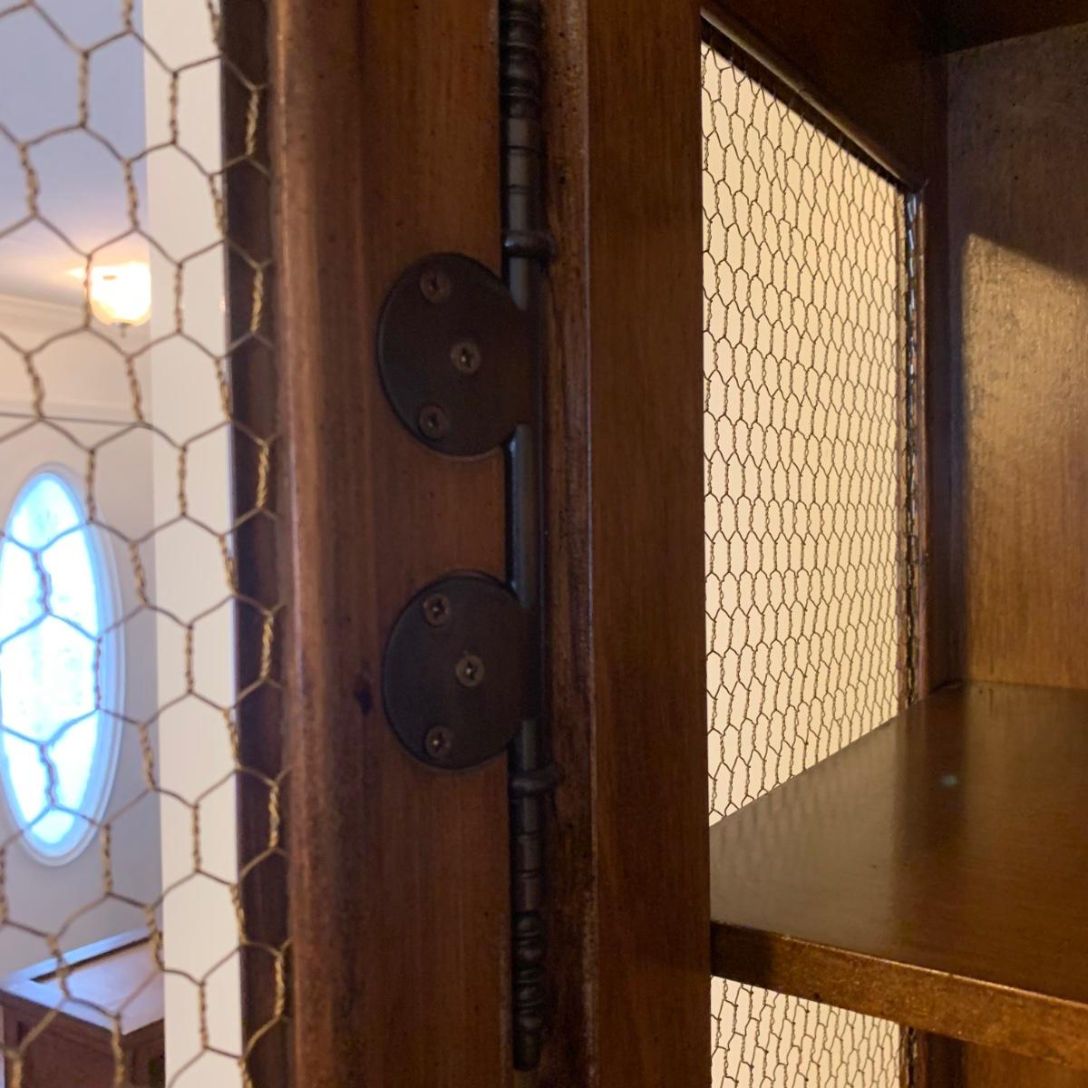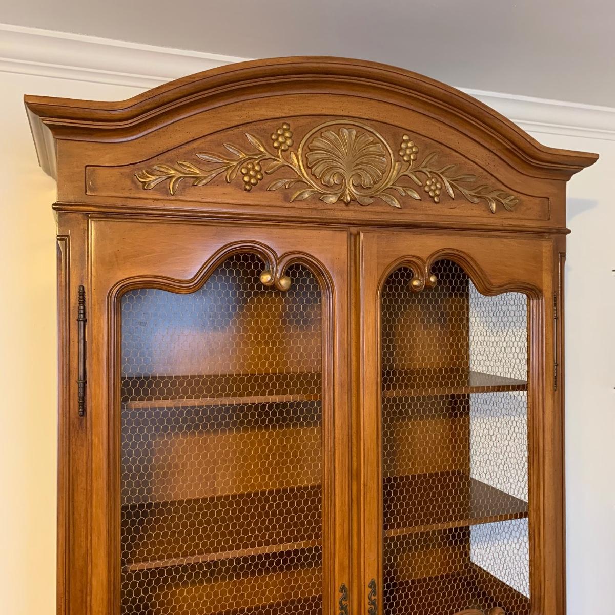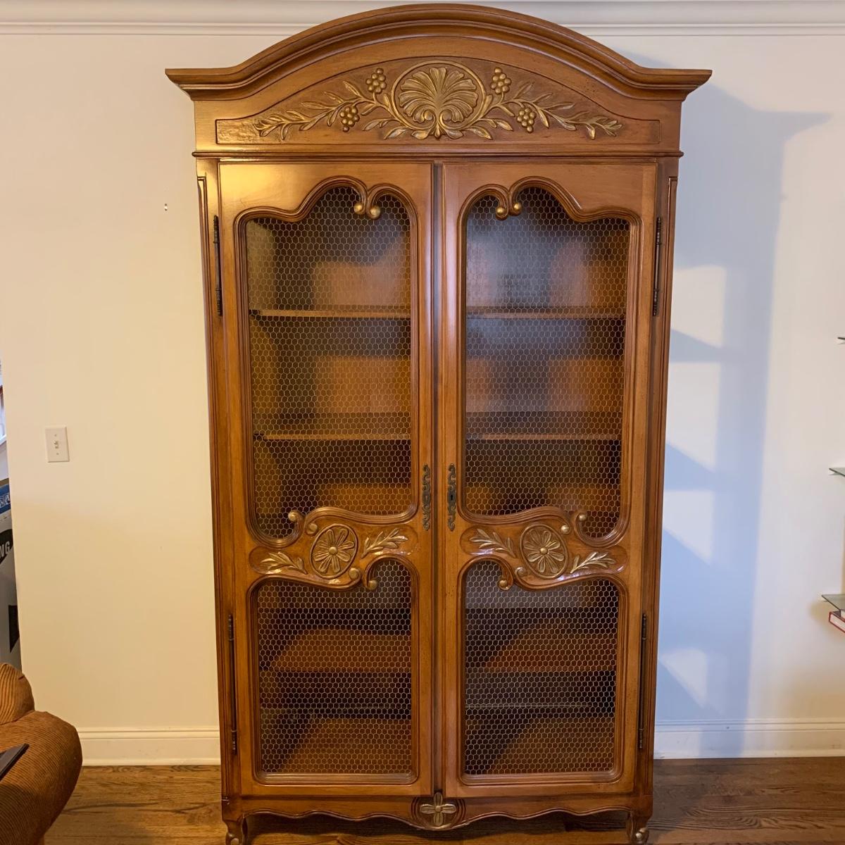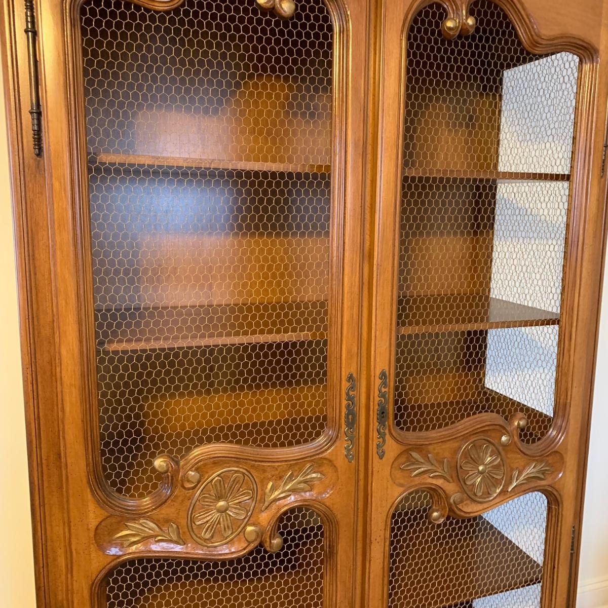 Large wire-front hutch. Hutch has two wire display doors, five shelves, and uses magnetic closure. Hutch features ornate carved wood that appears to be polished walnut. Doors and sides do not have glass panels, only wire. Hutch measures approximately, 52” x 21” x 89”H. Item comes with extra unopened magnetic closure. Hitch has minor blemishes, please see photos for more details.
