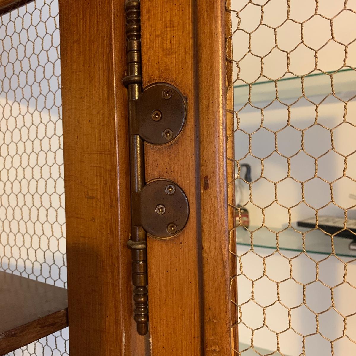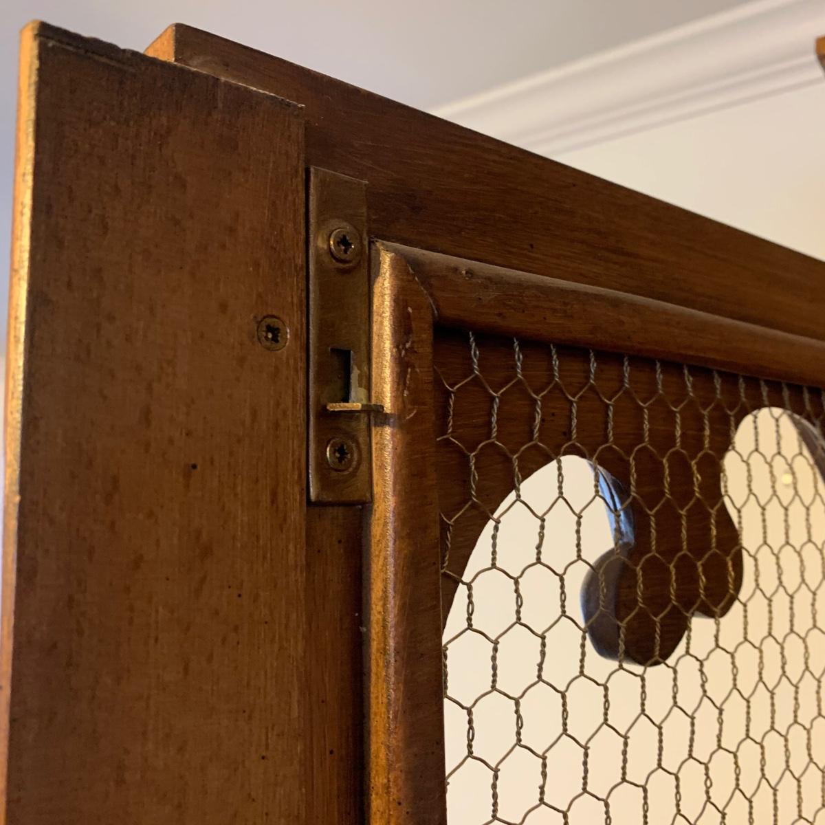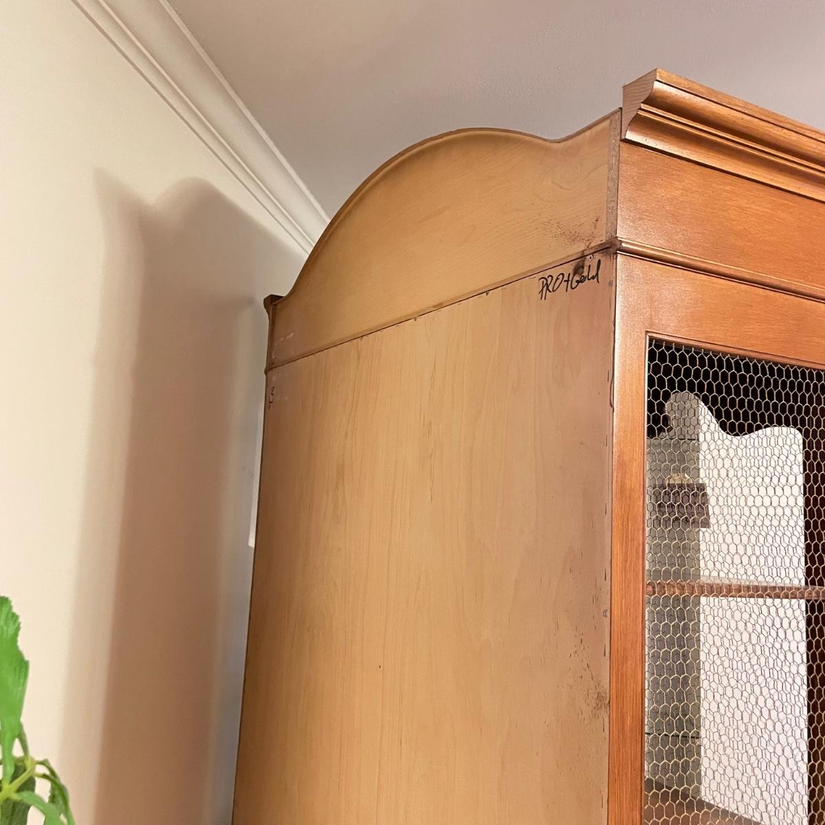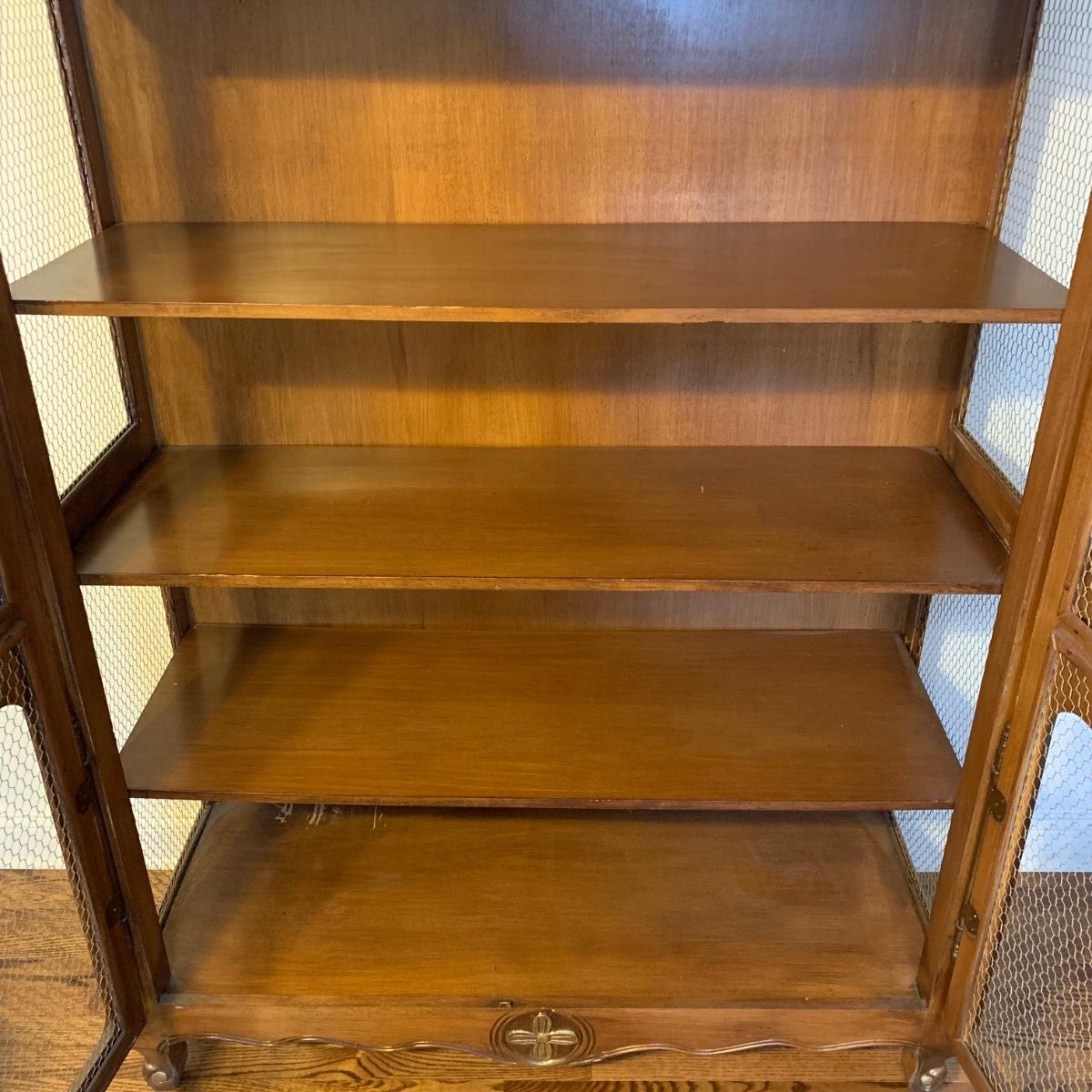 Large wire-front hutch. Hutch has two wire display doors, five shelves, and uses magnetic closure. Hutch features ornate carved wood that appears to be polished walnut. Doors and sides do not have glass panels, only wire. Hutch measures approximately, 52” x 21” x 89”H. Item comes with extra unopened magnetic closure. Hitch has minor blemishes, please see photos for more details.