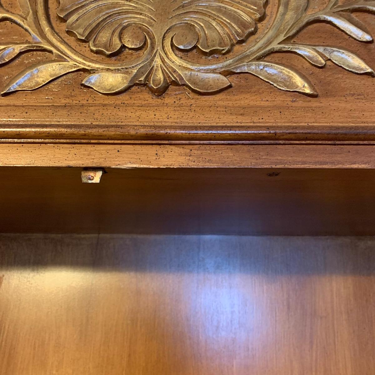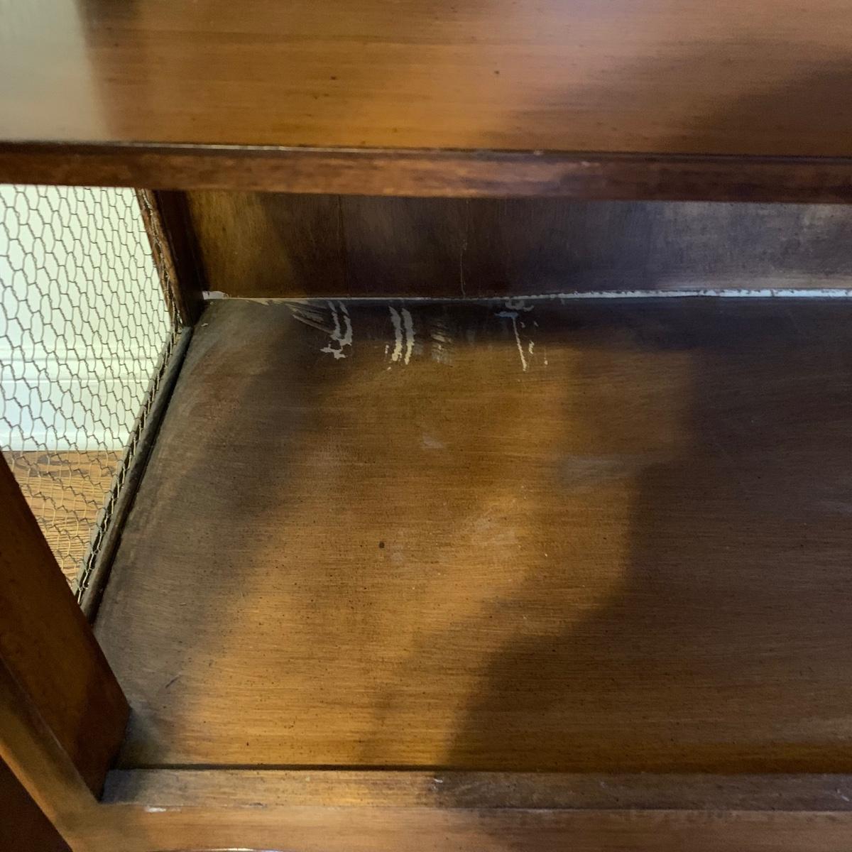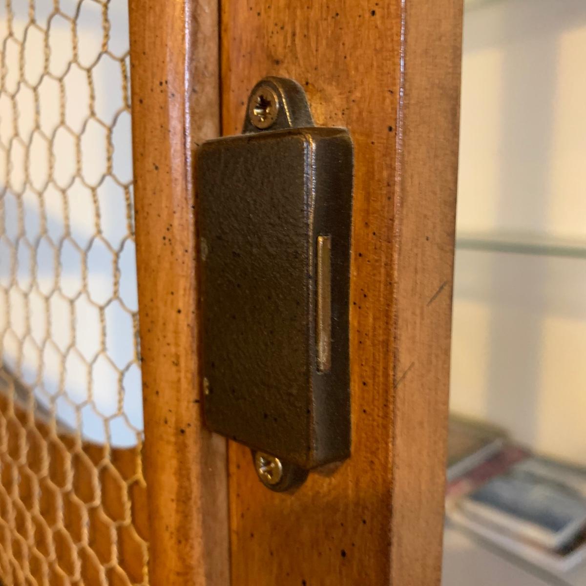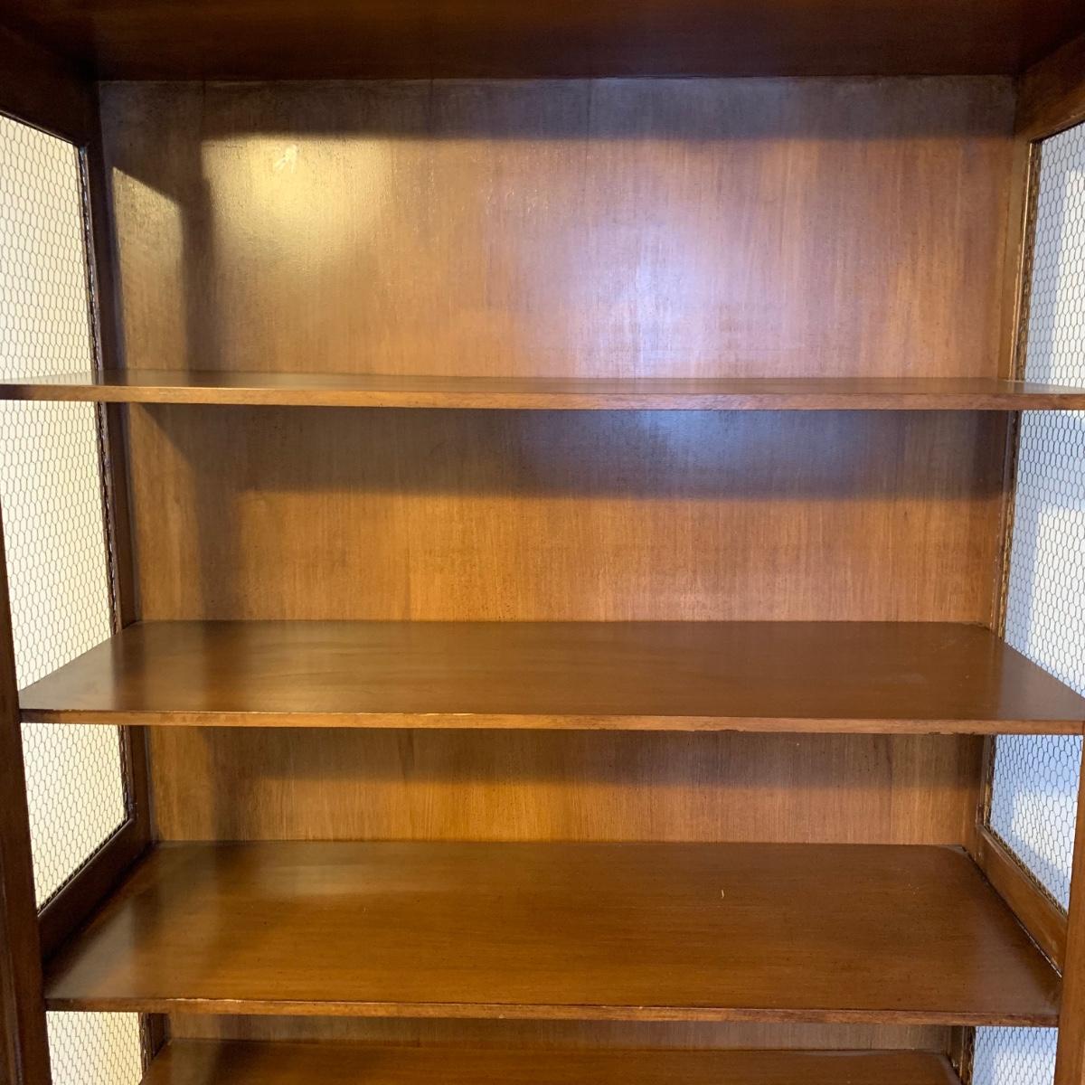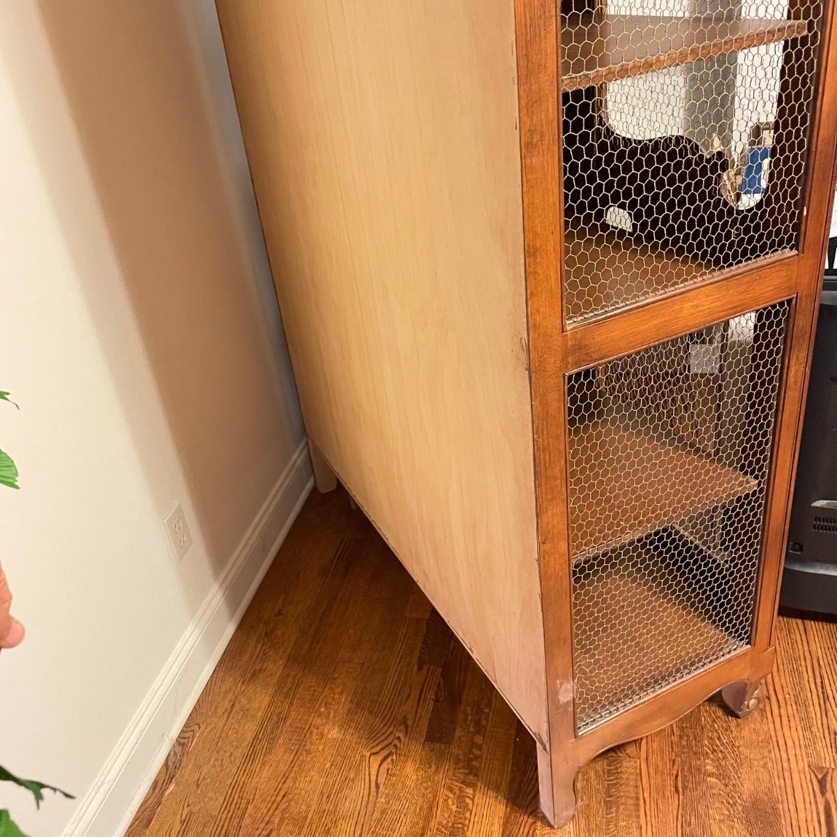 Large wire-front hutch. Hutch has two wire display doors, five shelves, and uses magnetic closure. Hutch features ornate carved wood that appears to be polished walnut. Doors and sides do not have glass panels, only wire. Hutch measures approximately, 52” x 21” x 89”H. Item comes with extra unopened magnetic closure. Hitch has minor blemishes, please see photos for more details.