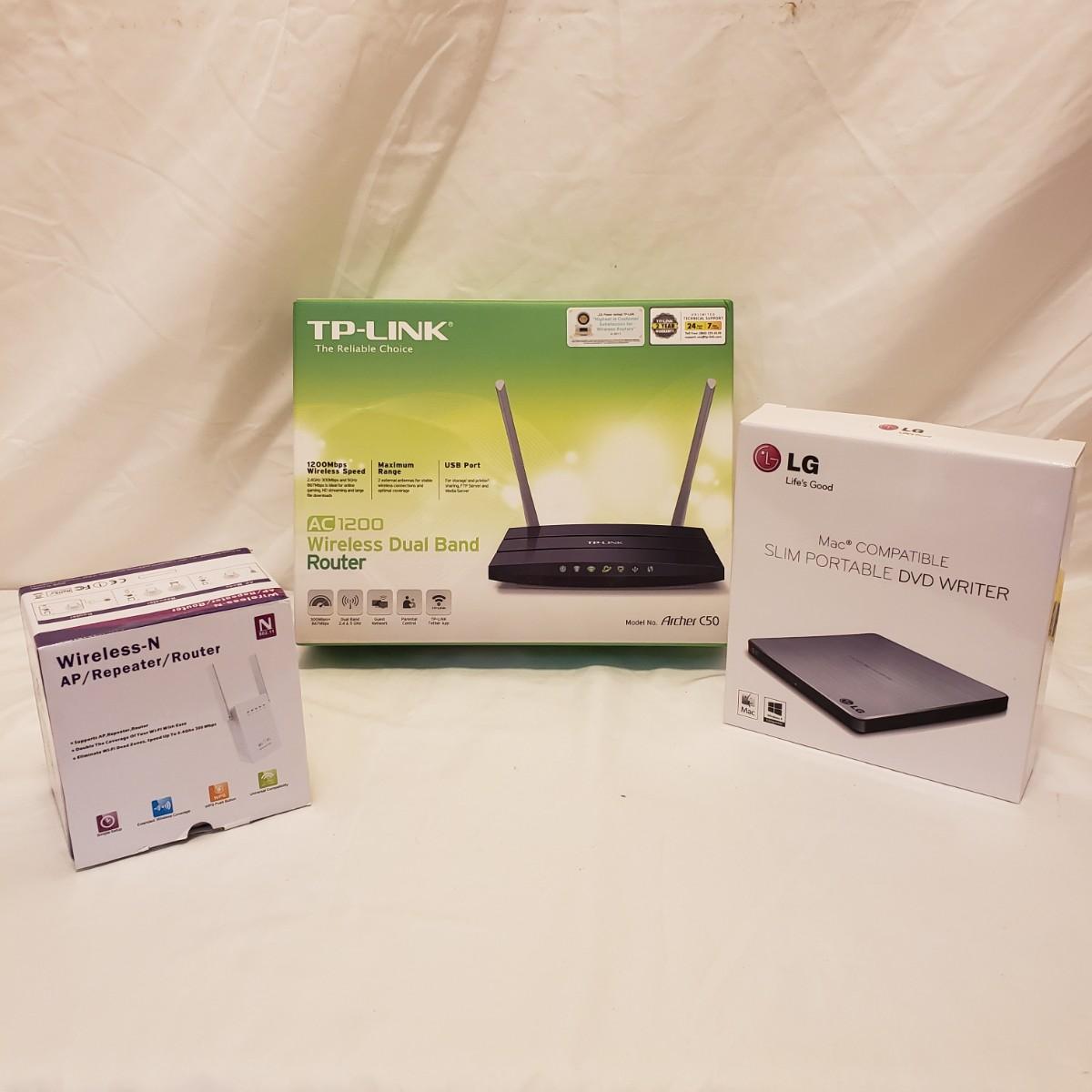 This lot contains 3 electronic products, in the box with owner manuals. We cannot verify if they are new or slightly used. The Wireless-N AP/Repeater/Router provides double coverage for your wifi.