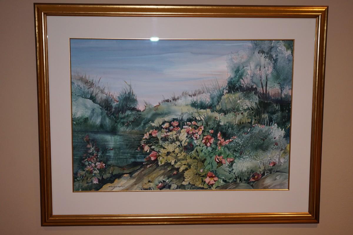 larger size watercolor depicting a pond with wildflowers and grasses. Professionally matted and framed in a very nice gold tone wooden frame.
