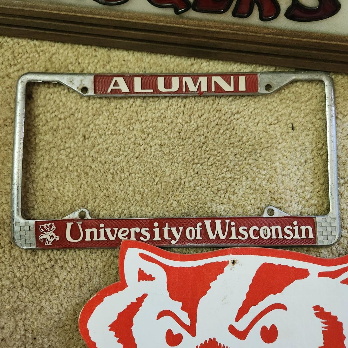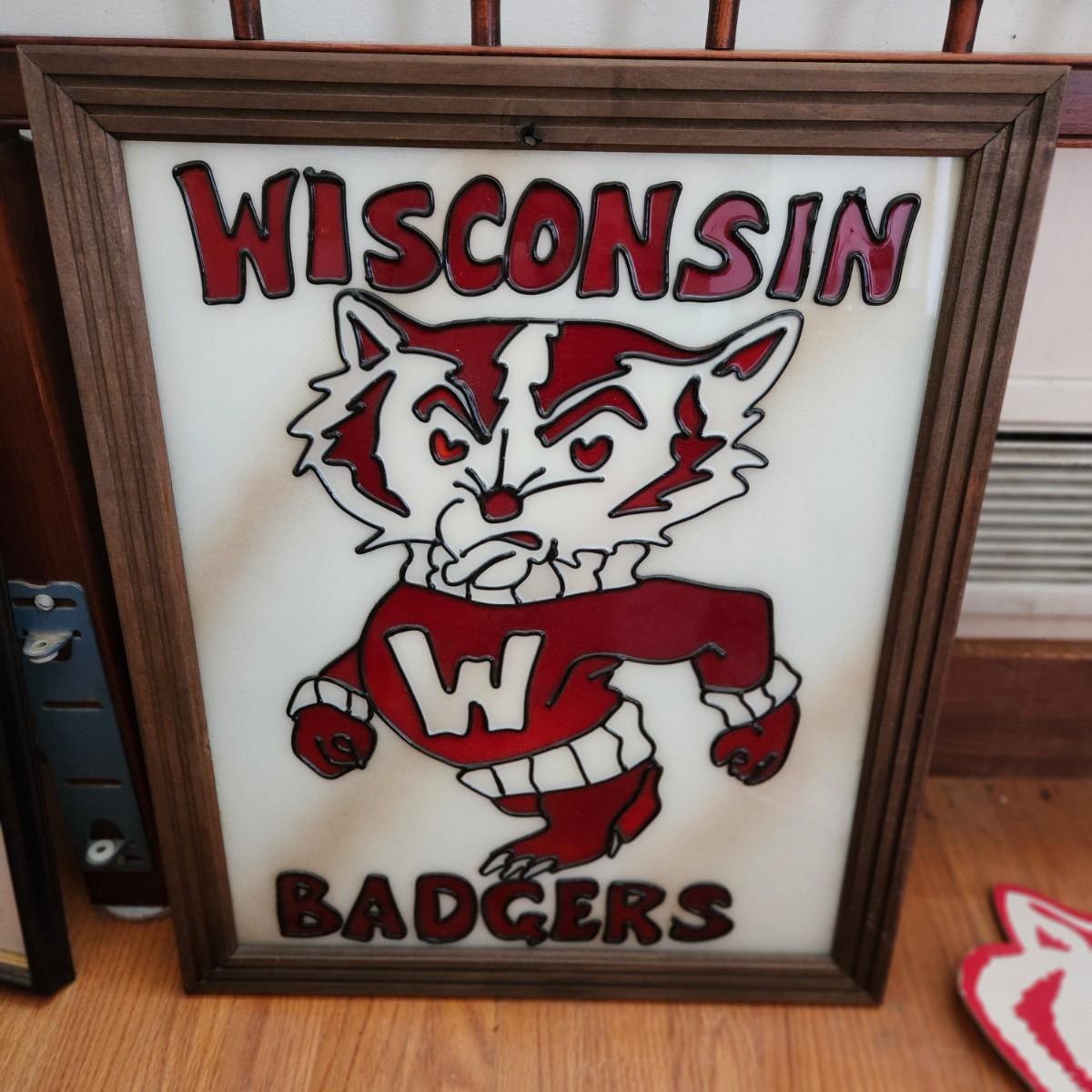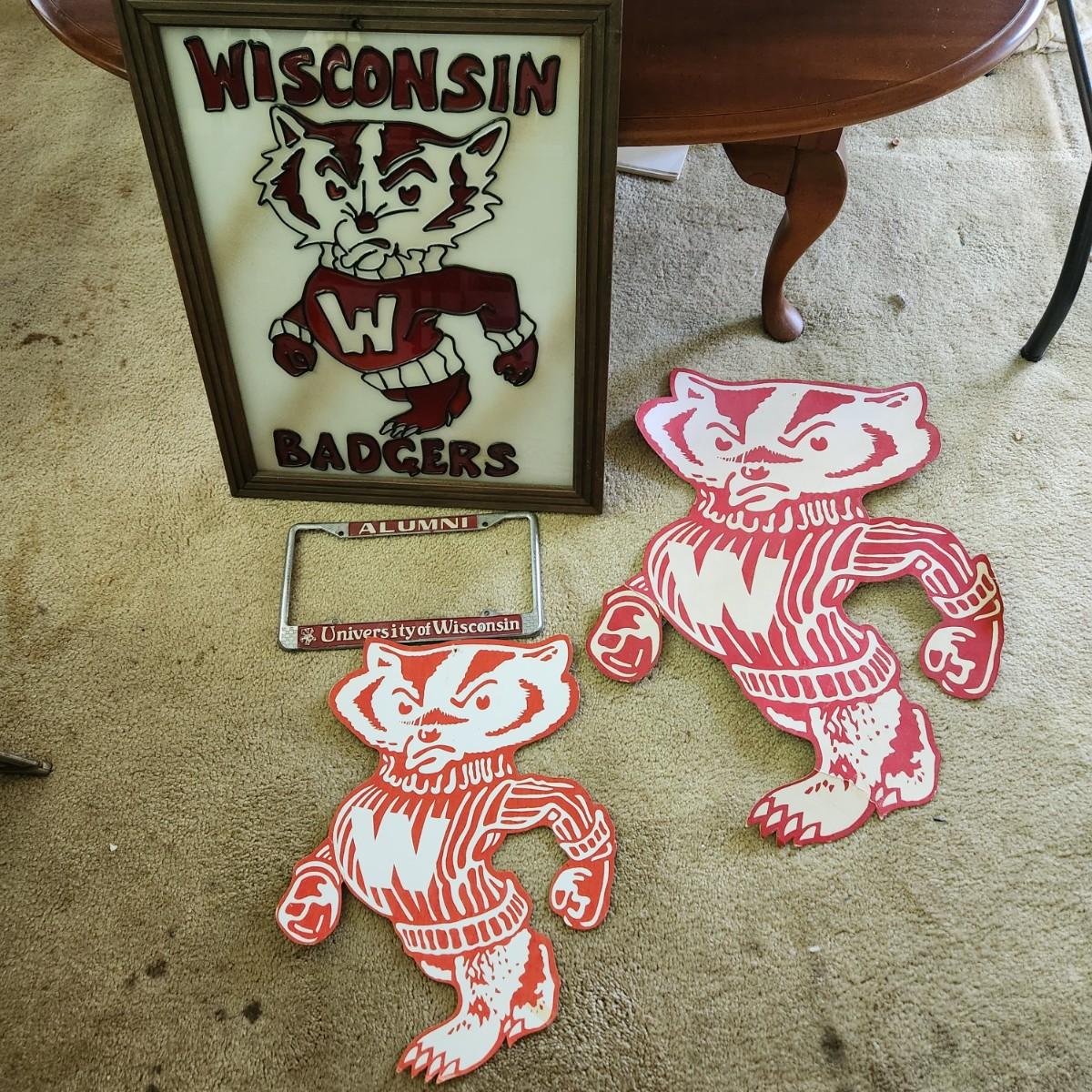 Wisconsin Badgers 2 Cardboard , 1 Glass Framed Art, license Plate Cover
