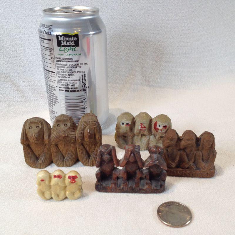 A set of 5 miniature Wisdom Monkeys - See no evil, Hear no evil, Speak no evil. The monkeys are made of various materials such as wood, clay, ceramic, plastic and soap stone. There is some paint loss on the painted ones - overall in very good condition and a nice little collection.