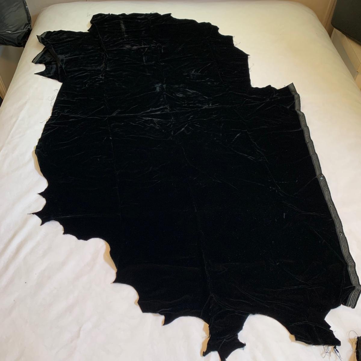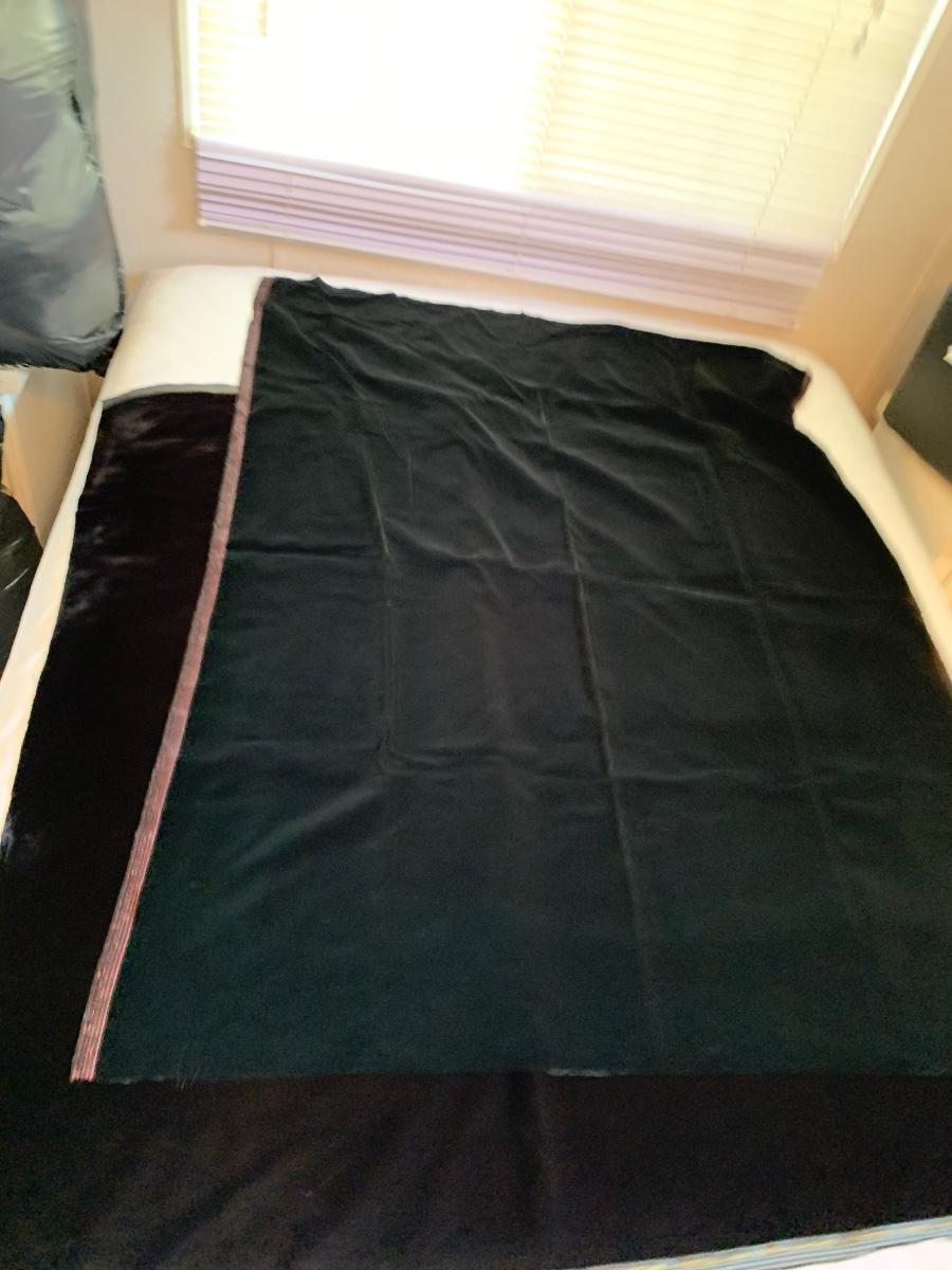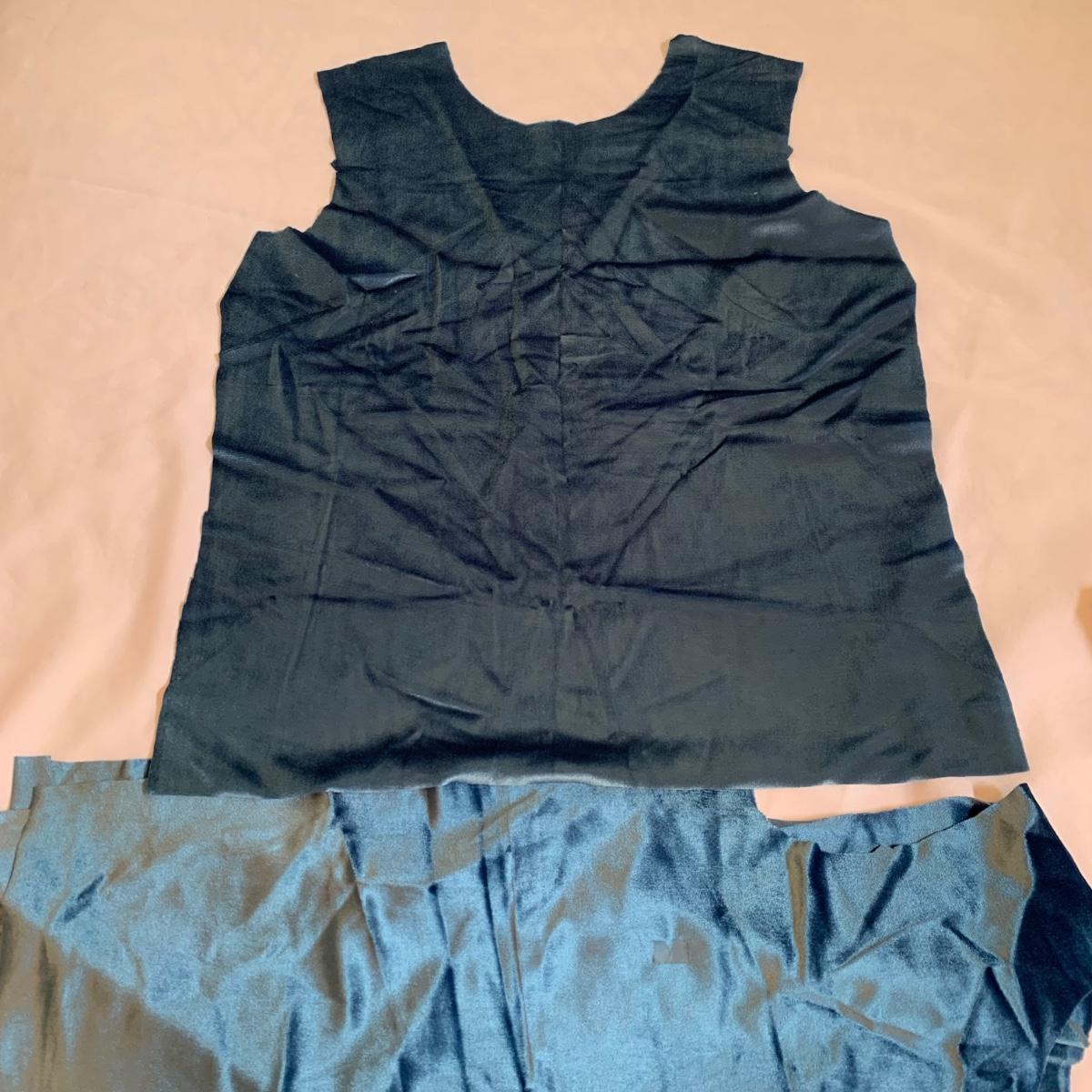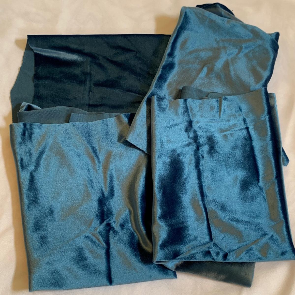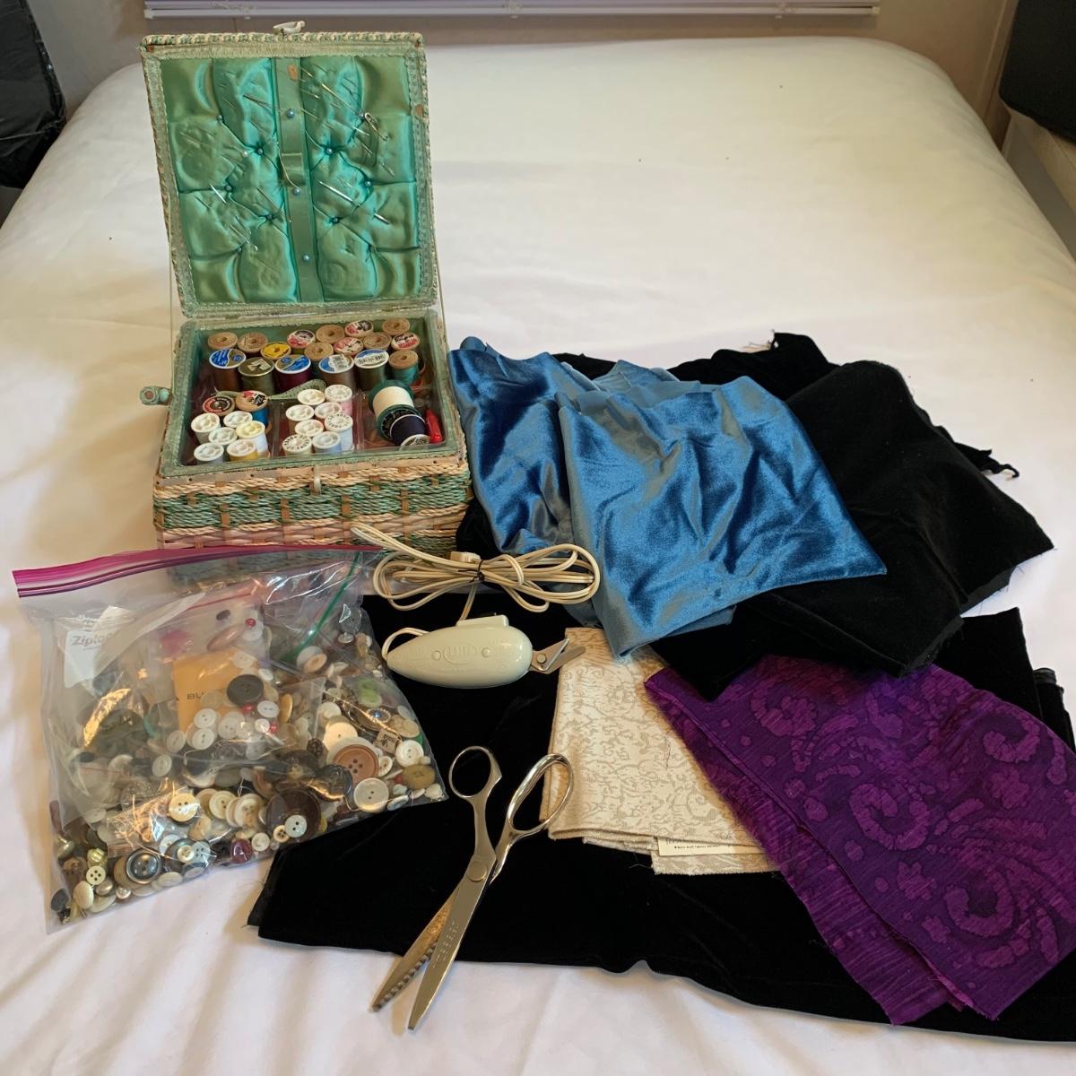 A variety of sewing and crafting supplies. Lot includes a pair of Wiss pinking shears, Dritz electric scissors, a variety of velvet fabric, a sewing kit, and a bag full of buttons. The Dritz scissors powered on when plugged in. The sewing kit includes a lot of thread, a measuring tape, a thimble, seam rippers, some yarn and embroidery thread, crochet hooks, a tomato pin cushion and pins, a sewing gauge, a needle threader, weights, and more. The fabric selection includes a few larger pieces of velvet fabric and some scraps. Four pieces of blue velvet all cut in the shape of a tank top. The largest piece of black velvet is 52” x 40” and there’s another one just slightly smaller.