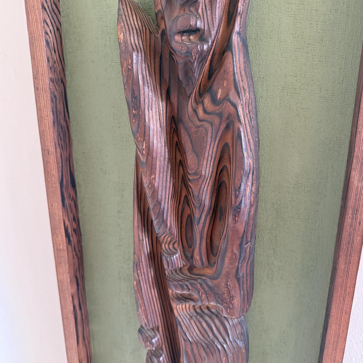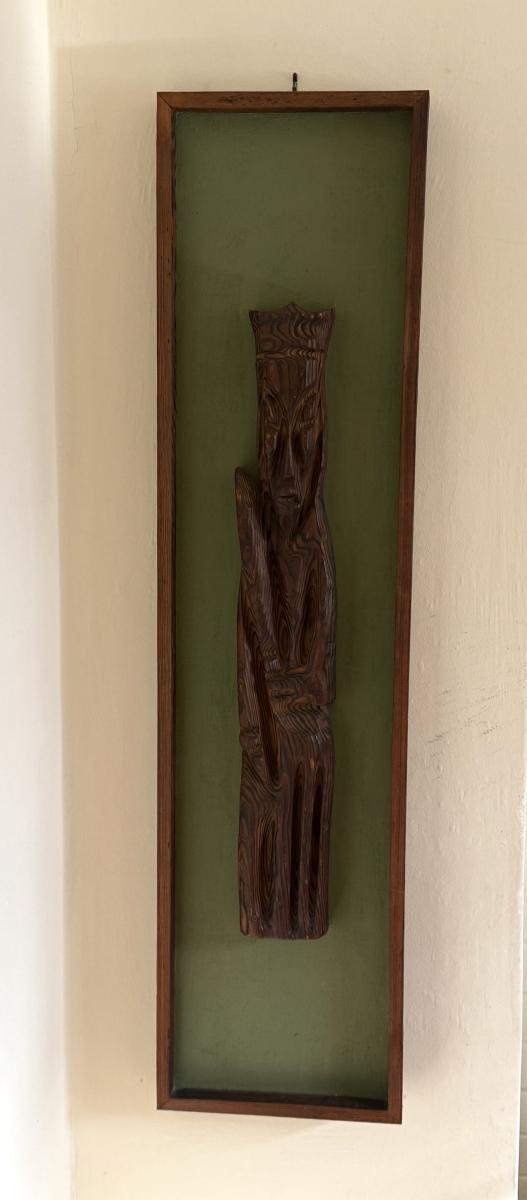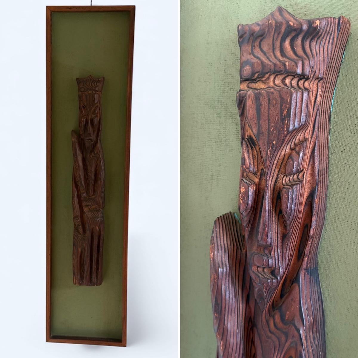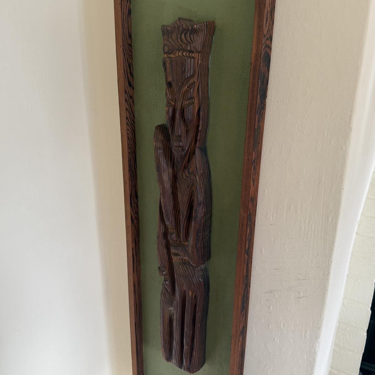 This unique wall art piece appears to be a Witco or very similar item. Carved king-like figure is mounted on a board covered in a muslin-like fabric that has been pained a sage green color. This is all within a natural wood frame that measures 12” x 1.75” x 48”H. Carving protrudes farther from the wall than the frame does.