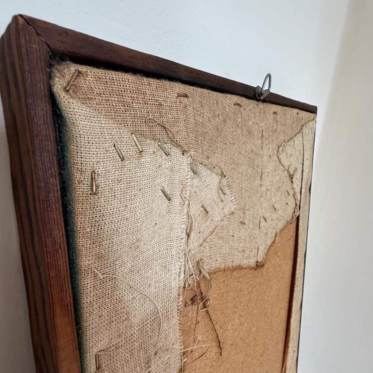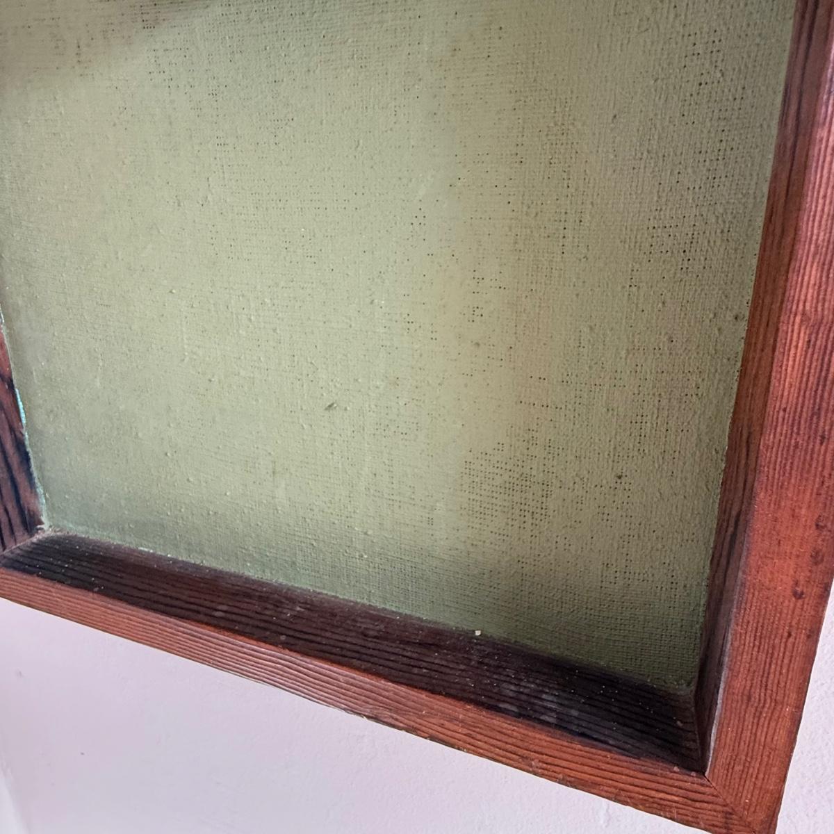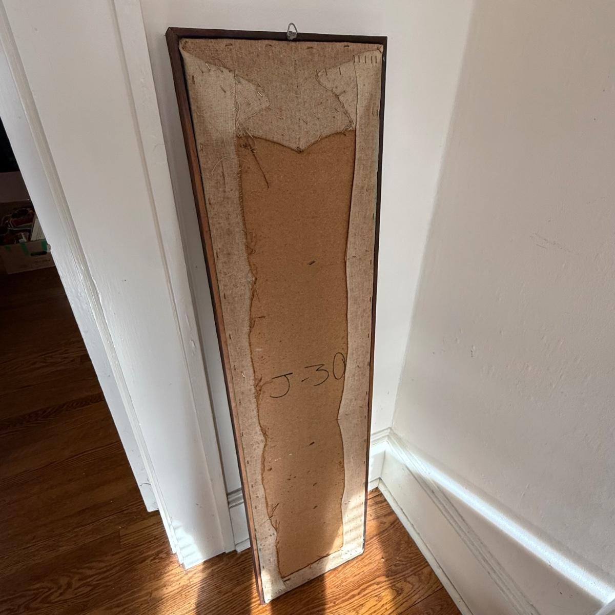 This unique wall art piece appears to be a Witco or very similar item. Carved king-like figure is mounted on a board covered in a muslin-like fabric that has been pained a sage green color. This is all within a natural wood frame that measures 12” x 1.75” x 48”H. Carving protrudes farther from the wall than the frame does.