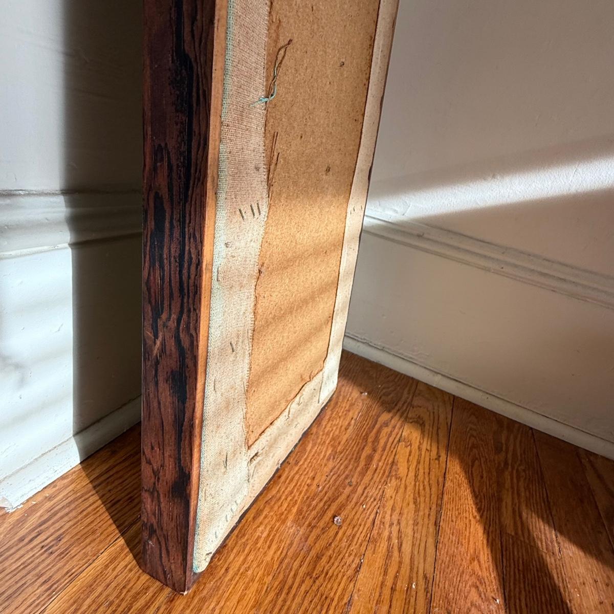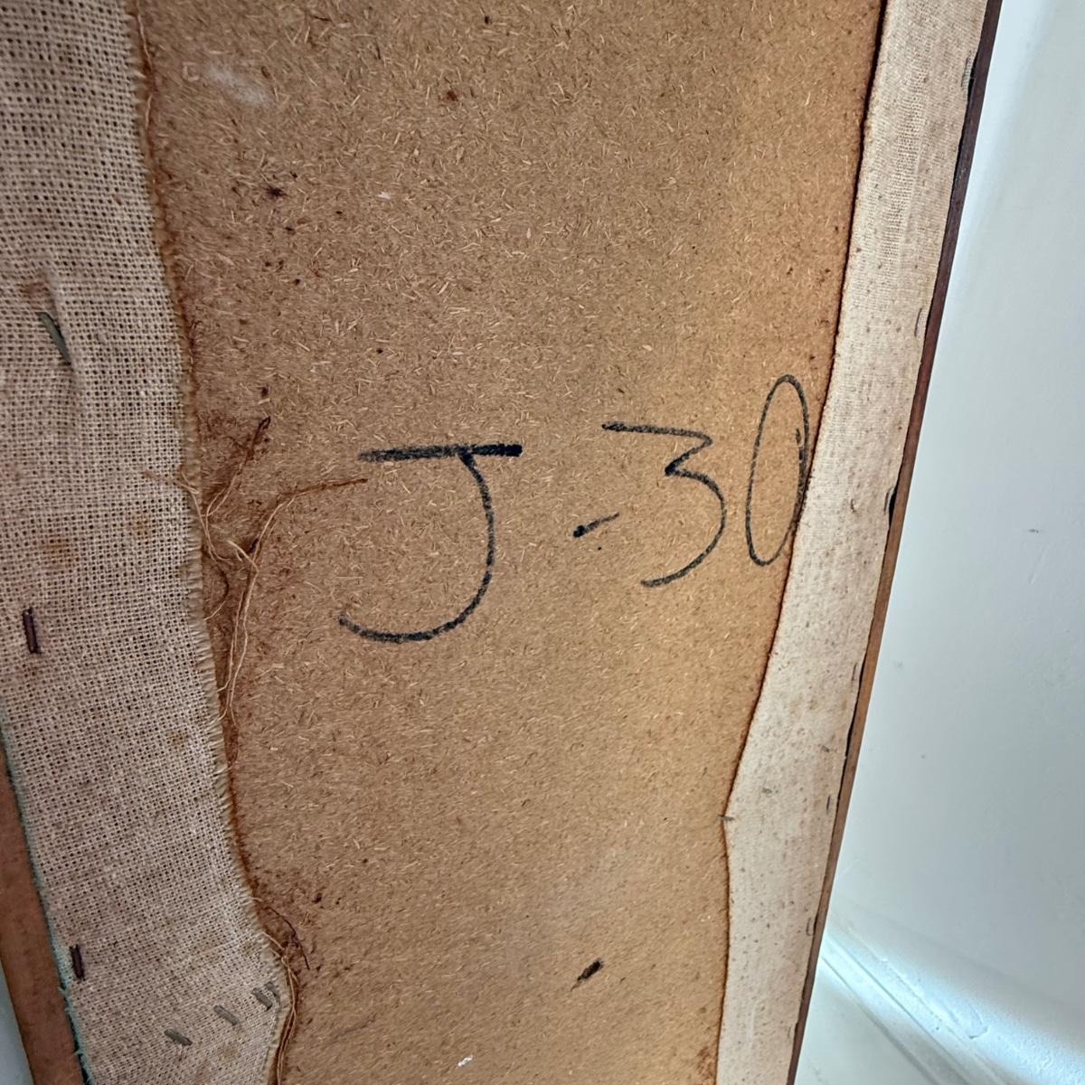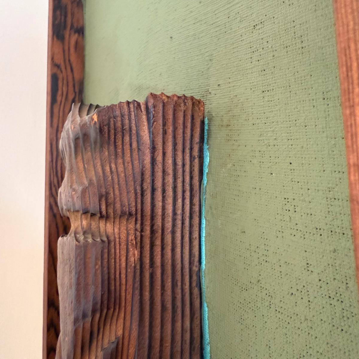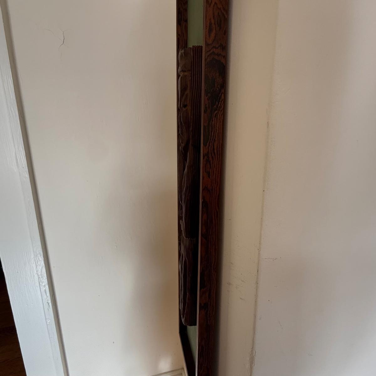 This unique wall art piece appears to be a Witco or very similar item. Carved king-like figure is mounted on a board covered in a muslin-like fabric that has been pained a sage green color. This is all within a natural wood frame that measures 12” x 1.75” x 48”H. Carving protrudes farther from the wall than the frame does.