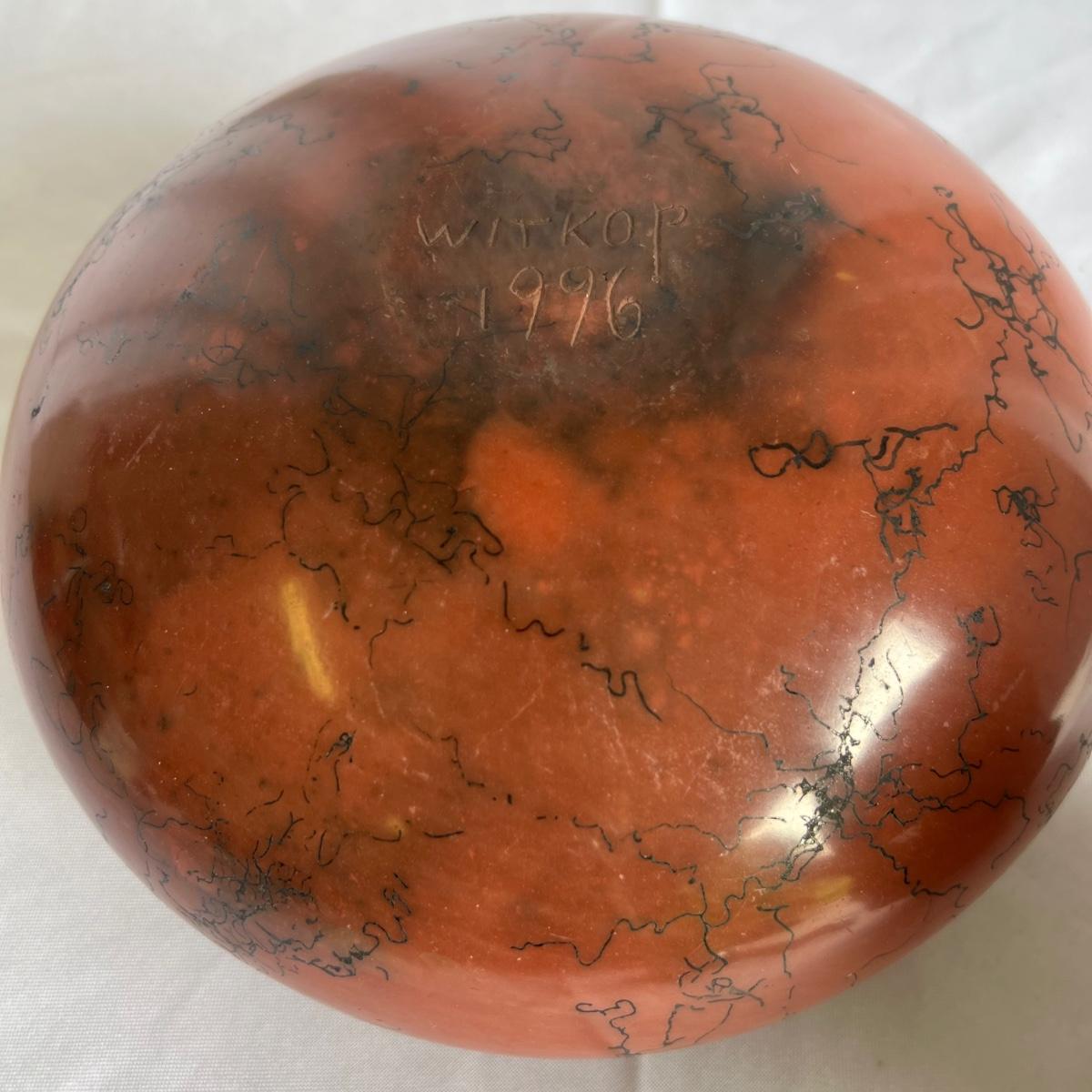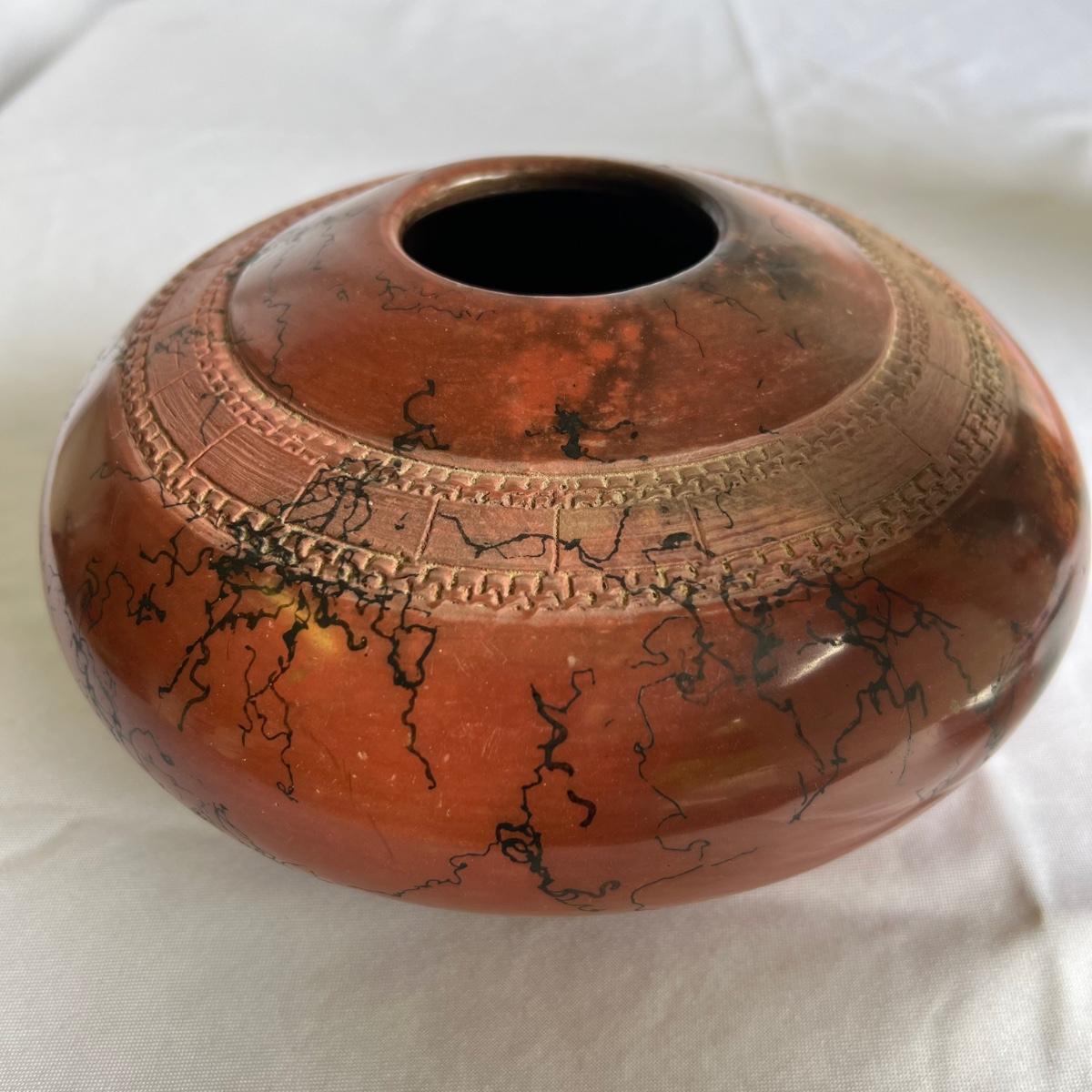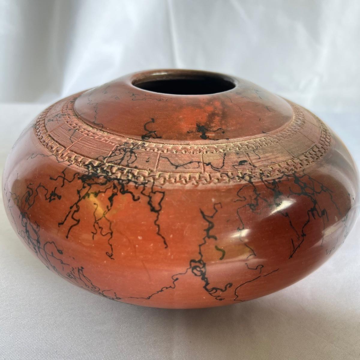 This beautiful pottery bowl is signed Witkop. It’s a burnished red clay with horse hair design.
