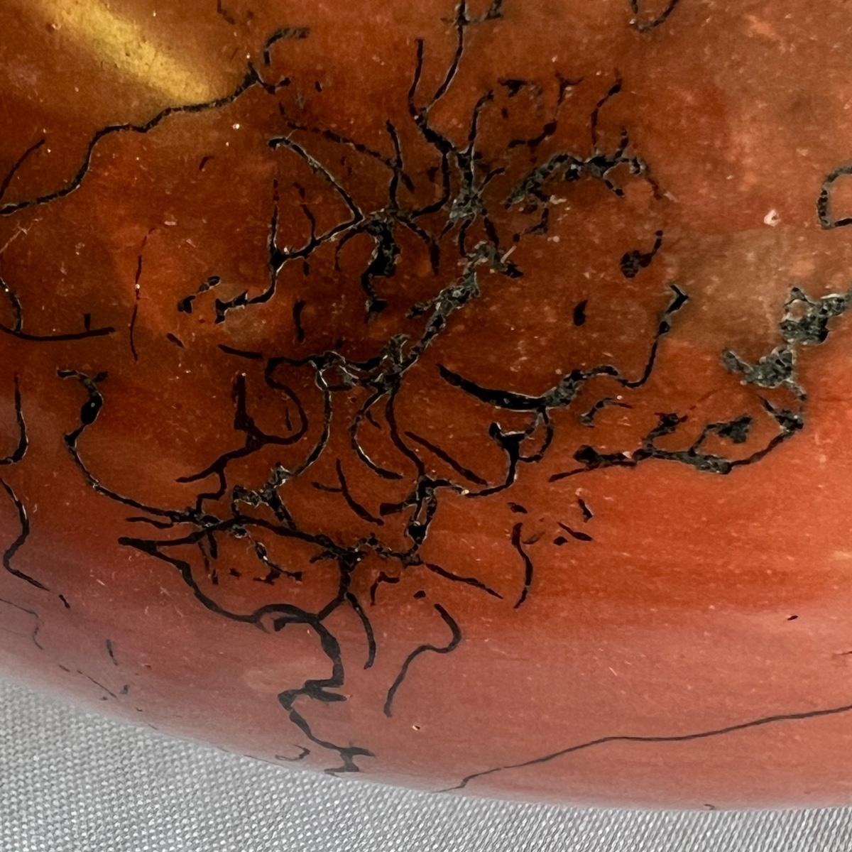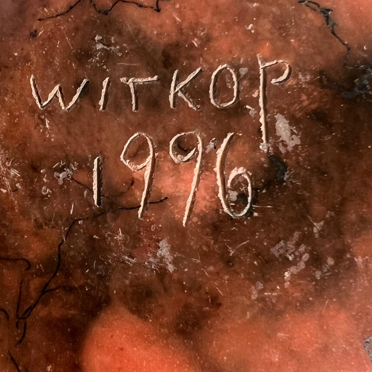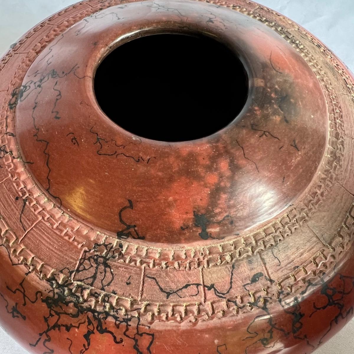 This beautiful pottery bowl is signed Witkop. It’s a burnished red clay with horse hair design.