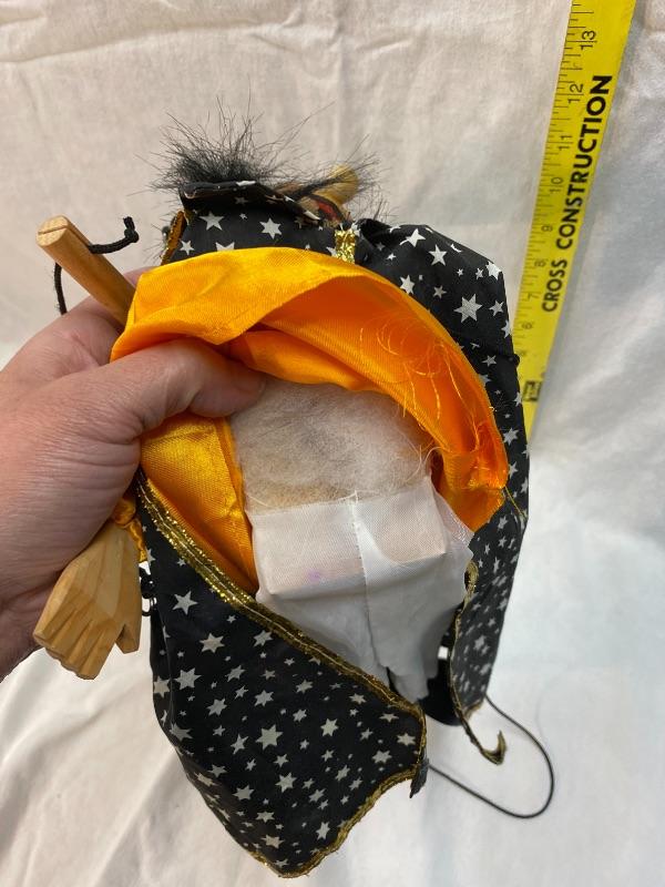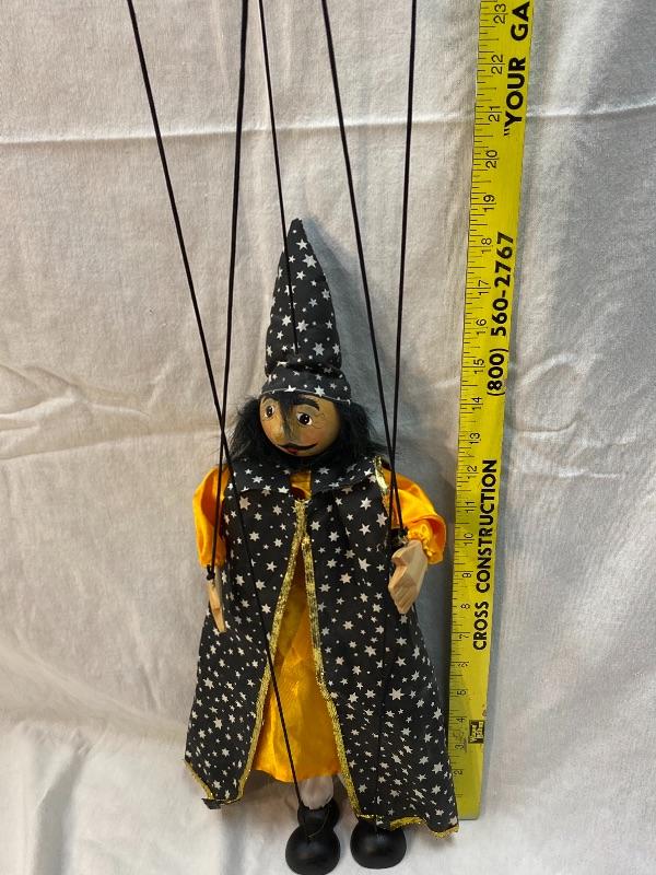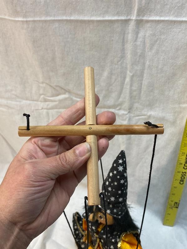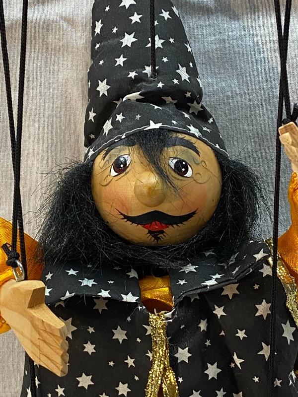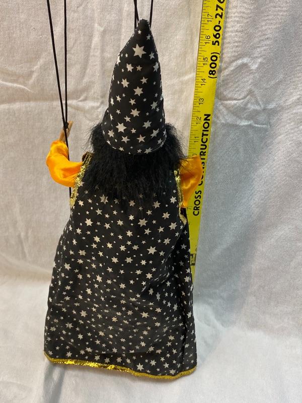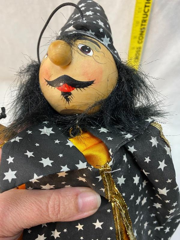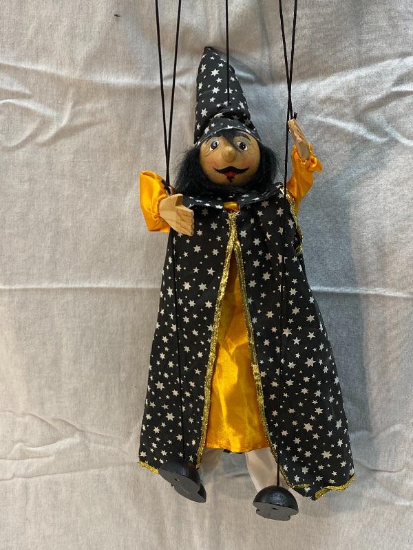 Wizard marionette puppet. Wood block body, hands, feet, and head. Wearing a black cape and hat with stars. Hand painted face. Simple cross top strung, hands are on the same post. About 18" body.