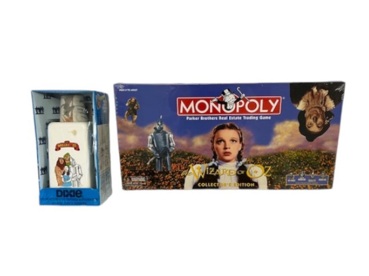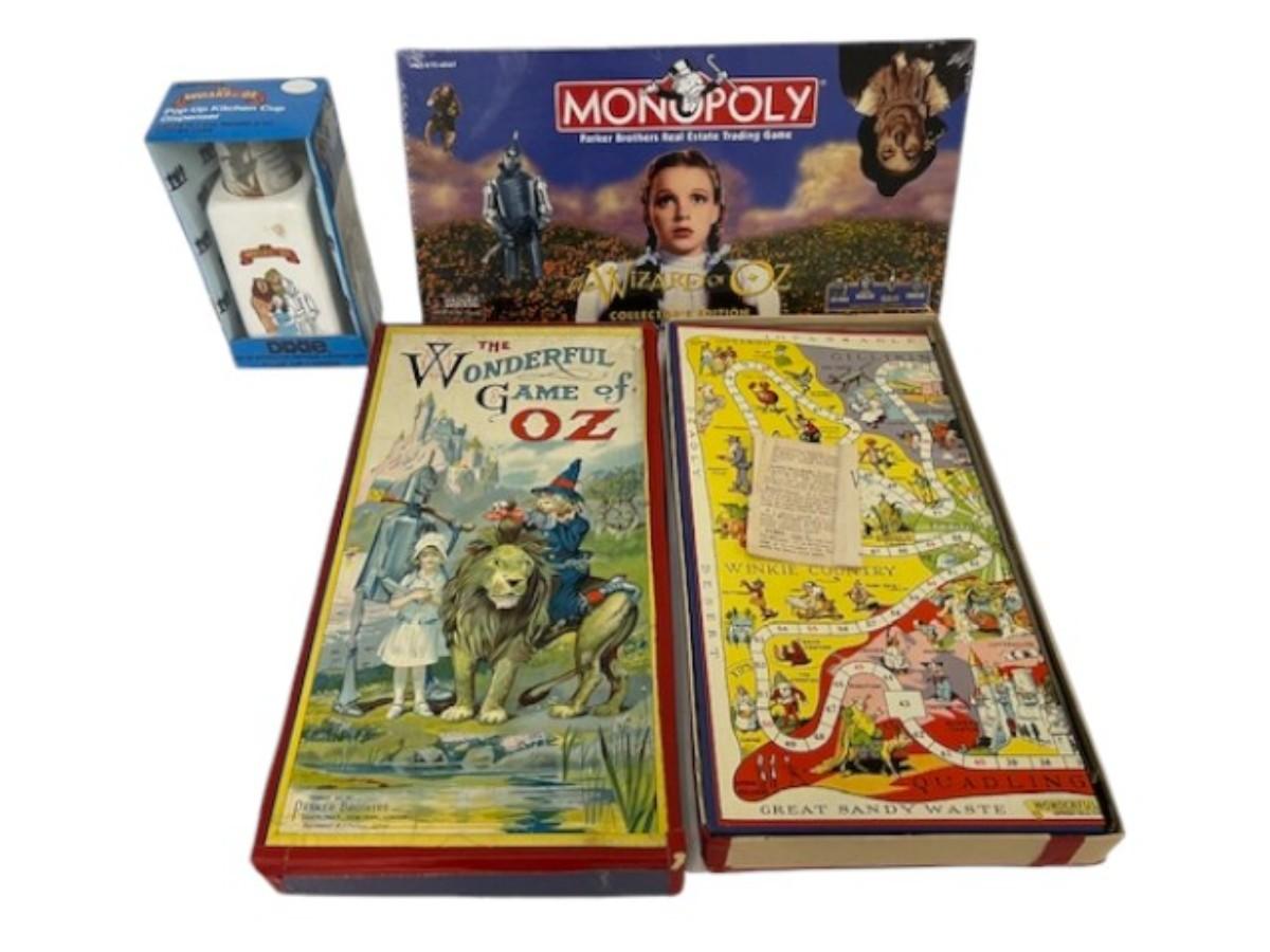 Includes NOS Monopoly, NOS cup dispenser, and vintage "The Wonderful Game of Oz." Total of 3 pieces. [BS]