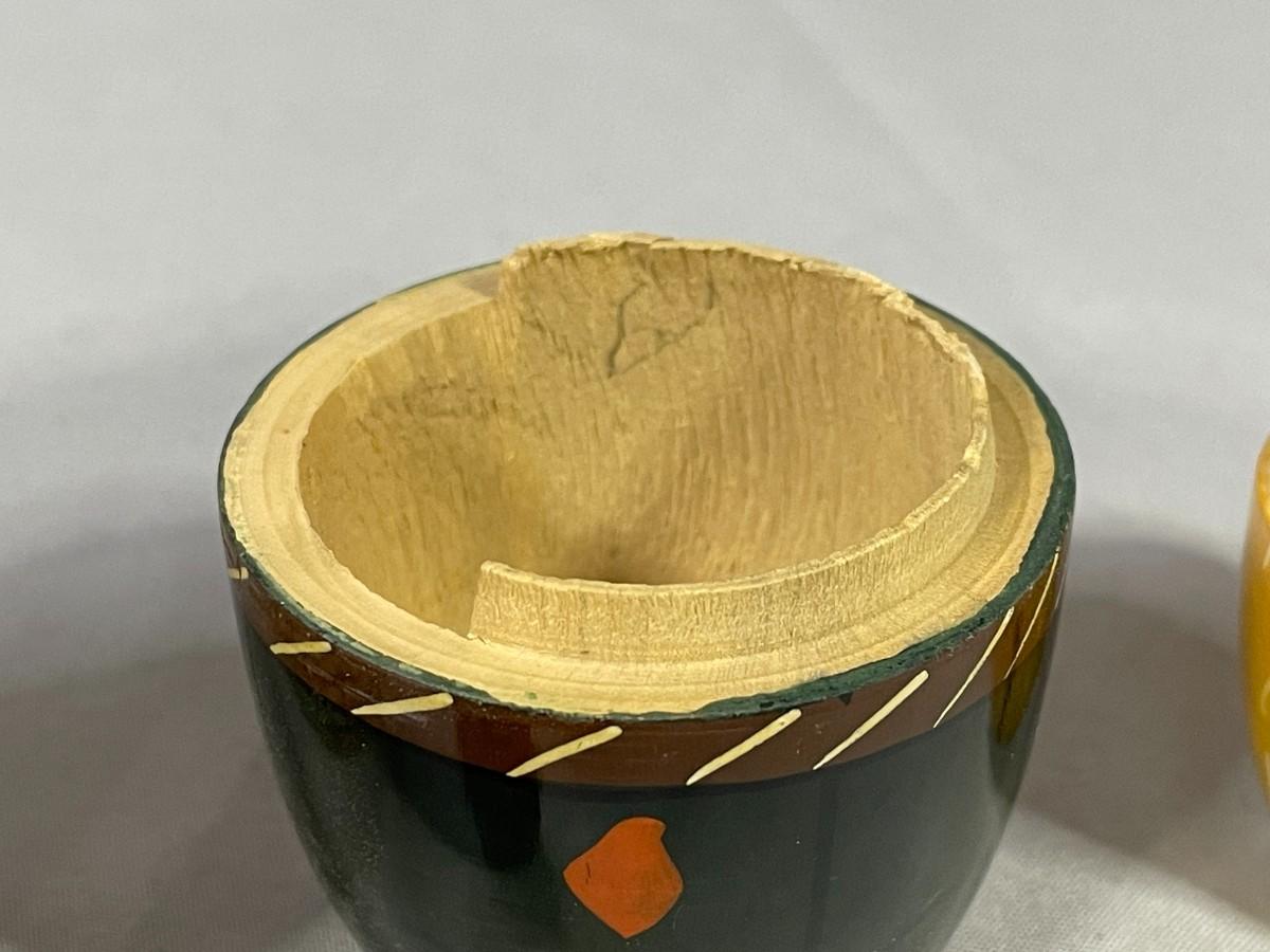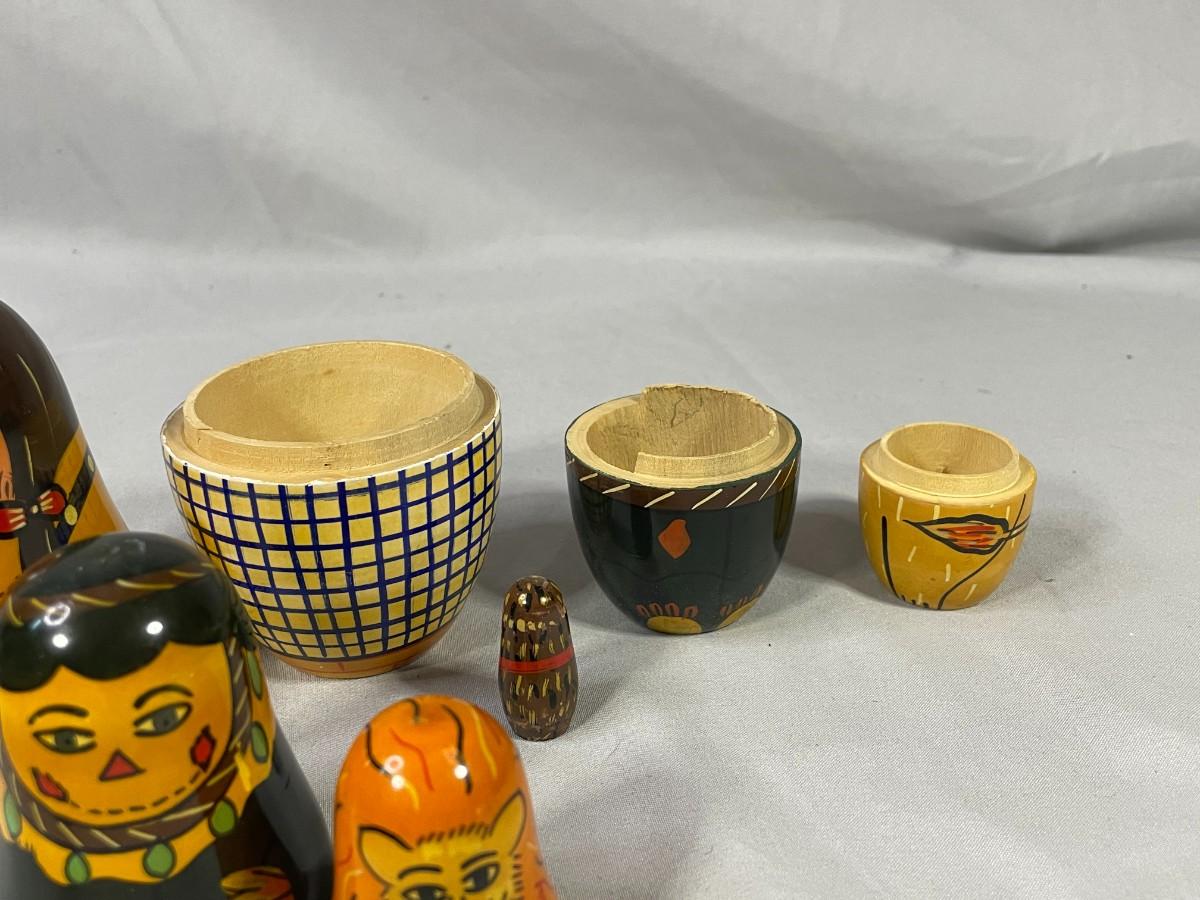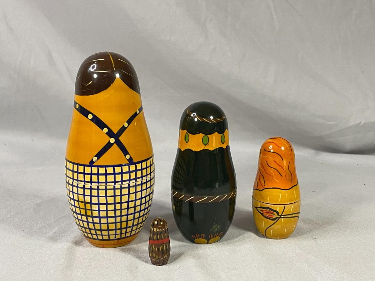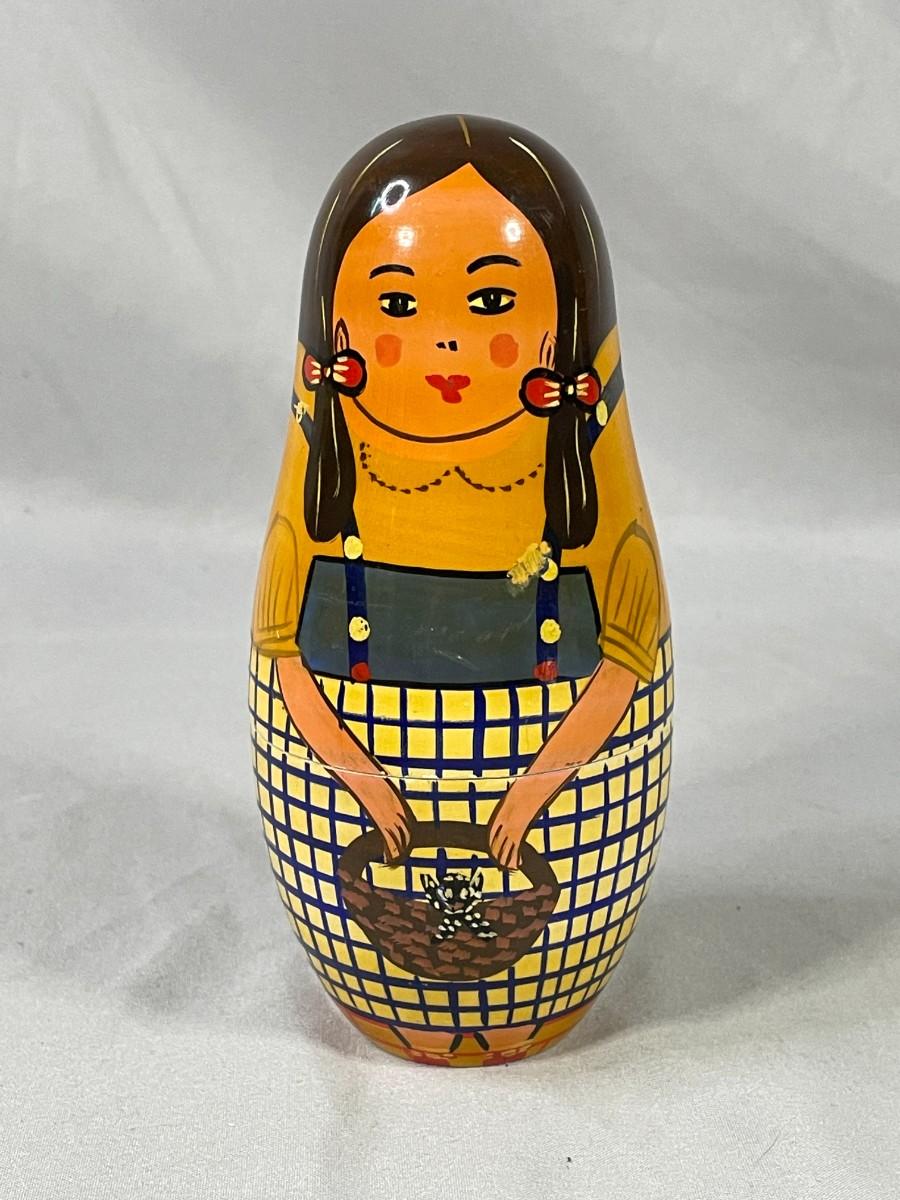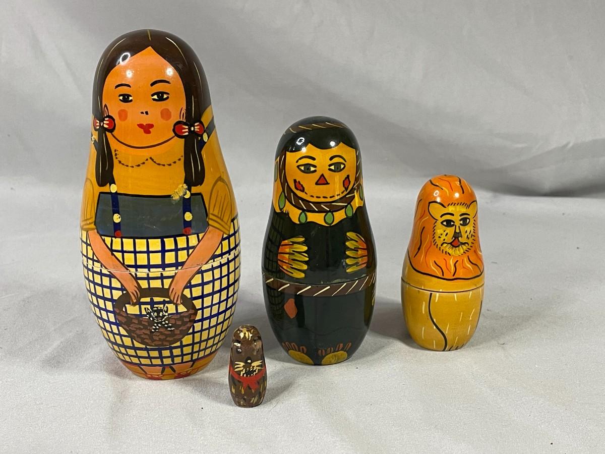 There are four dolls in this set (it is missing the Tin Man) with the only damage being a piece of wood being broken off on the second doll. It's only seen when the doll is open. The largest doll is abour 4.5" tall.