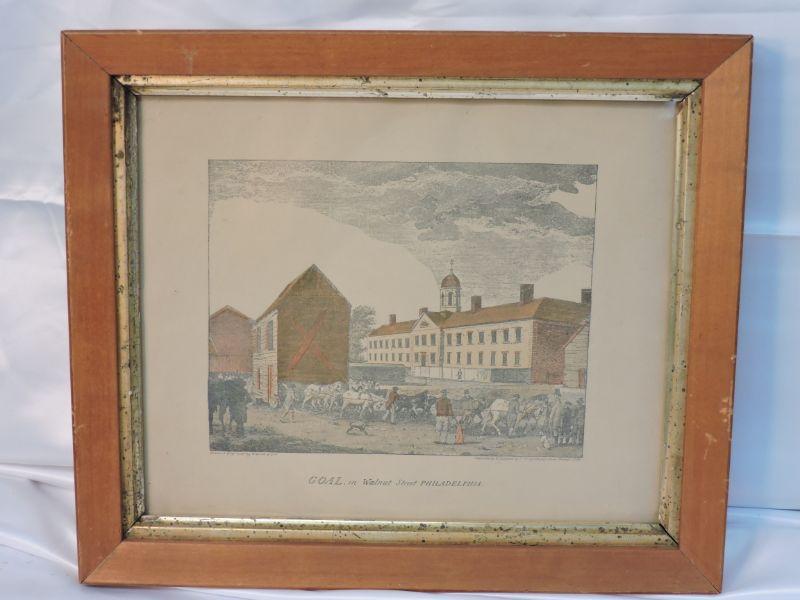 William Russell Birch & Son hand colored engraving "Goal in Walnut Street Philadelphia colored etching 1799. Published by R. Campbell & Co. Print-11x13" " Frame-16x19" **Please read Terms and Conditions before placing a bid. Pick up is by appoitment the following week in Mantua, New Jersey. Shipping is available at buyer's expense. All sales are final. All sales are as is, where is. Please review all photos. Any props included in photos are not included in listing. All measurements are approximate.