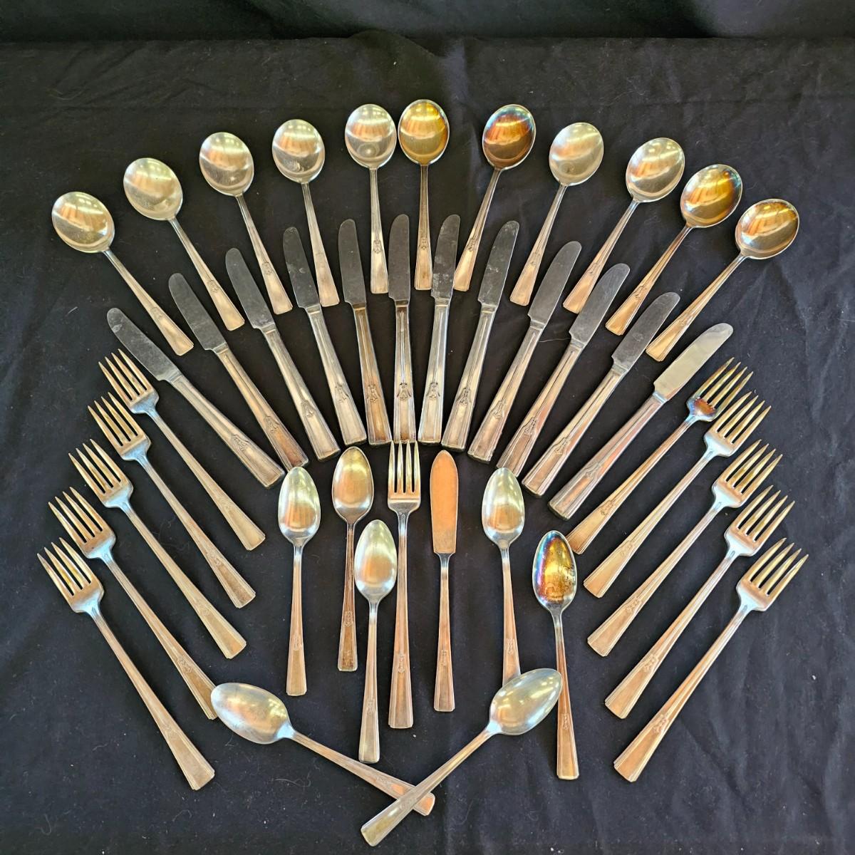 Forty-two pieces of Wm. Rogers flatware. The knives are all marked stainless, and the rest of the pieces are marked extra plate. Please see photos for details. Shipping available.