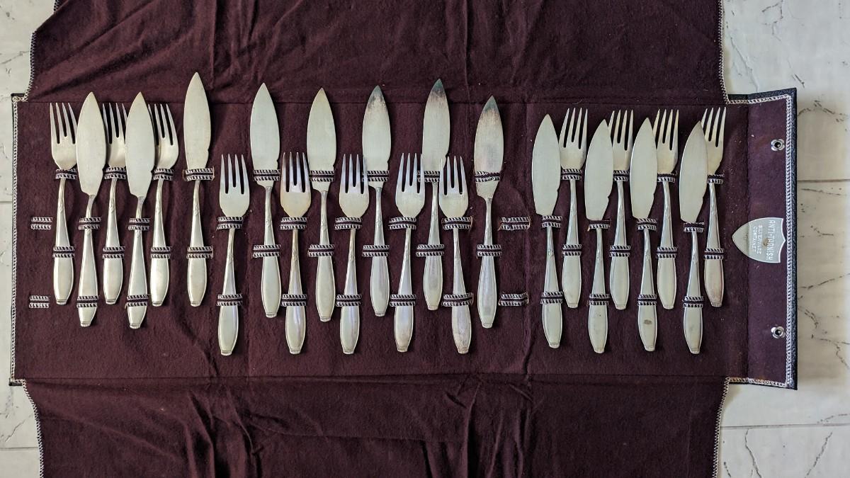 WMF Antique Art Nouveau Fish cutlery set Forks and knives for 12. Elegant quality Silverplate