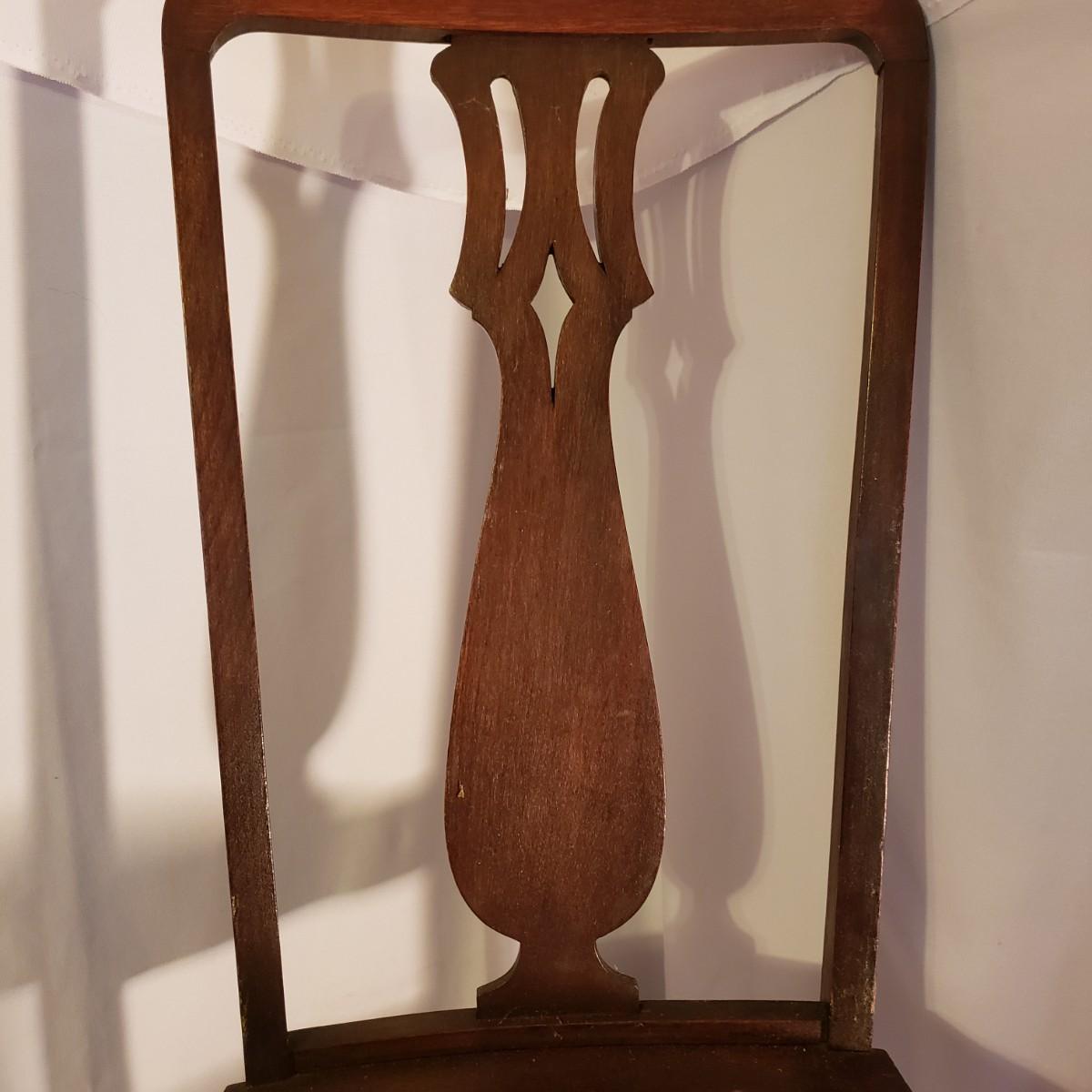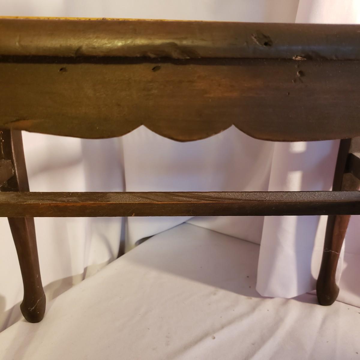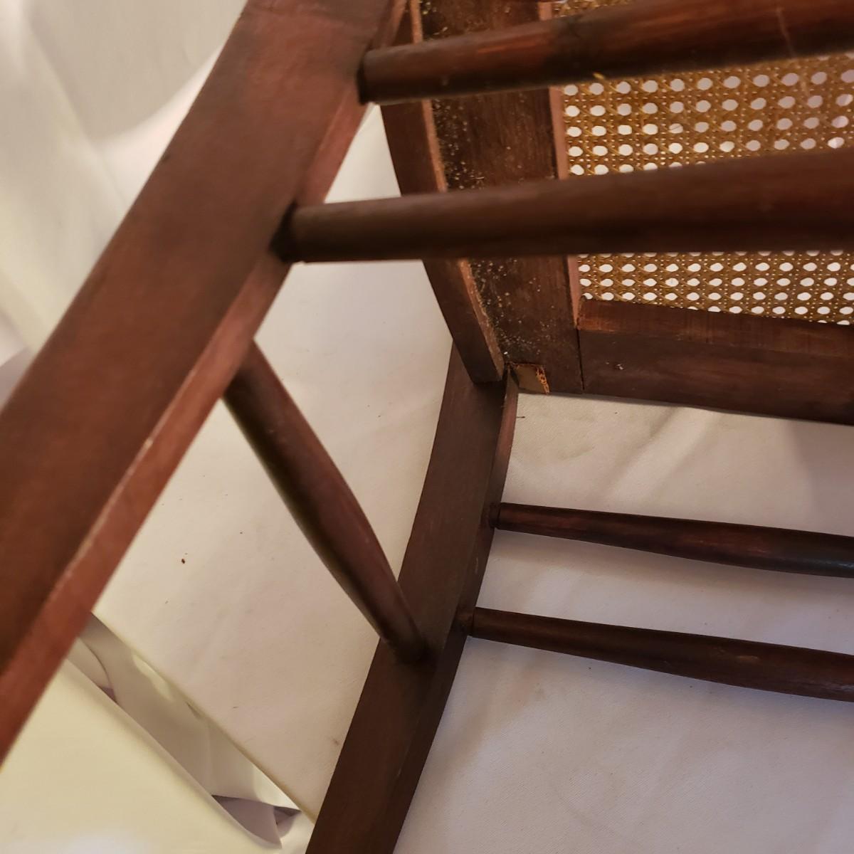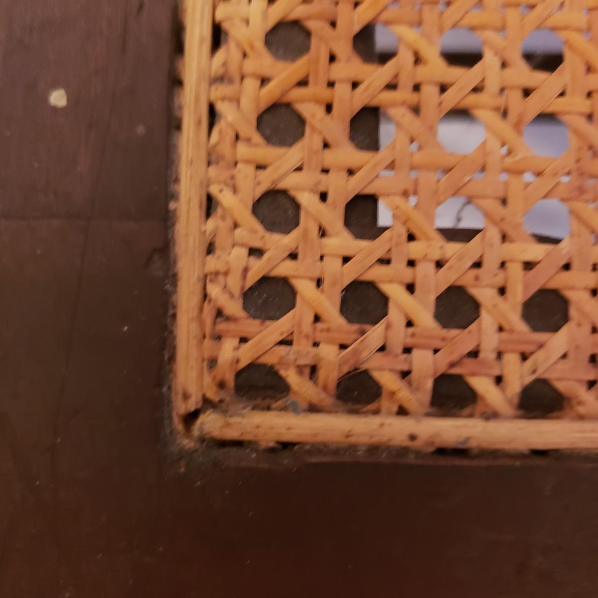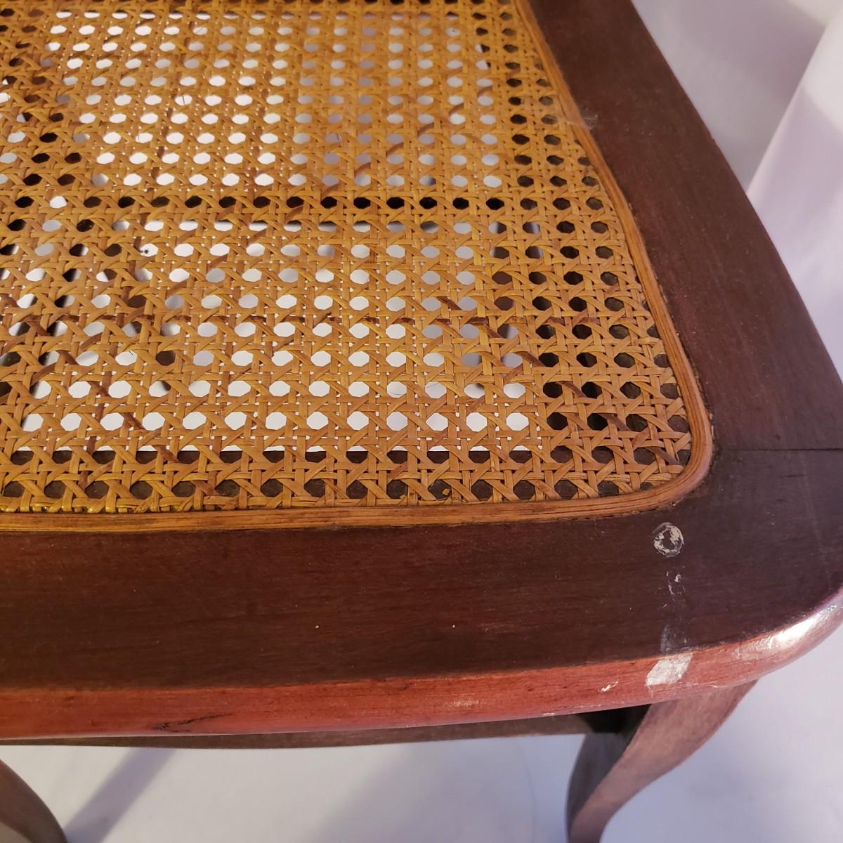 This lot features an antique wooden chair and wooden table with cain weaving. The chair measures approximately 16" x 16" x 36" H. The chair is a little wiggly to the touch but can withhold weight and looks like it can be tightened up with the screws or glue, see picture. The antique table measures approximately 22" x 14" x 18"H. The table also is slightly wiggly. Both pieces have some wear from age on the finish.