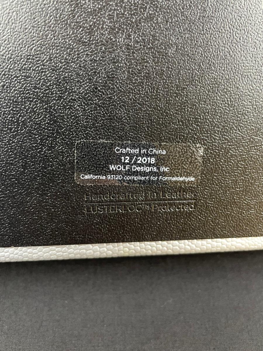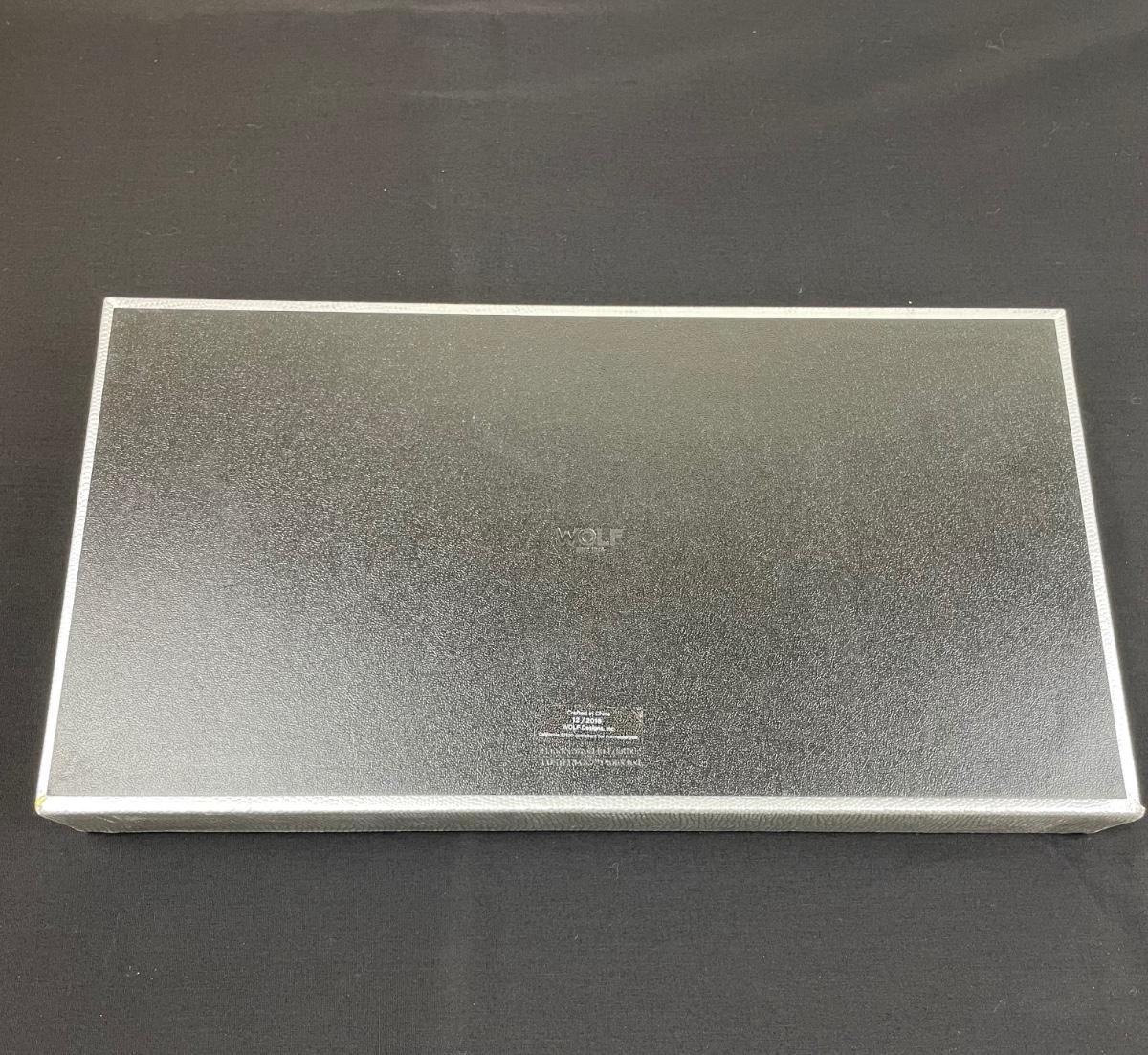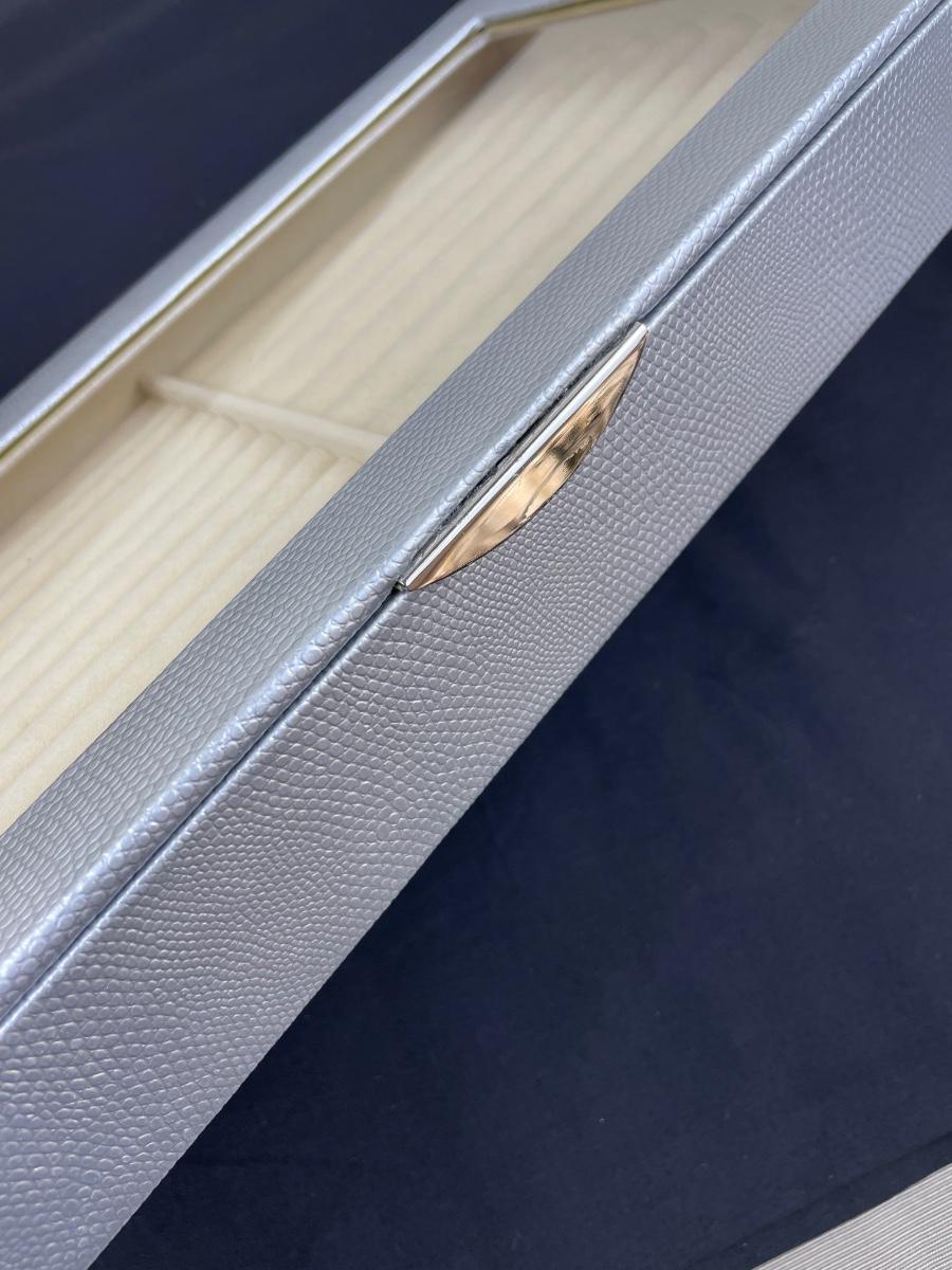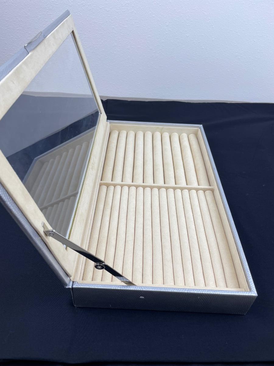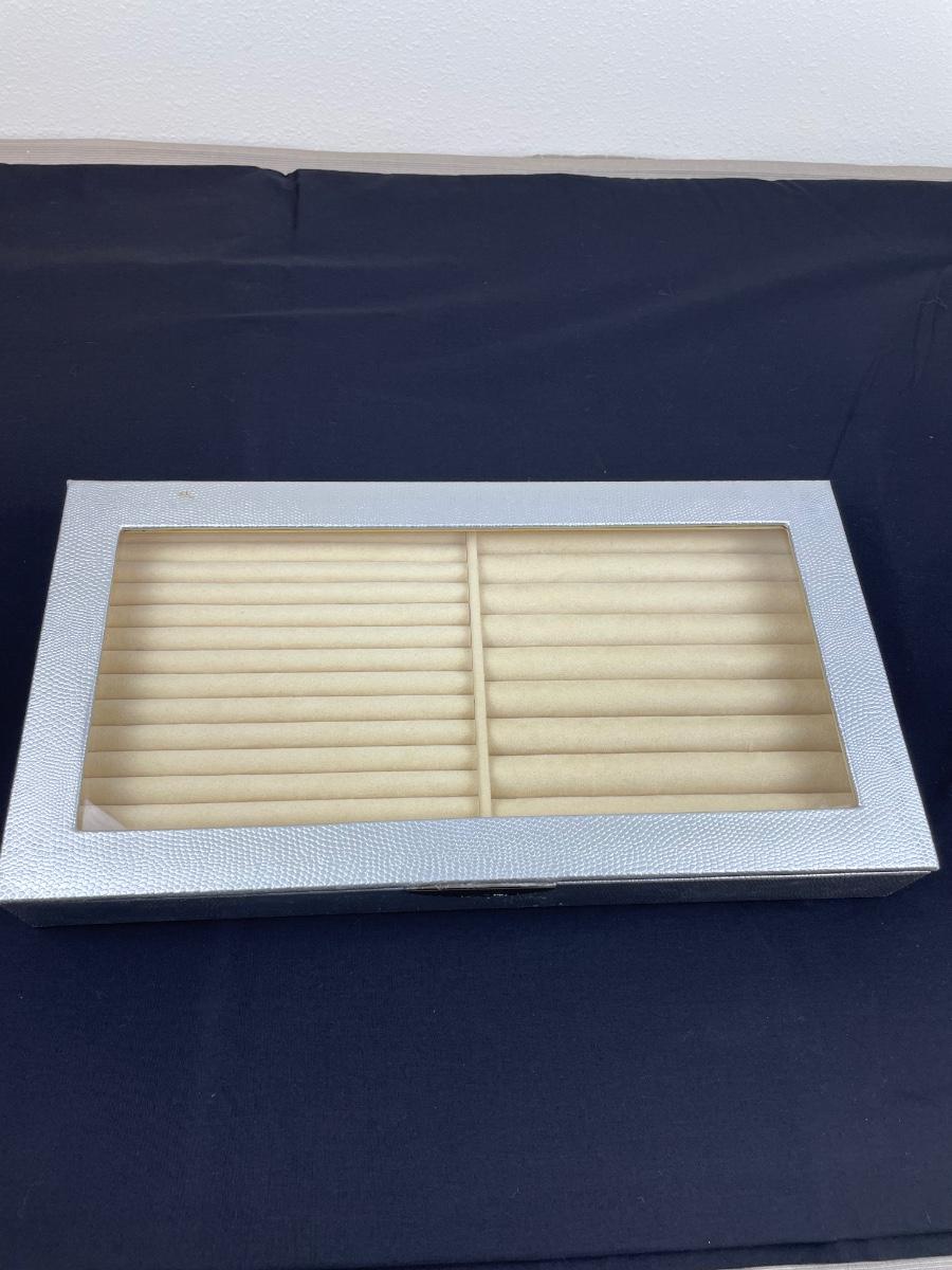Large leather ring storage tray with hinged lid. Measures 15 by 8 inches. Glass lid. Retails for $295