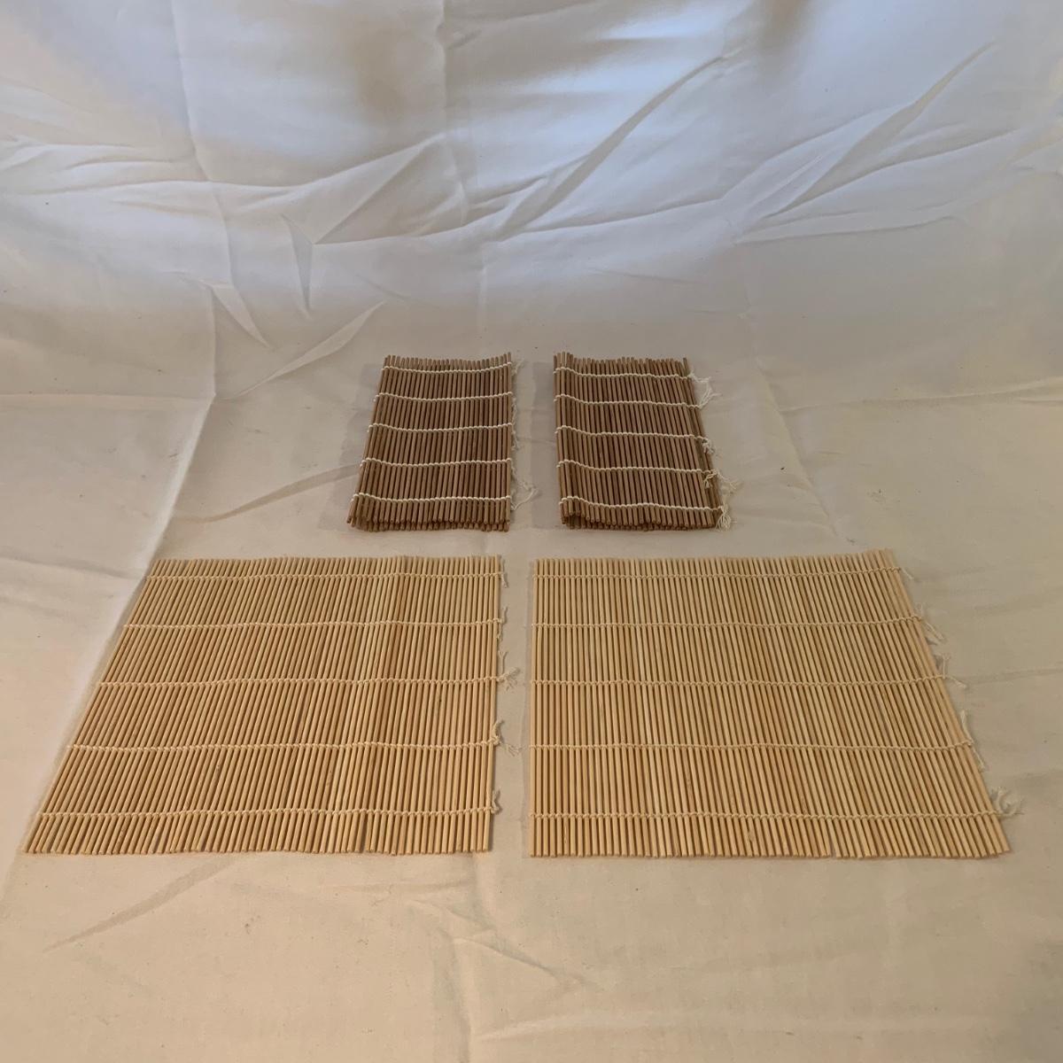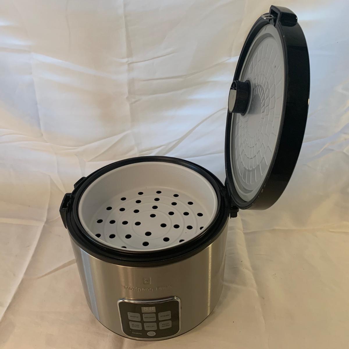 Wolfgang Puck 10 cup rice cooker with steamer basket, measuring cup, and rice pad. Lot also includes four sushi mats and a microwave rice cooker. Both cookers include manuals. Electric rice cooker powers on and the removable pot has minimal scratches. See photos for more details. Electric rice cooker measures, 11.5”D x 11.5”H.